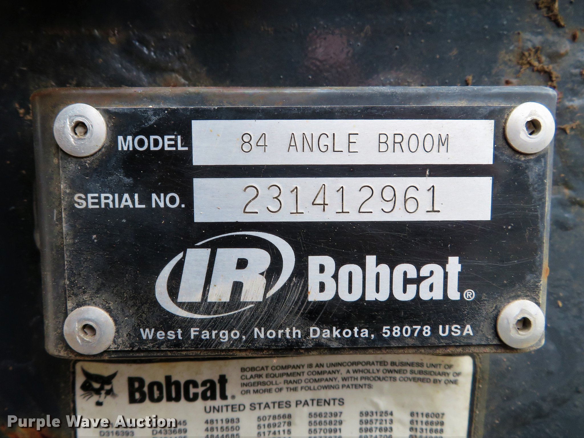 Bobcat 84 skid steer broom. 84"W, Poly broom bristles, Hydraulic angle cylinder disconnected, Serial 231412961, Unit# 10065. Erb Equipment Co.. 200 Erb Industrial Dr. Fenton, MO 63026