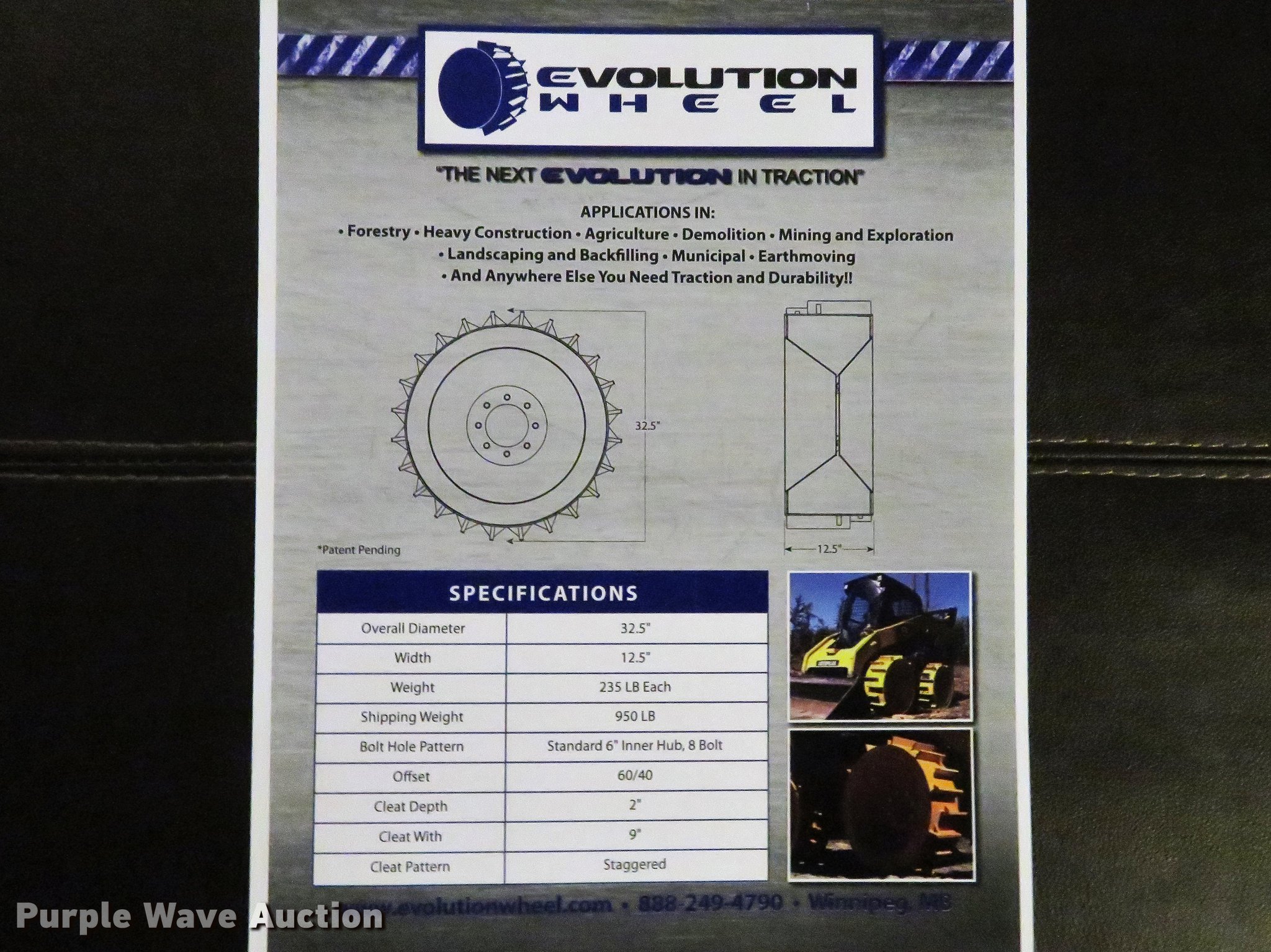Purple Wave is selling a used Industrial Tires or Tracks in Missouri. This item is a (4) Evolution skid steer wheels with the following: 32" diameter, 12.5"W, 235 lbs per wheel, Fits 12 x 16.5 tires, Unused, Unit# 96101