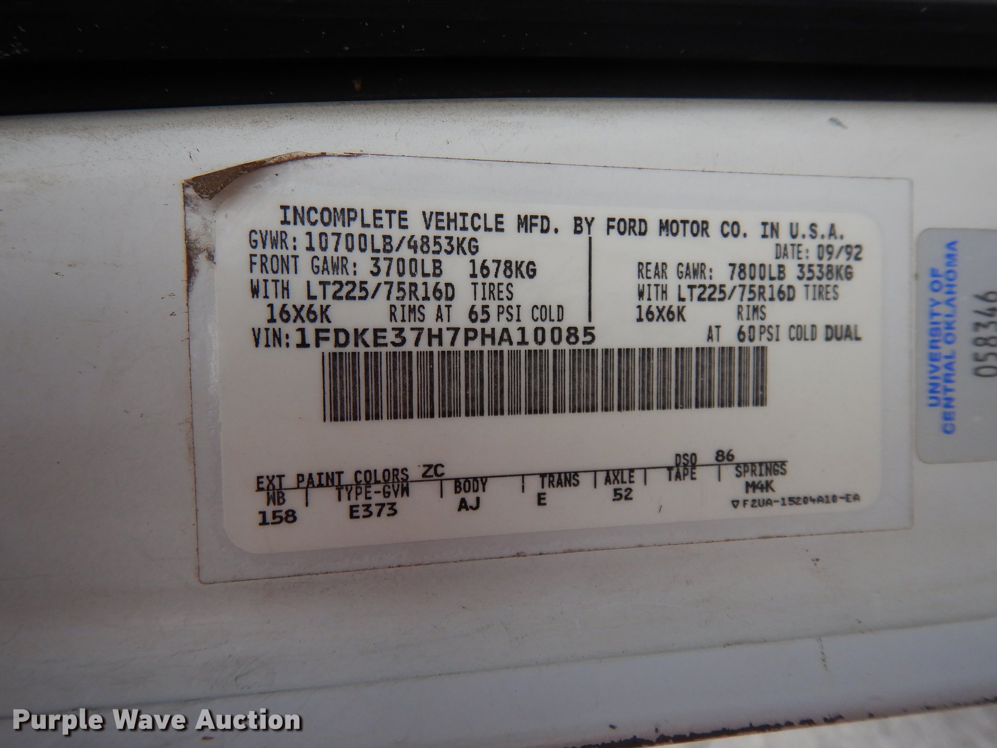 1993 Ford Econoline E350 box truck. 46,239 miles on odometer, 5.8L V8 OHV 16V gas engine 210 HP, Automatic transmission, Single axle, AC and heat, AM/FM, Supreme box bed 14'L x 7'W, Wood floor, Roll up rear door, Tommy Lift 89SAB end gate lift Serial M16-26964, Single fuel tank, Spring suspension, Hydraulic brakes, 225/75R16 tires. Oklahoma title. Seller is a government entity who will be assigning and distributing the title. Please contact the seller for distribution questions. 1FDKE37H7PHA10085. University of Central Oklahoma. 100 N University Dr. Edmond, OK 73034