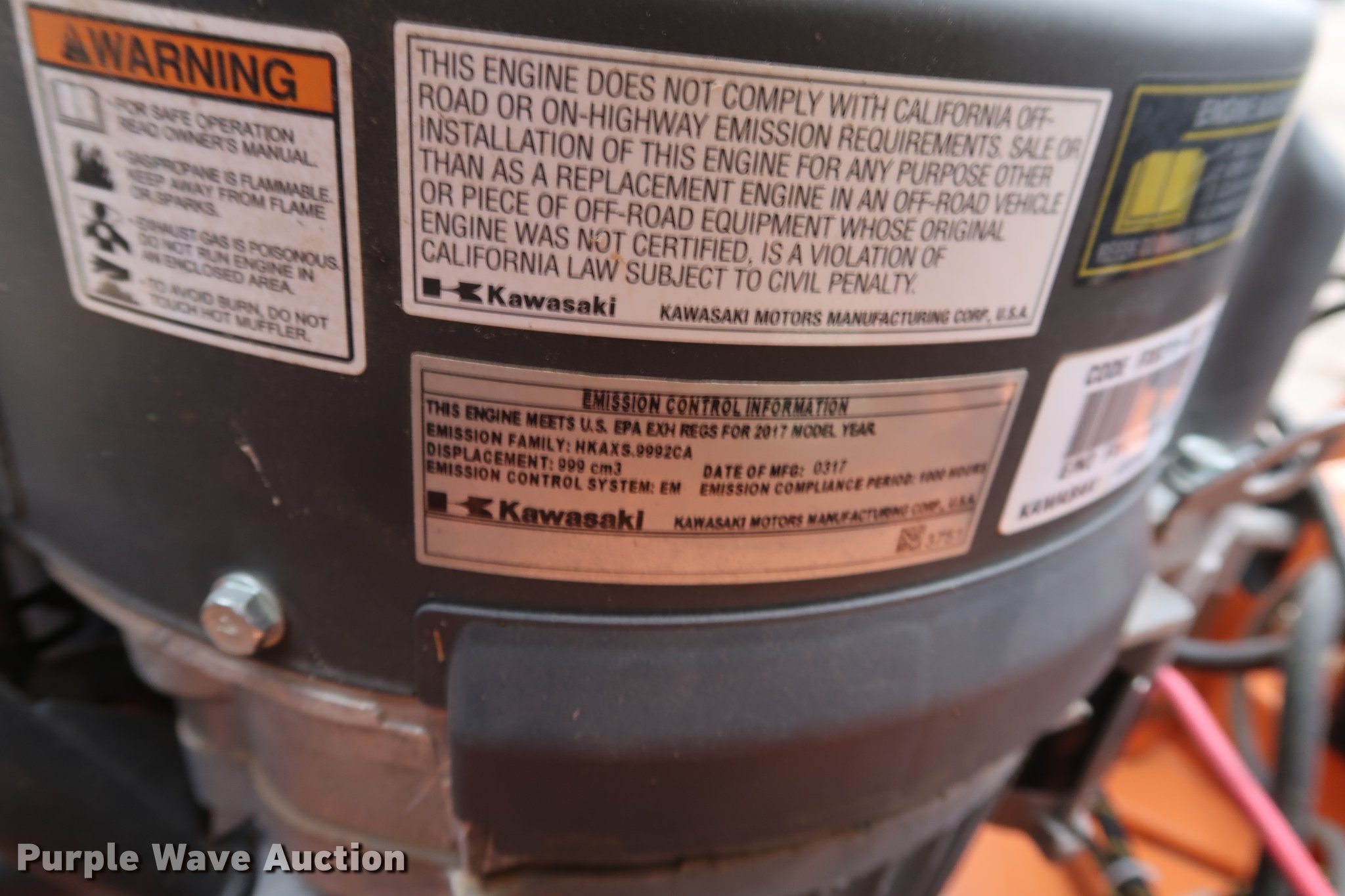 Purple Wave is selling a used Commercial Turf Mower in Oklahoma. This item is a 2017 Scag Cheetah SCZ72V-31FX ZTR lawn mower with the following: 188 hours on meter, 72" cut, Kawasaki FX921V 999cc two cylinder gas engine, 31 HP, Hydrostatic transmission, ROPS, Adjustable suspension seat, Velocity Plus deck, Tiger Eye advanced monitoring system, 13x6.50-6/4.50 front tires, 24x12.00-12 rear tires, Serial L7100206, Unit# 3