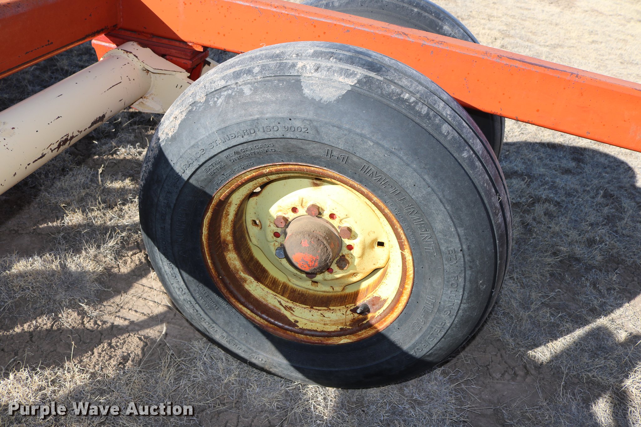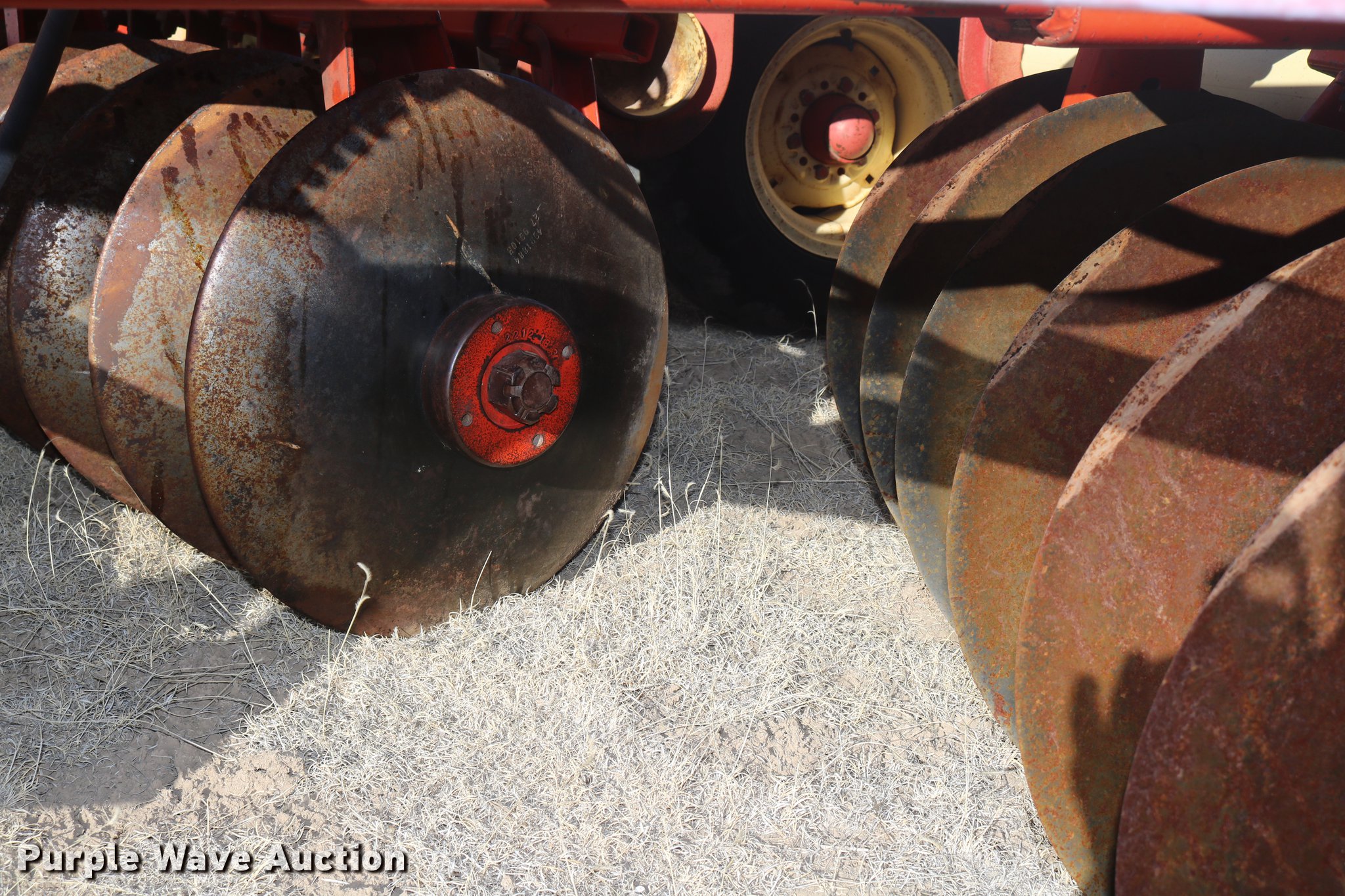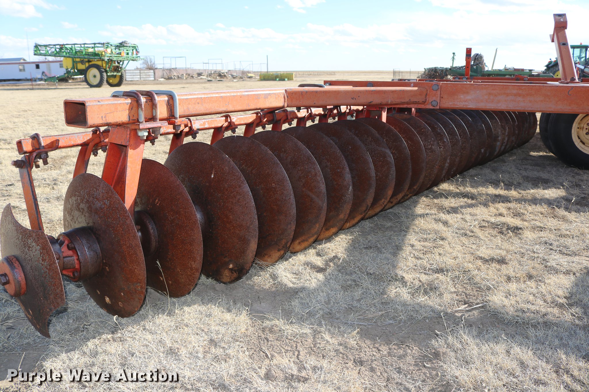 Purple Wave is selling a used Disk in Colorado. This item is a 1973 Krause 1950 double off-set disk with the following: 35'W overall, 9" spacing, Disk scrapers, Hydraulic leveler, Hydraulic lift and fold, Slab hitch, Walking tandem axle, 11L-15 tires, Frame welds, Serial 2433