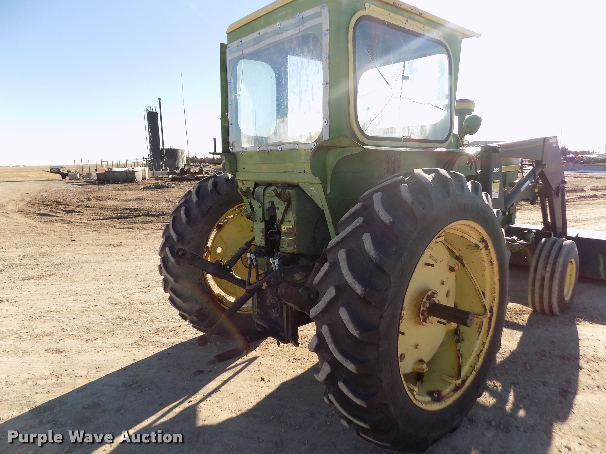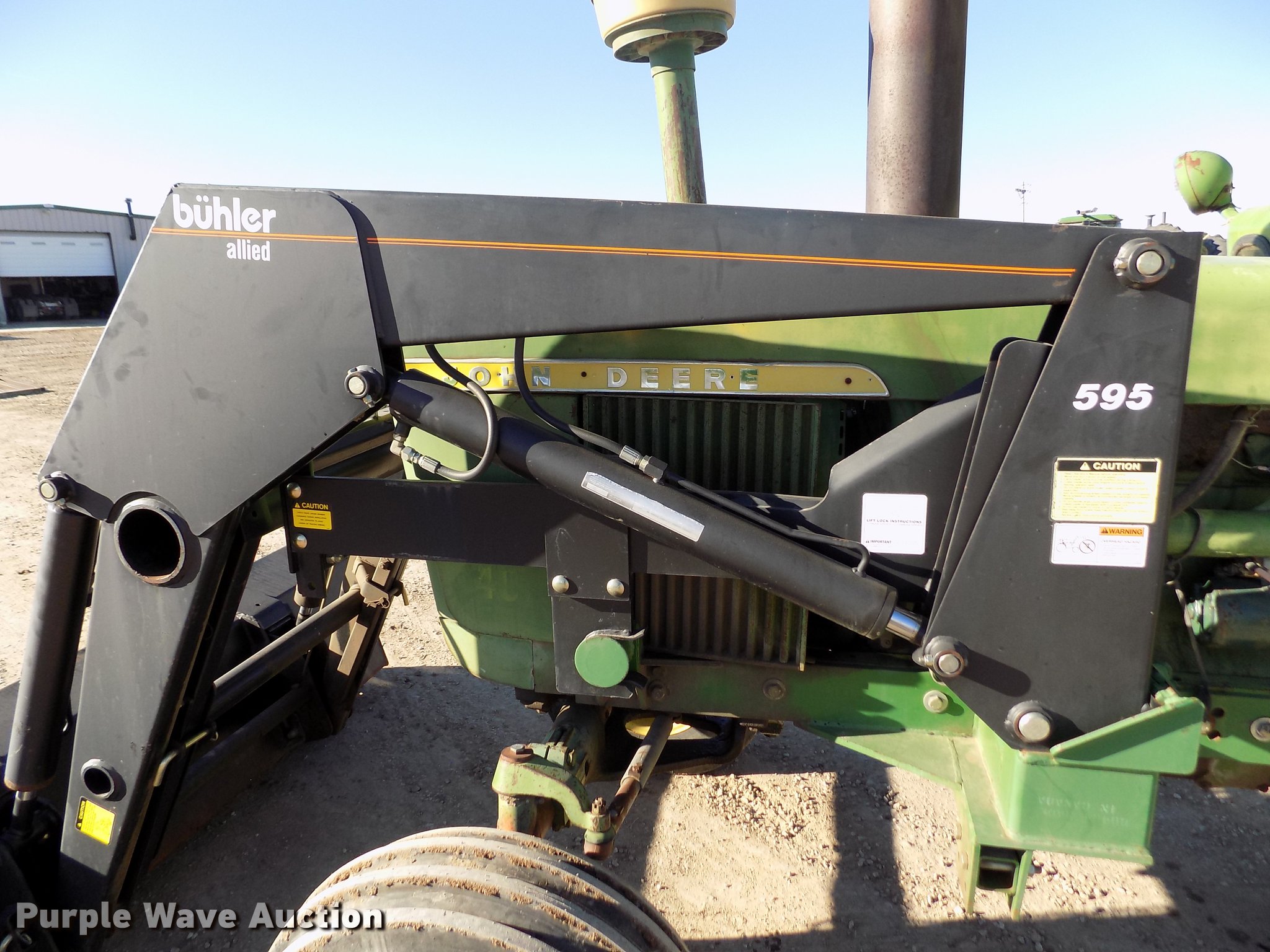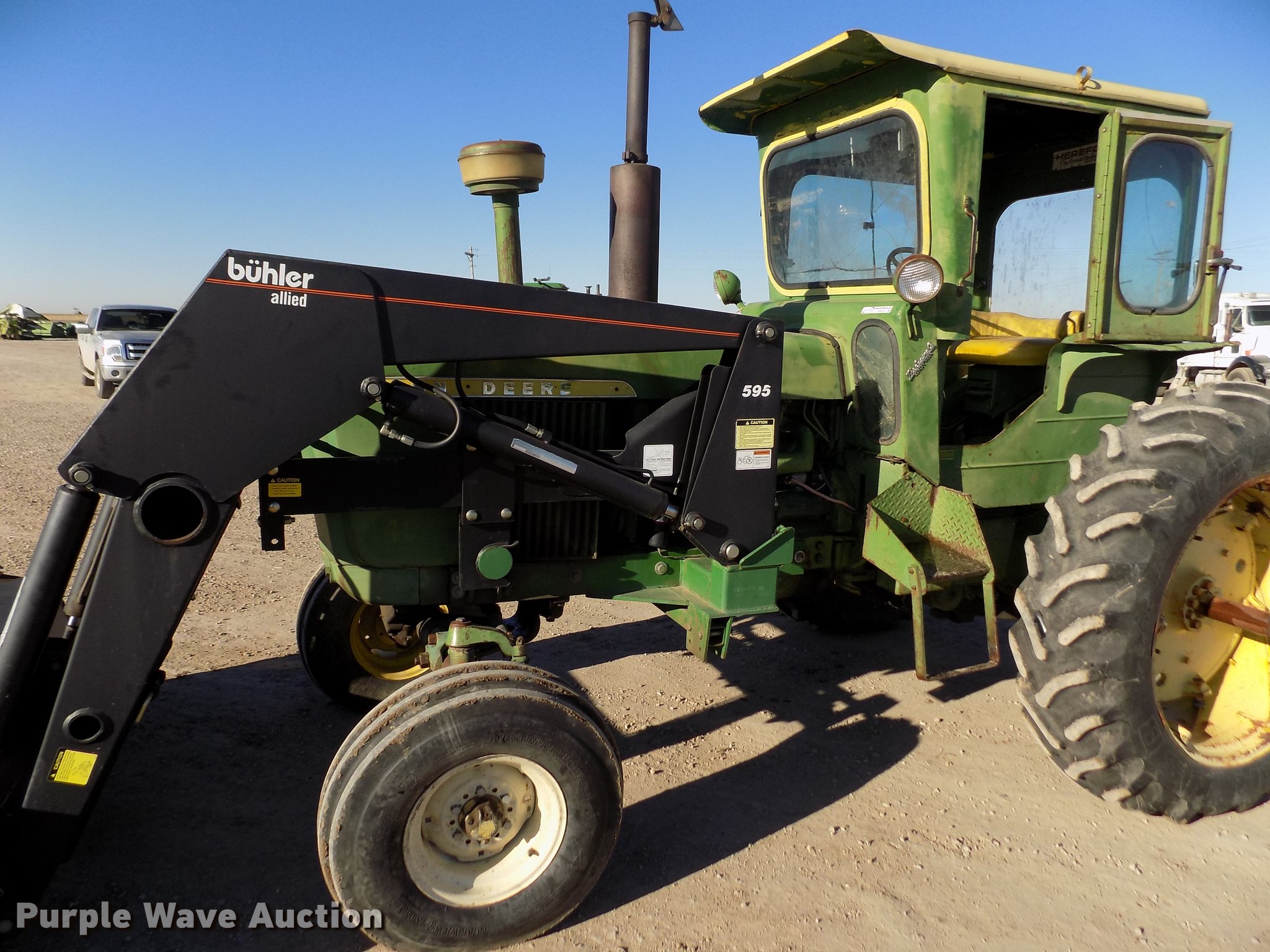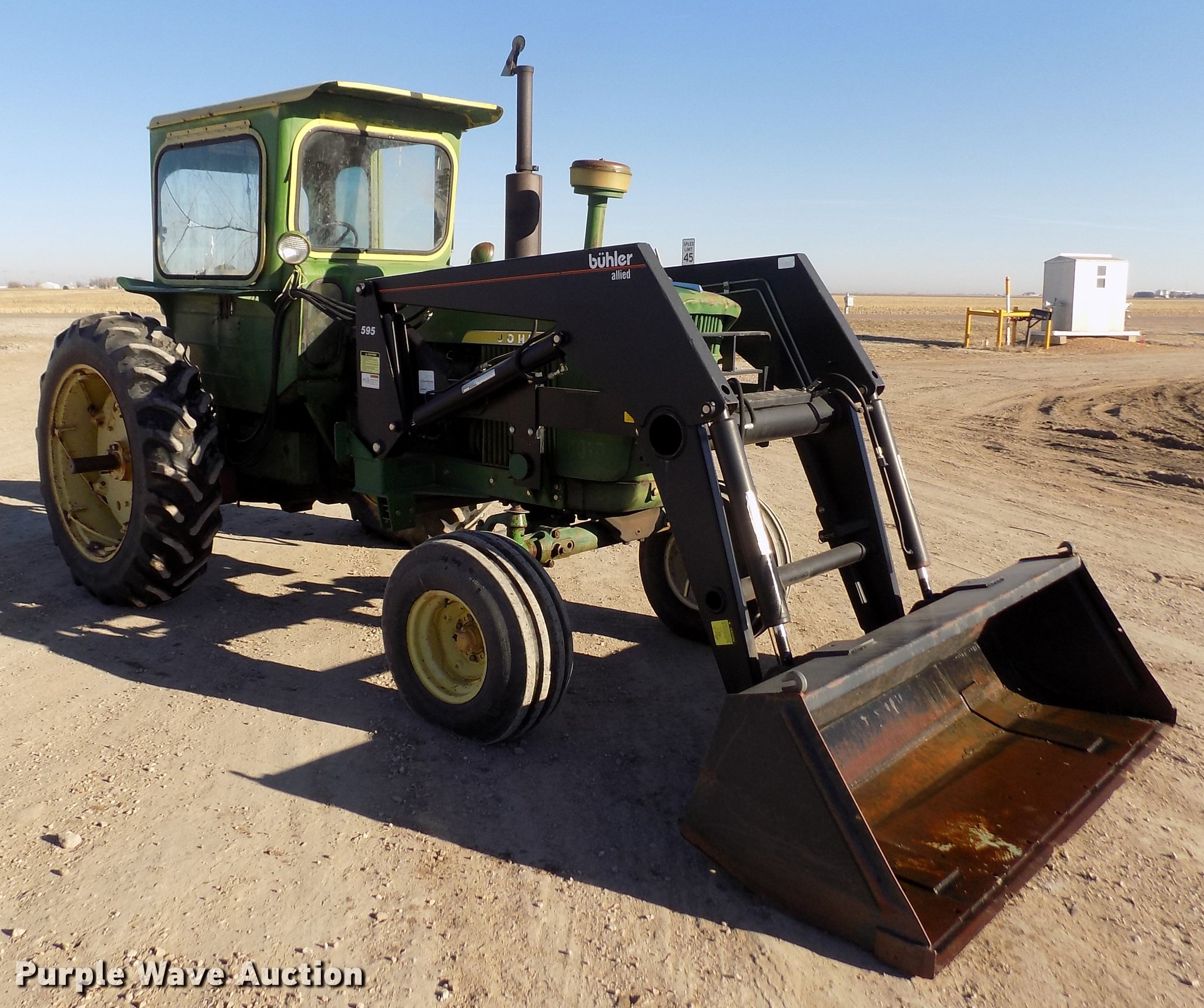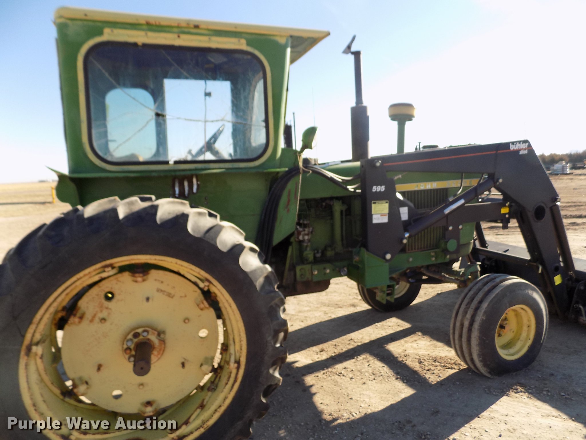 Purple Wave is selling a used Tractor in Kansas. This item is a 1963 John Deere 4010 tractor with the following: 5,901 hours on meter, John Deere 6.2L six cylinder diesel engine, 80 HP, Synchro transmission, 8F-3R gears, Egging Co. enclosed cab, Suspension seat, Block heater, Grill guard, Buhler 595 loader, 84"W bucket, Quick attach, Two-lever controls, Serial 20025950227, Three point, Top link, 540 PTO, (2) rear hydraulic remote sets, 11L-15 front tires, 15.5-38 rear tires, Cracked windows, Serial 21T51497