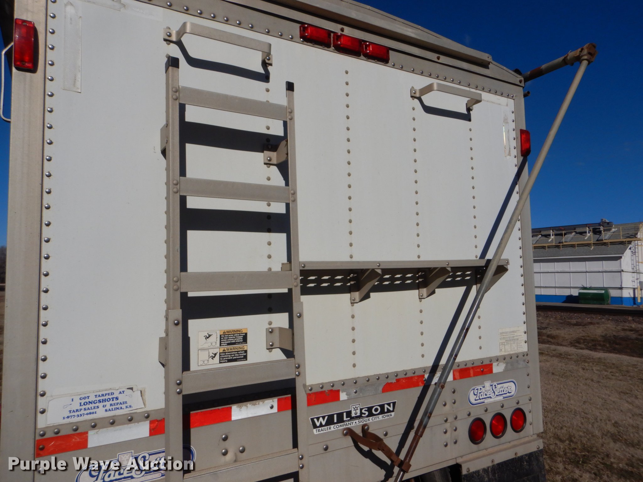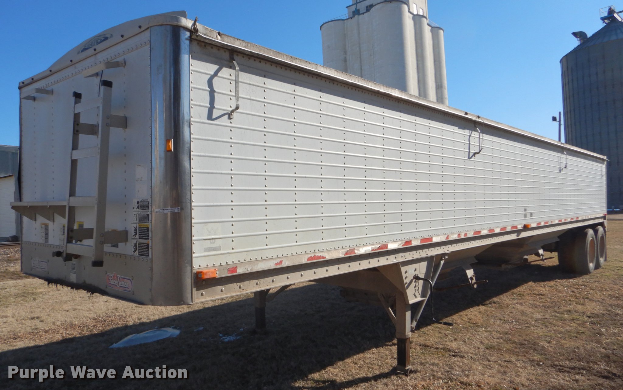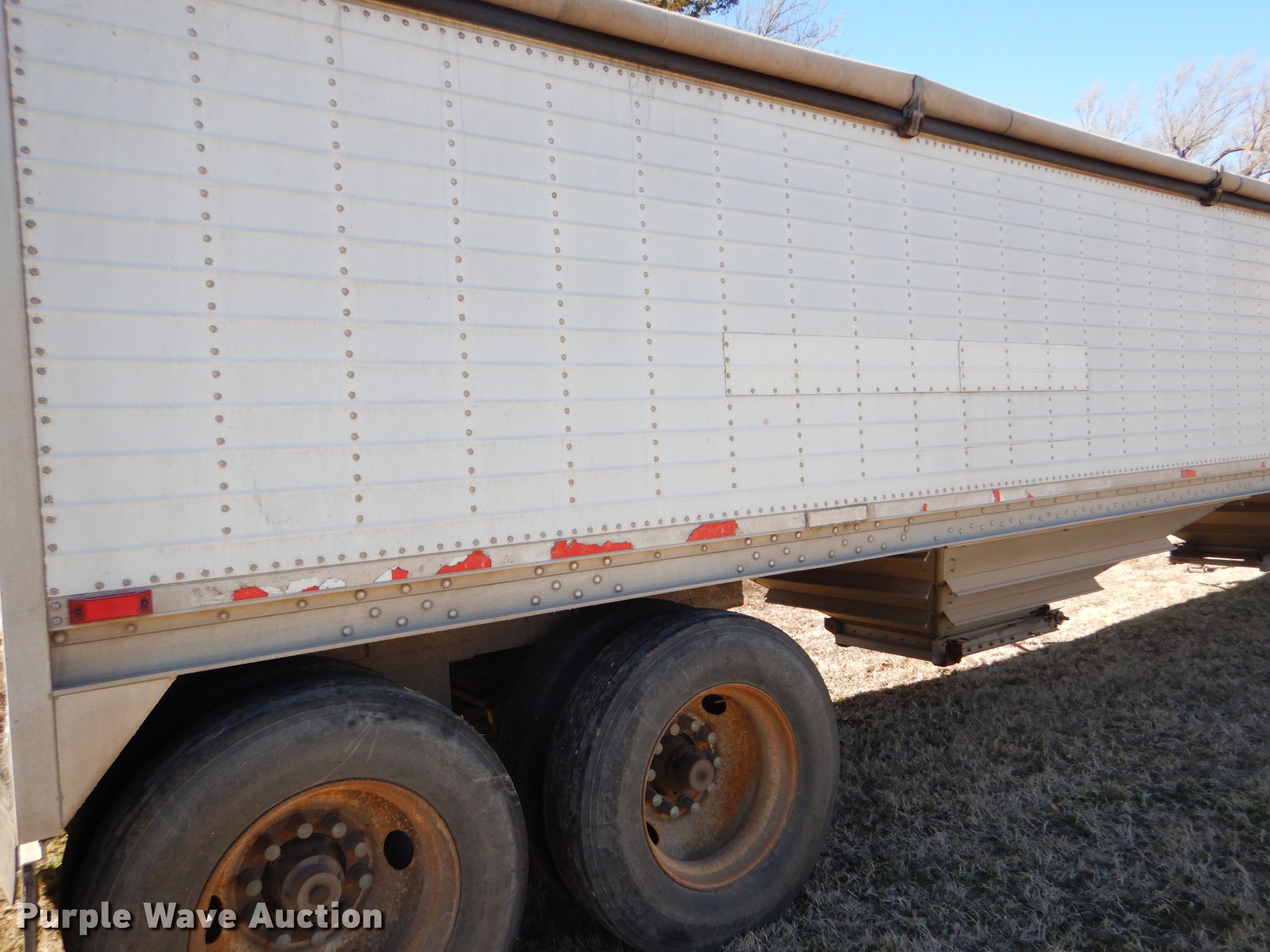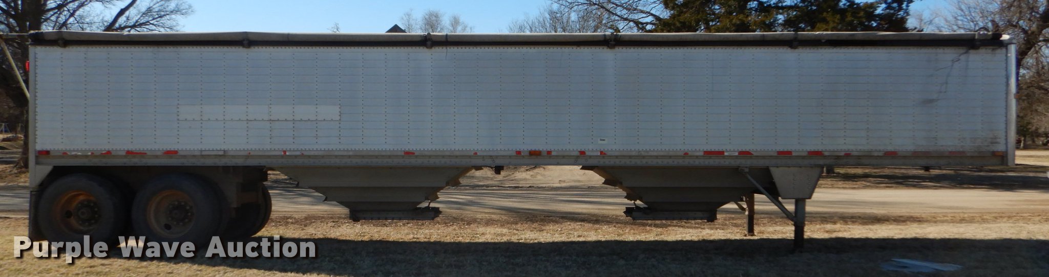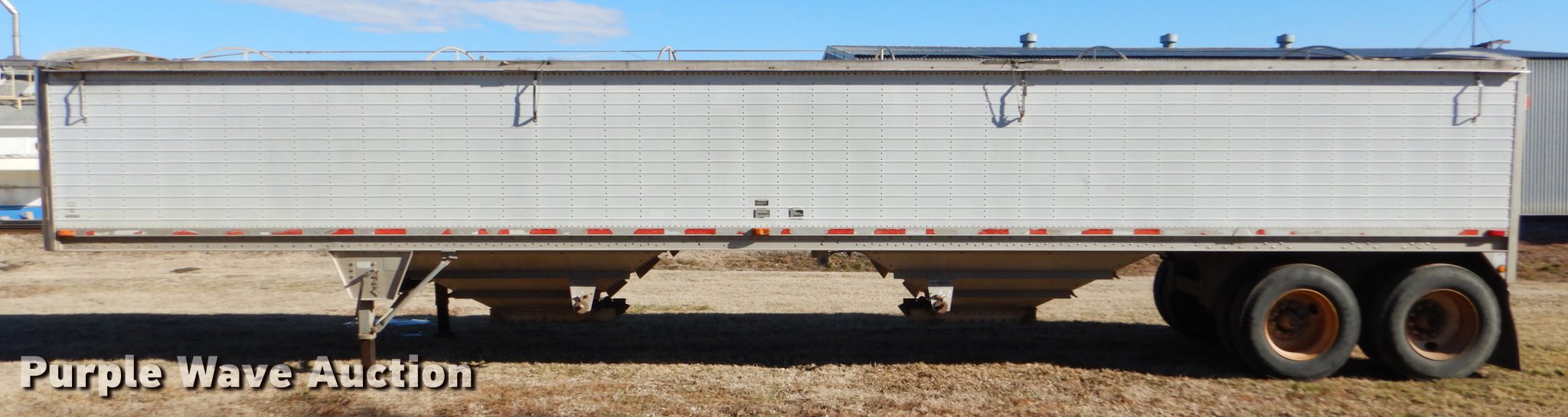 Purple Wave is selling a used Grain or Commodity Trailer in Kansas. This item is a 2000 Wilson Pace Setter double hopper bottom grain trailer with the following: 43'L x 96"W, Manual trap gates, Front and rear ladders, Front and rear platforms, Roll tarp, Aluminum construction, Fifth wheel plate, Dual leg landing gear, Air suspension, Air brakes, Tandem axle, Steel wheels, 11R24.5 tires, GVWR 65,000 lbs, Cracked sub-frame, Frame above air bags is weak, beginning to fail