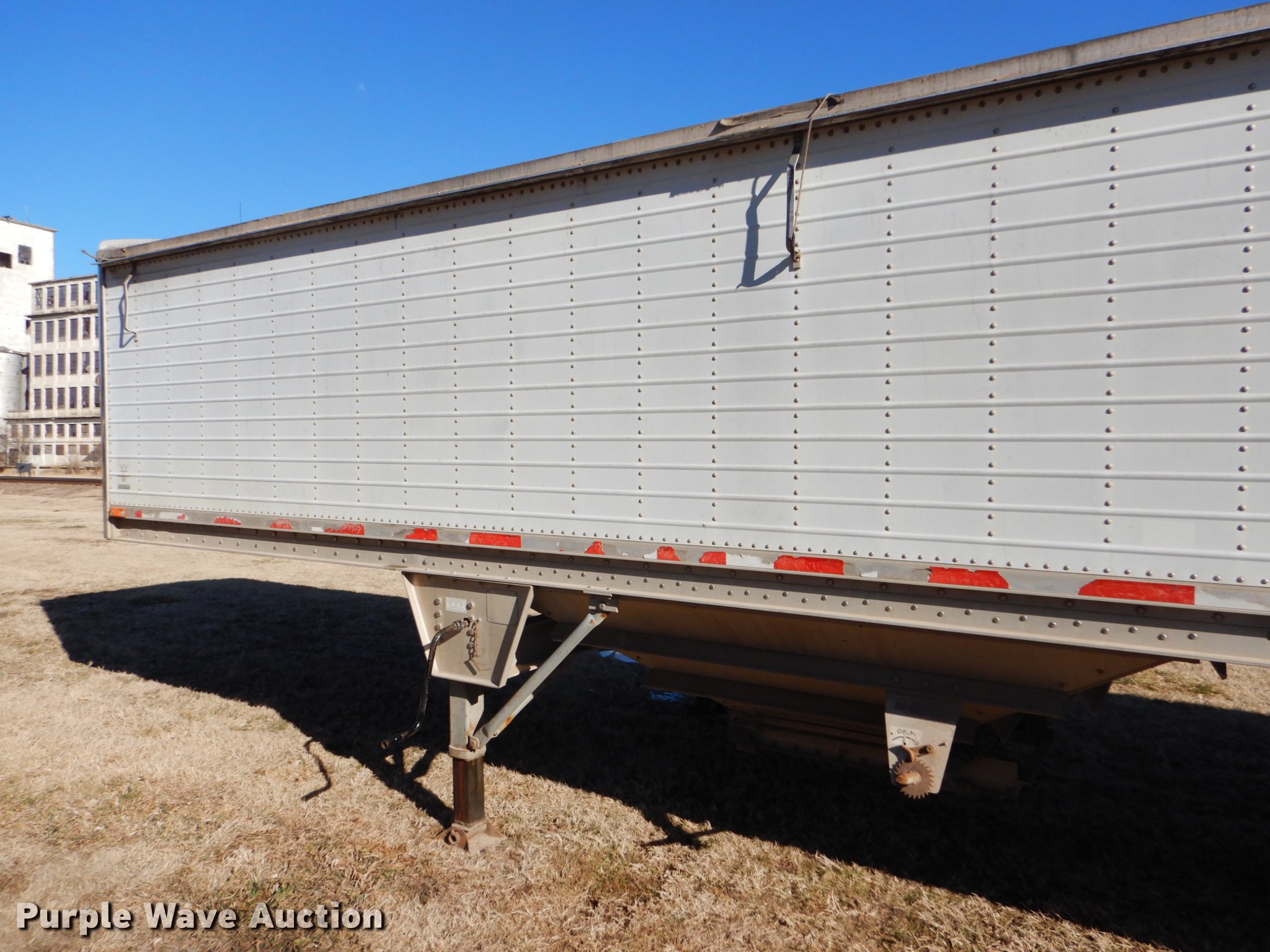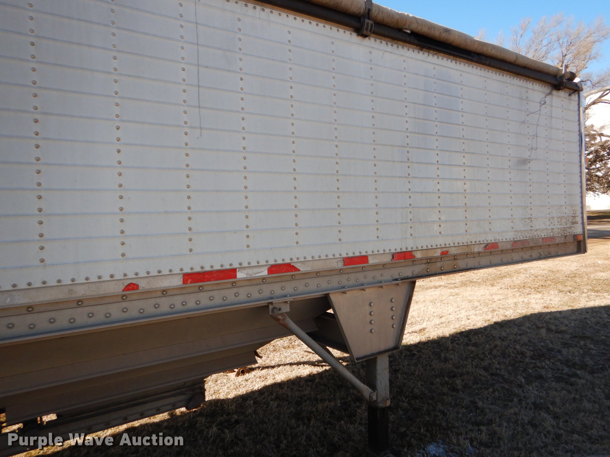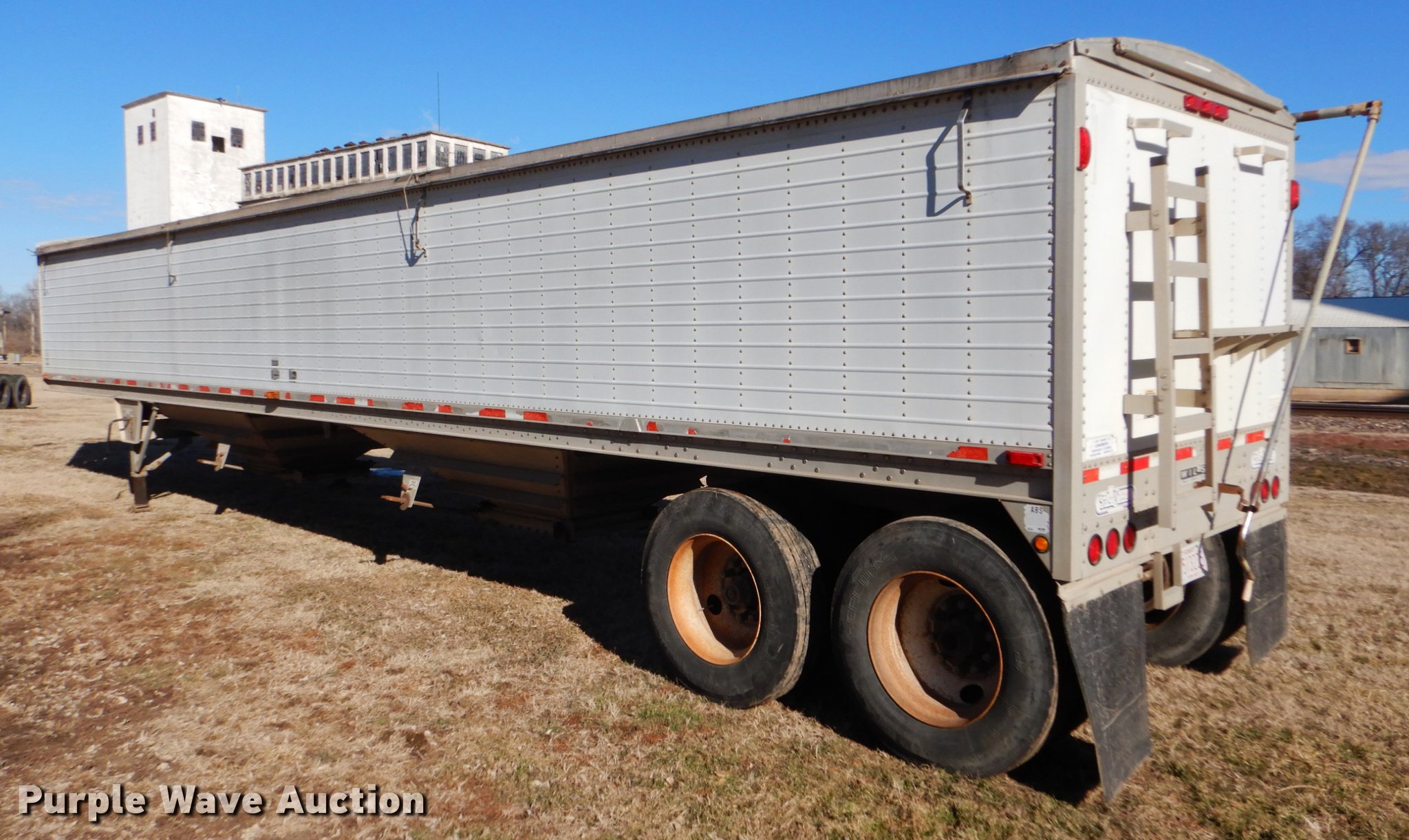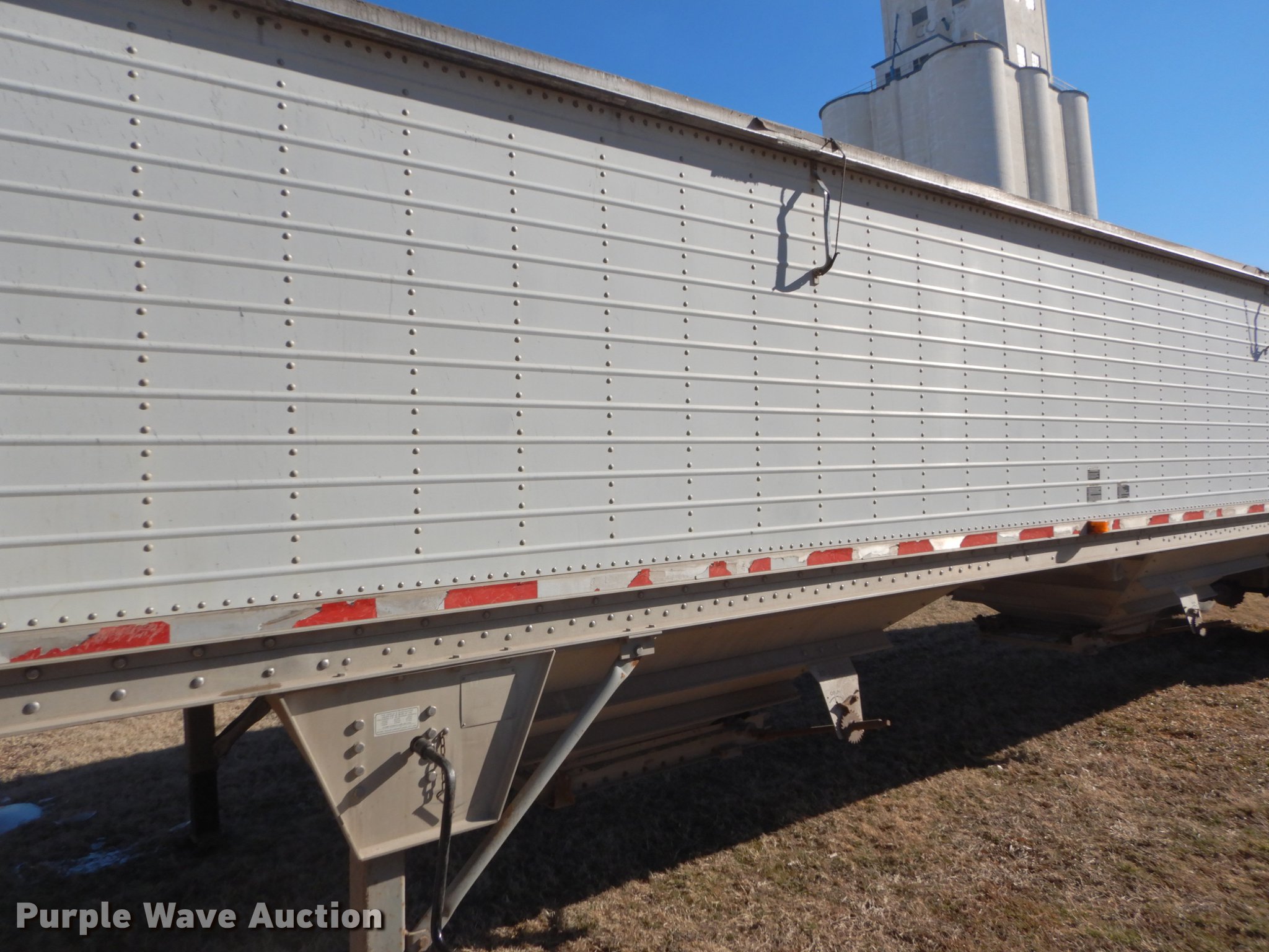 Purple Wave is selling a used Grain or Commodity Trailer in Kansas. This item is a 2000 Wilson Pace Setter double hopper bottom grain trailer with the following: 43'L x 96"W, Manual trap gates, Front and rear ladders, Front and rear platforms, Roll tarp, Aluminum construction, Fifth wheel plate, Dual leg landing gear, Air suspension, Air brakes, Tandem axle, Steel wheels, 11R24.5 tires, GVWR 65,000 lbs, Cracked sub-frame, Frame above air bags is weak, beginning to fail