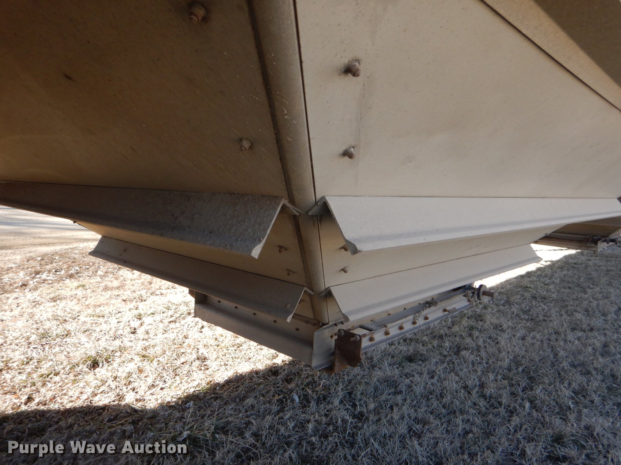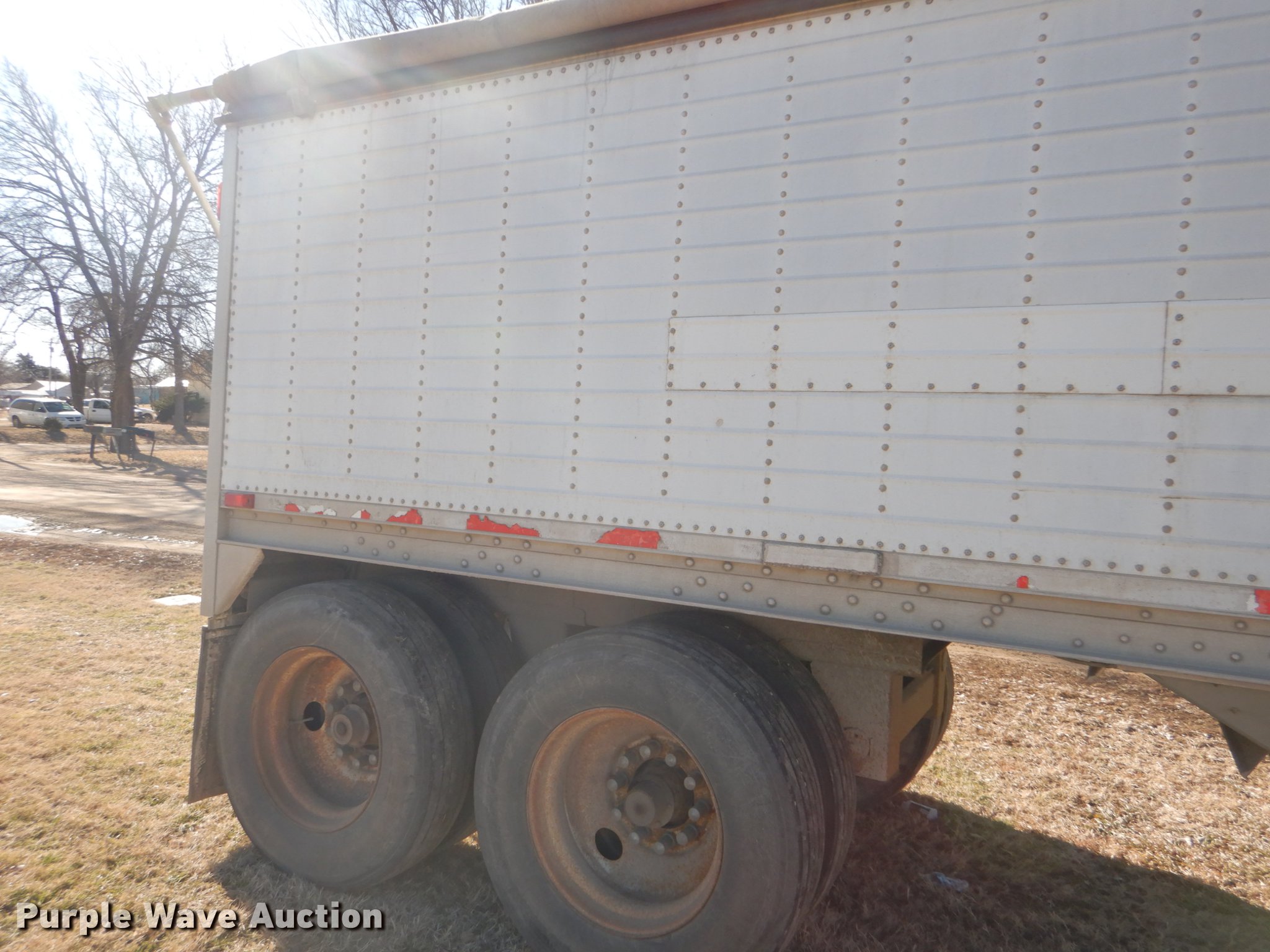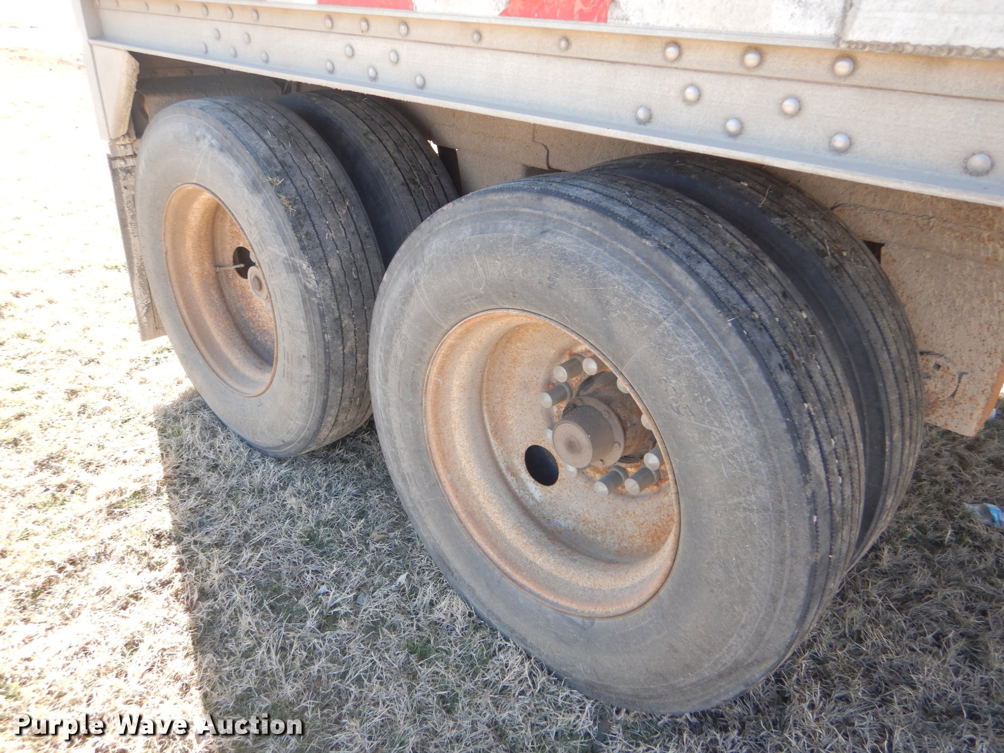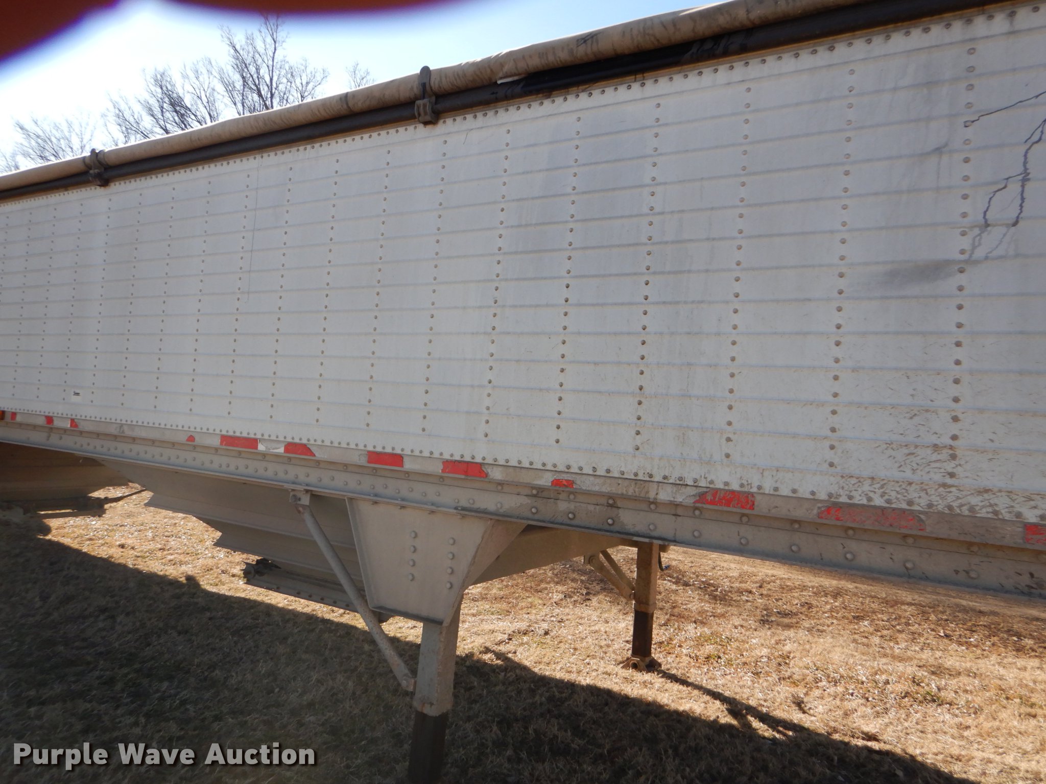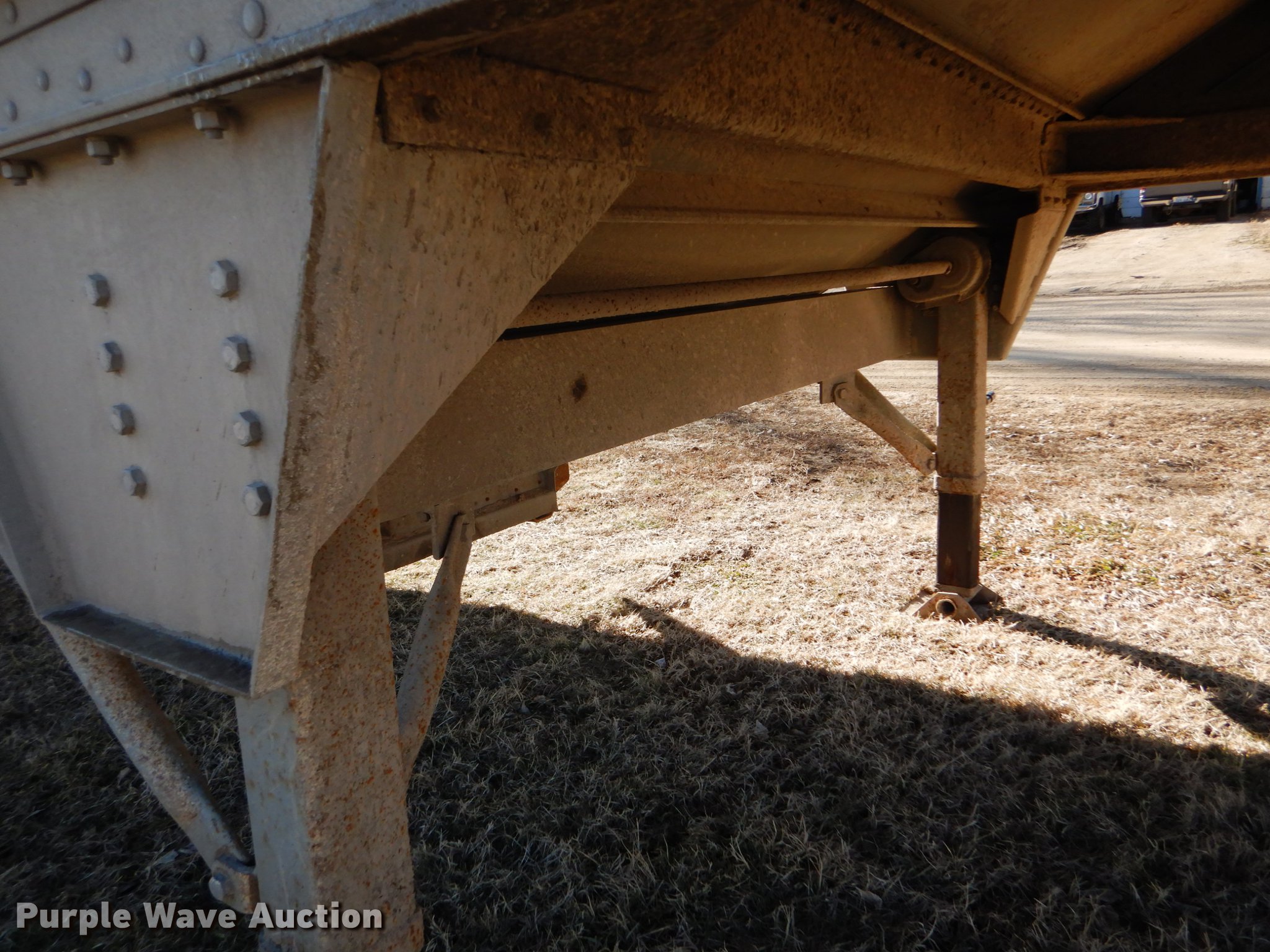Purple Wave is selling a used Grain or Commodity Trailer in Kansas. This item is a 2000 Wilson Pace Setter double hopper bottom grain trailer with the following: 43'L x 96"W, Manual trap gates, Front and rear ladders, Front and rear platforms, Roll tarp, Aluminum construction, Fifth wheel plate, Dual leg landing gear, Air suspension, Air brakes, Tandem axle, Steel wheels, 11R24.5 tires, GVWR 65,000 lbs, Cracked sub-frame, Frame above air bags is weak, beginning to fail