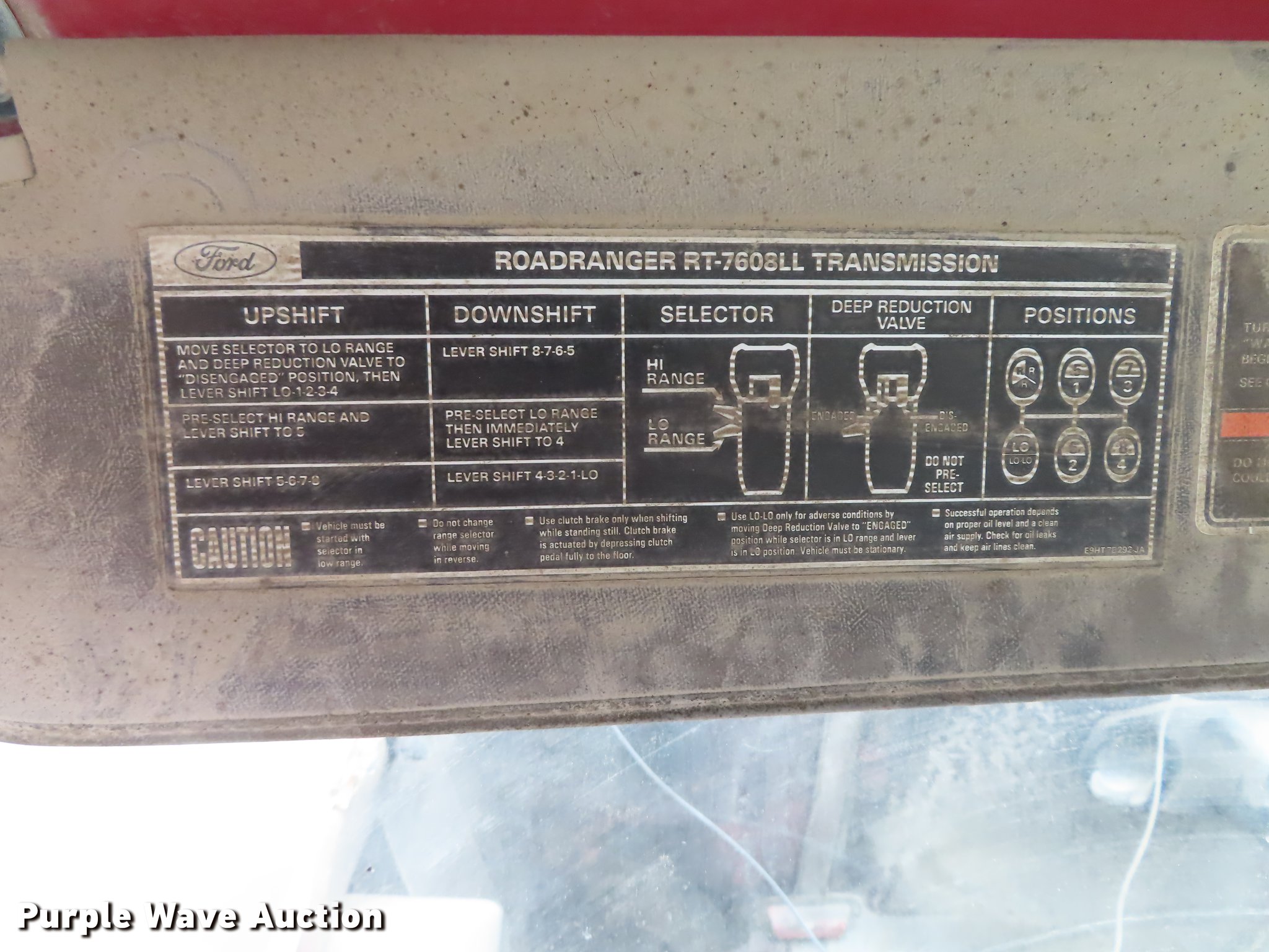 Purple Wave is selling a used Truck Chassis in Kansas. This item is a 1997 Ford LT8000 truck cab and chassis with the following: 258,866 miles on odometer, Cummins 8.3L L6 turbo diesel engine, Eaton Fuller Road Ranger eight speed manual transmission, Lo-Lo gear, Tandem axle, Tag lift axle, Inter-axle differential lock, Heat, AM/FM, Air suspension seat, Front tow hooks, Block heater, Single exhaust stack, Walking beam suspension, Air brakes, 425/65R22.50 front tires, GVWR 60,000 lbs, FAWR 20,000 lbs, IAWR 20,000 lbs, RAWR 20,000 lbs