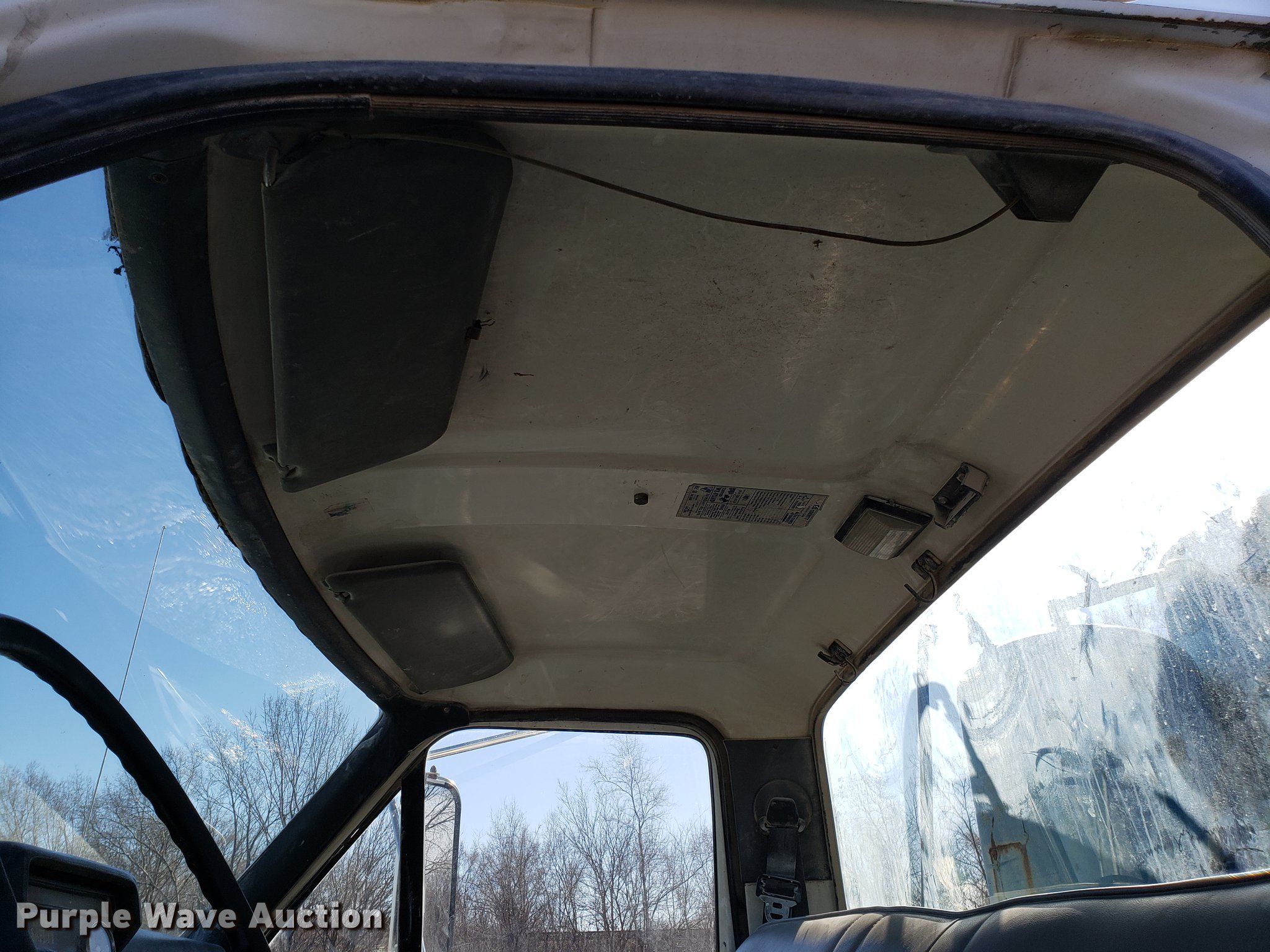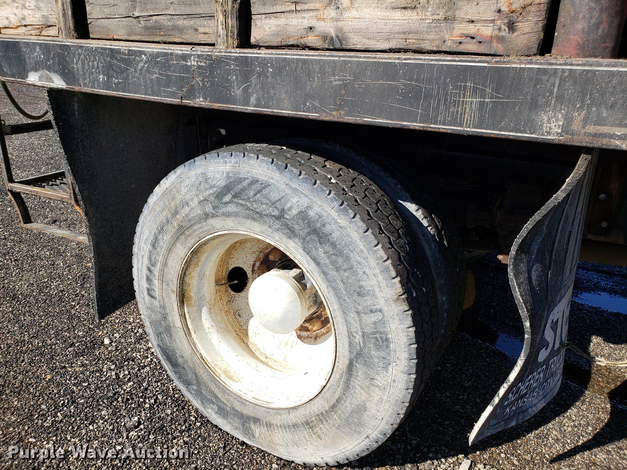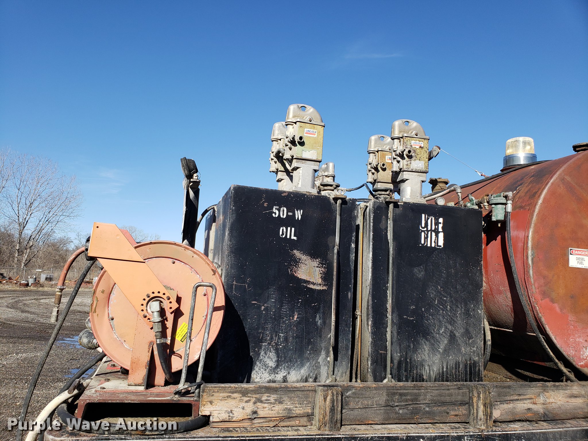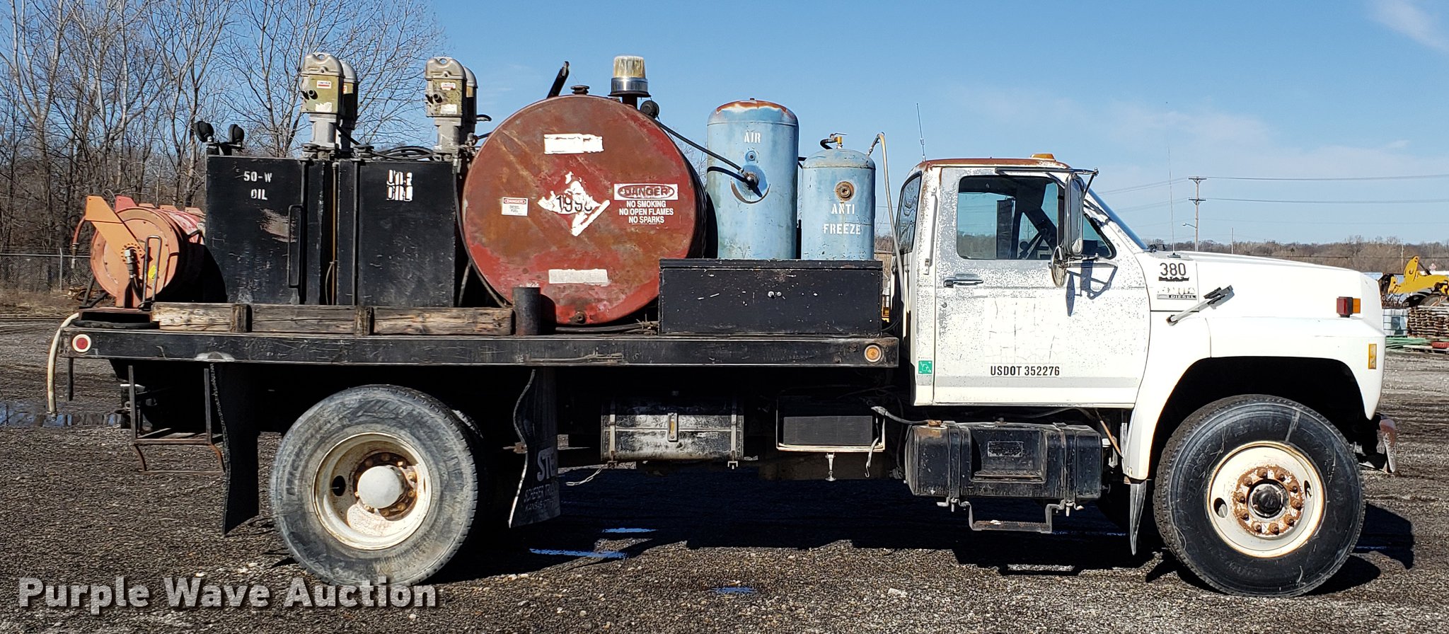 Purple Wave is selling a used Service Truck in Kansas. This item is a 1991 Ford F800 fuel and lube truck with the following: 281,839 miles on odometer, 10,402 hours on meter, 7.8L L6 turbo diesel engine, Five speed manual transmission, Two speed rear end, Heat, AM/FM/CD, PTO, 19'L x 8'W flatbed, (7) hose reels, Auxiliary fuel tank, Coolant reservoir, Oil reservoirs, Grease reservoir, Air compressor, 214" wheelbase, Spring suspension, Air brakes, 11R22.5 tires, Transmission issues, Will not go into gear, Non-operational vehicle, Unit# 380B