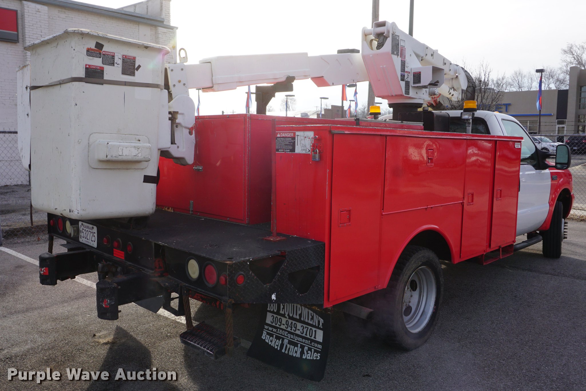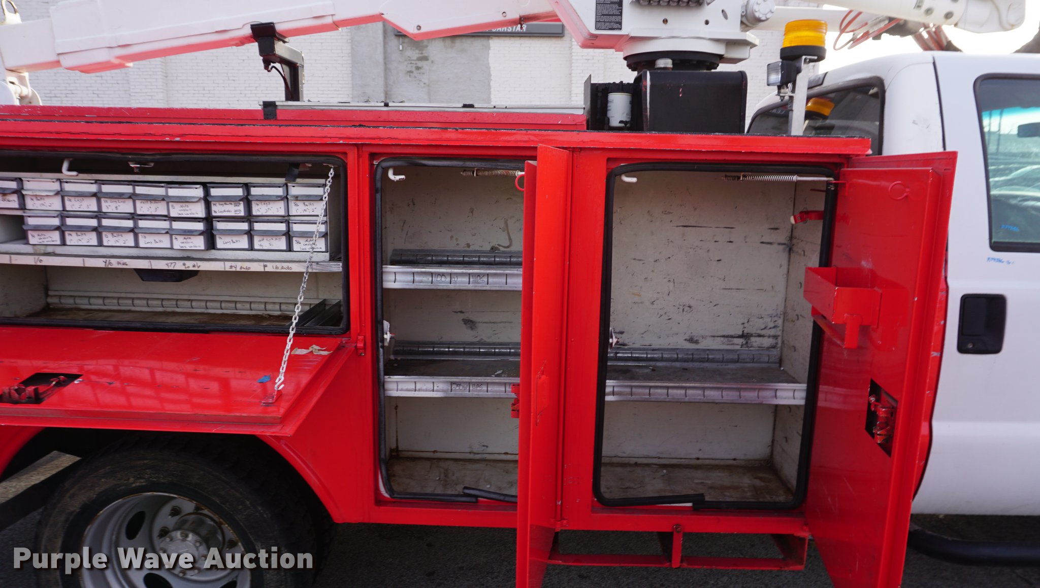 2004 Ford F550 Super Duty bucket truck. 148,521 miles on odometer, 6.0L V8 OHV 32V turbo diesel engine, Automatic transmission, Single axle, AC and heat, AM/FM, PTO, Altec utility bed 10'2"L, 29" rear platform, Shelving, Compartment lights, Work lights, Altec AT35-G boom 350 lbs maximum lift capacity, 35'8" maximum lift height, Man basket Ground and platform controls, Boom rotation, Articulating, insulated, telescopic boom, Serial 0703DE3988, Single fuel tank, Spring suspension, Hydraulic brakes, 225/70R19.5 tires, GVWR 19,000 lbs, Passenger door replaced due to vandalism. Kansas title. 1FDAF56PX4EA07725. Young Sign Company. Leavenworth, KS 66048