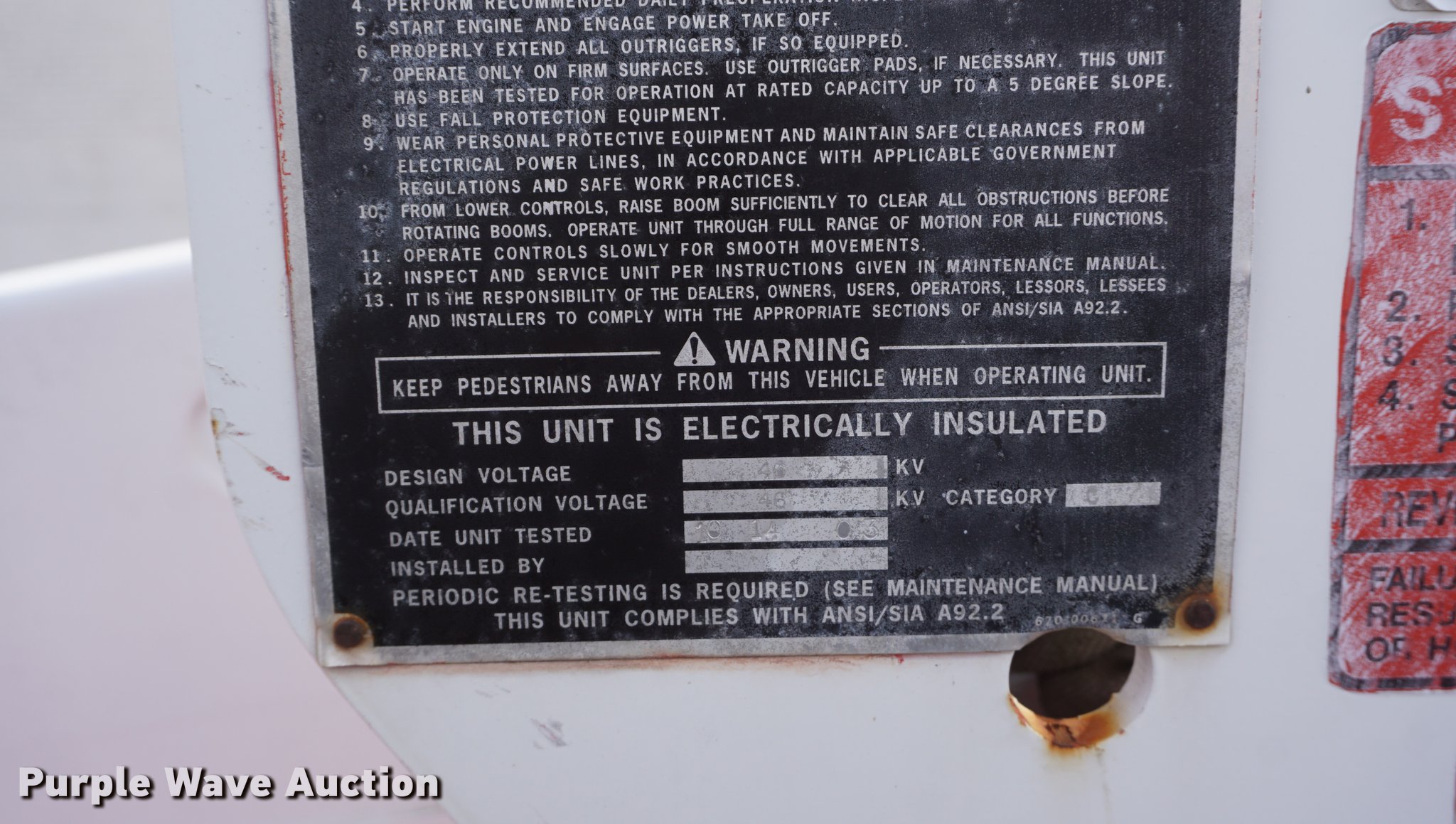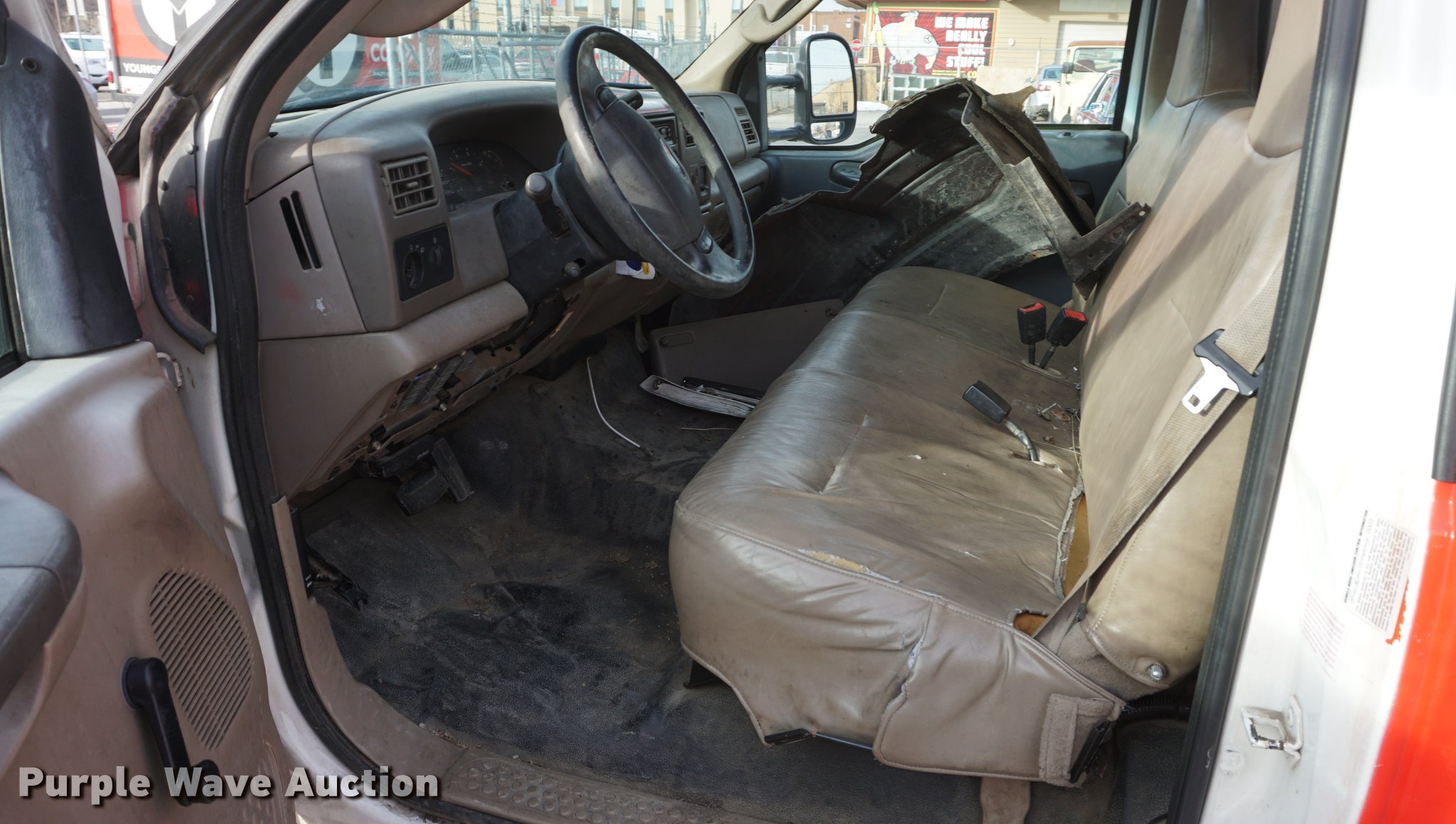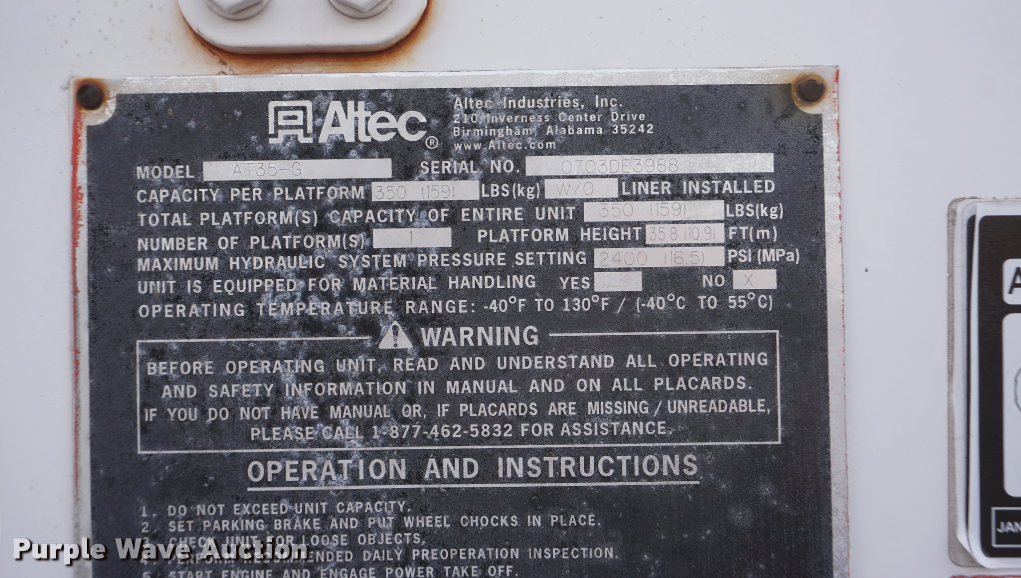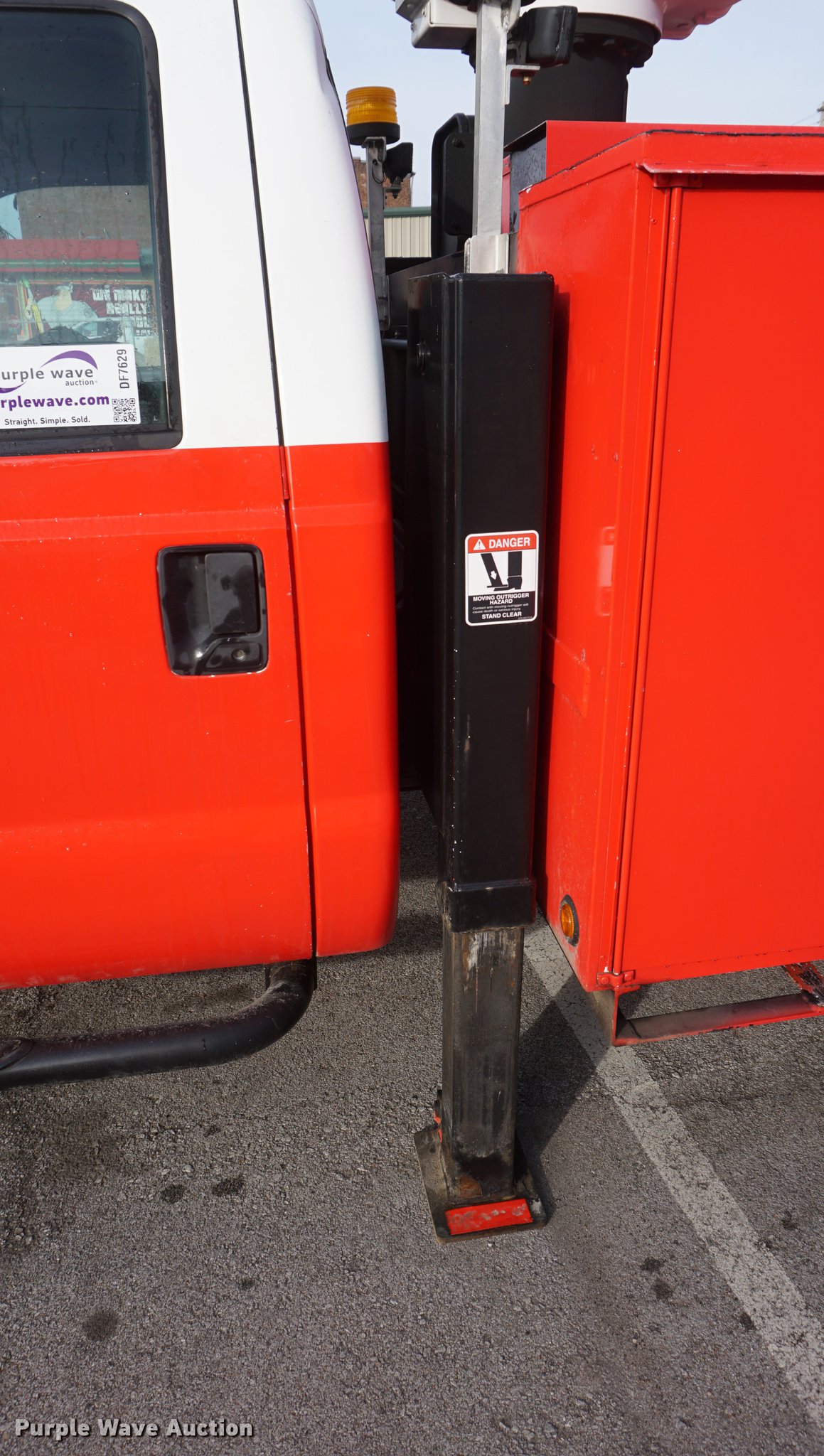 Purple Wave is selling a used Bucket Truck in Kansas. This item is a 2004 Ford F550 Super Duty bucket truck with the following: 148,521 miles on odometer, 6.0L V8 OHV 32V turbo diesel engine, Automatic transmission, Single axle, AC and heat, AM/FM, PTO, Altec utility bed, 10'2"L, 29" rear platform, Shelving, Compartment lights, Work lights, Altec AT35-G boom, 350 lbs maximum lift capacity, 35'8" maximum lift height, Man basket, Ground and platform controls, Boom rotation, Articulating, insulated, telescopic boom, Serial 0703DE3988, Single fuel tank, Spring suspension, Hydraulic brakes, 225/70R19.5 tires, GVWR 19,000 lbs, Passenger door replaced due to vandalism