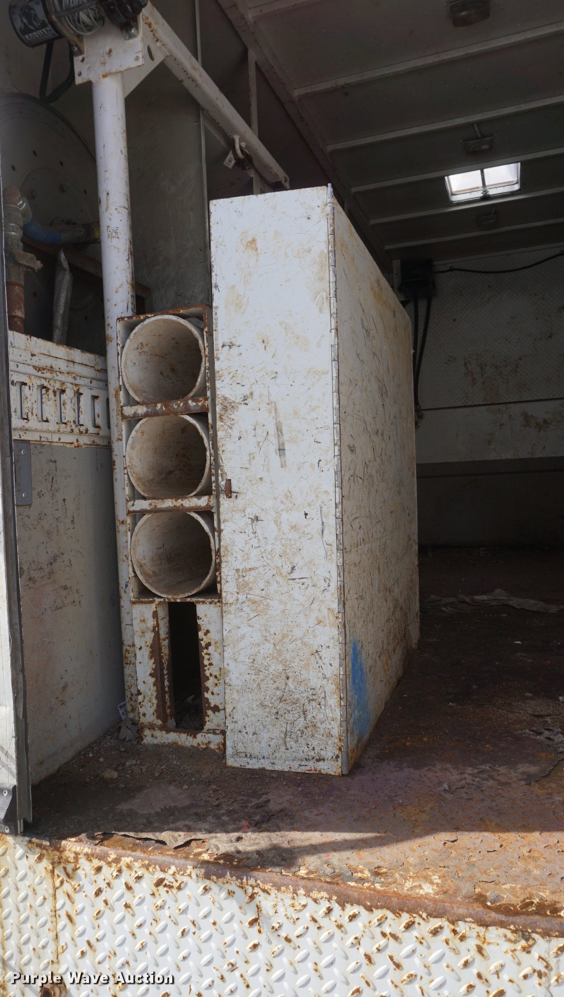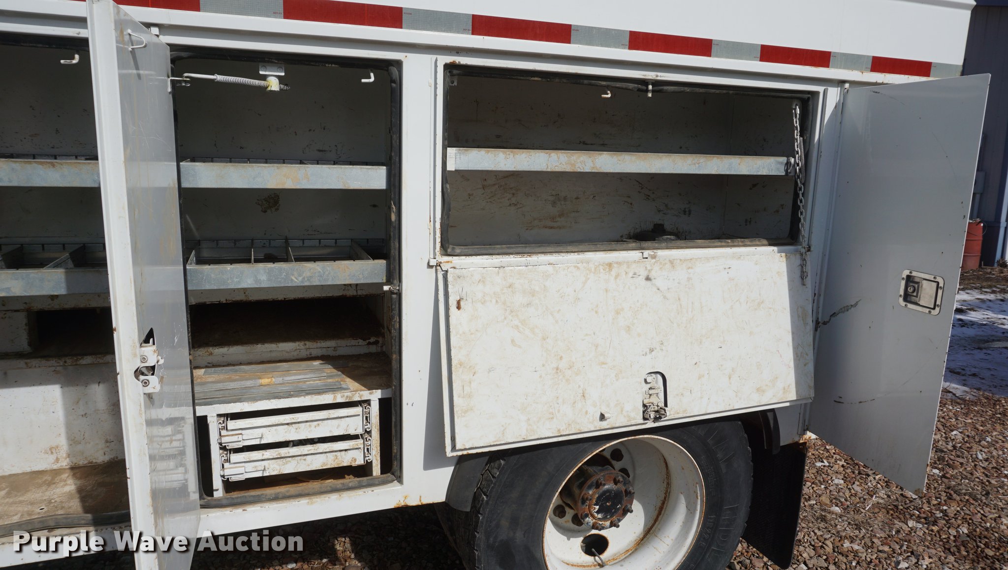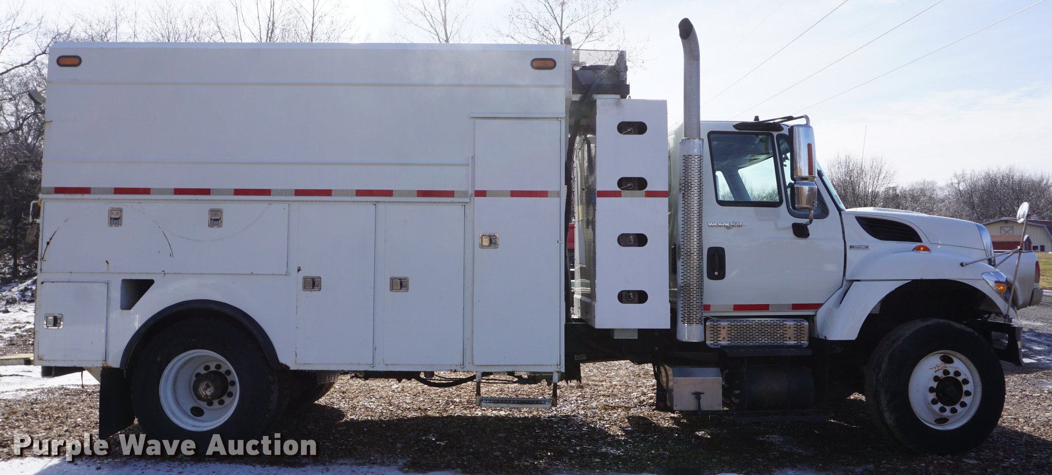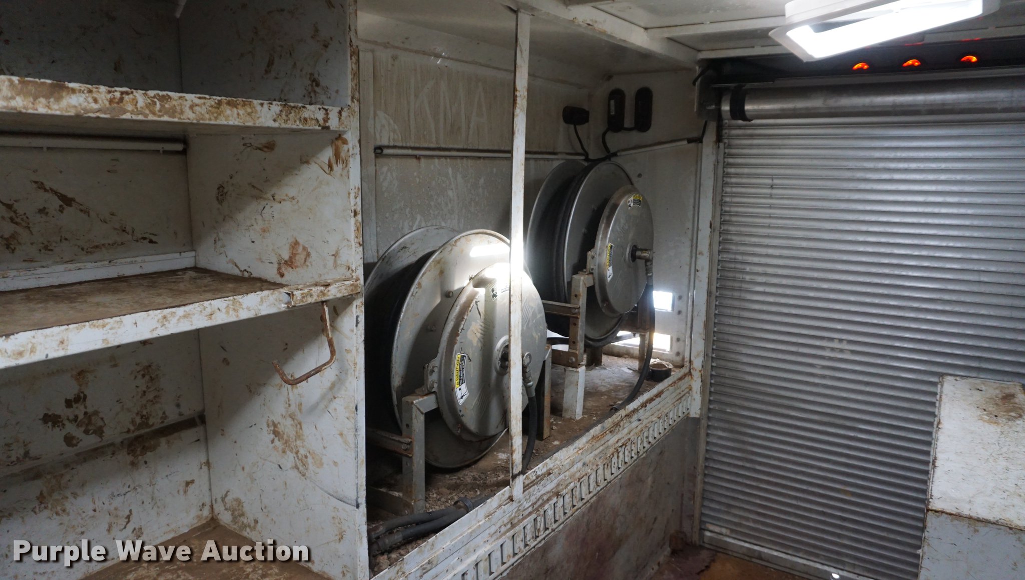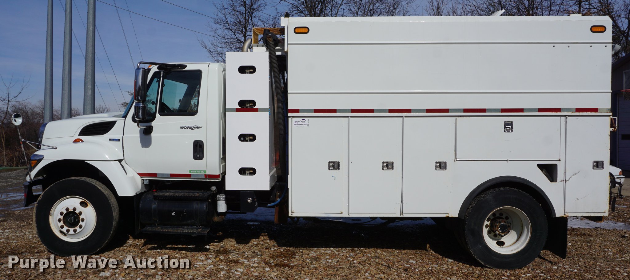 Purple Wave is selling a used Service Truck in Missouri. This item is a 2009 International 7300 service truck with the following: 25,167 miles on odometer, 4,660 hours on meter, 2,450 PTO hours on meter, International MaxxForce 7.6L L6 CNG engine, Allison automatic transmission, Single axle, AC and heat, AM/FM/CD, Heated mirrors, Air suspension seat, PTO, Dakota 155-SS utility bed, 13'L, Shelving, Slide-out drawers, Enclosed body, Power inverter, (2) Hydraulic hose reels, Air compressor, Air hose reel, Sinlge fuel tank, Single exhaust stack, Spring suspension, Air brakes, 11R22.5 tires, GVWR 35,000 lbs