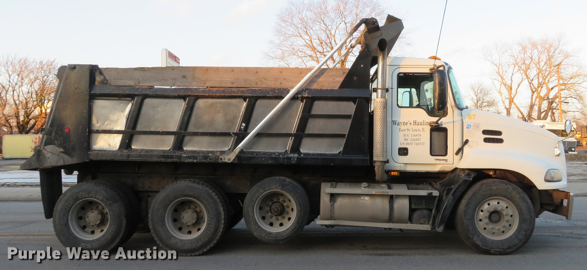 2004 Mack CX612 dump truck. 482,036 miles on odometer, 17,270 hours on meter, Mack AC 12.0L L6 turbo diesel engine 330 HP, Eaton Fuller Autoshift transmission, Inter-axle differential lock, Triple axle, AC and heat, Tilt, Cruise, AM/FM/CD, Power windows, Power heated mirrors, Air suspension seat, PTO, Dump valves, Heil 15'L x 96"W steel dump bed 36" side height, 12" side board height, Single ram hoist, Air operated end gate, Dual fuel tanks, Pintle hitch, 198" wheelbase, Double frame, Spring suspension, Air brakes, Engine brake, Steel inner wheels, Aluminum outer wheels, 385/65R22.5 front tires, 245/75R22.5 pusher axle tires, 12R22.5 rear tires, IAWR 20,000 lbs, RAWR 20,000 lbs, Windshield chipped. Illinois title. 1M1AE01X64N001471. Wayne's Hauling Inc.. East St. Louis, IL 62205