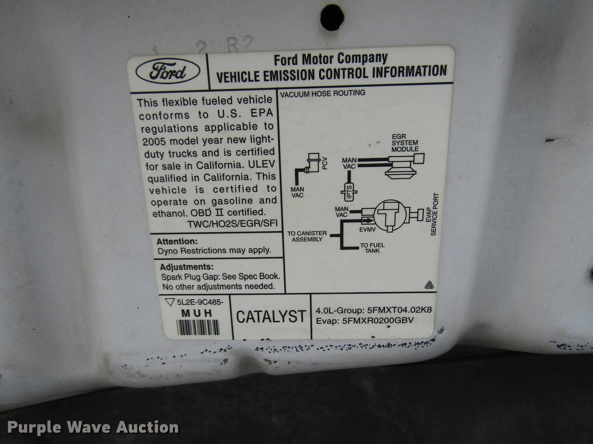 Purple Wave is selling a used Passenger Vehicle in Kansas. This item is a 2005 Ford Explorer SUV with the following: 71,548 miles on odometer, 4.0L V6 SOHC 12V FFV gas engine, Automatic transmission, AC and heat, Tilt, Cruise, AM/FM/CD, Power windows, locks, and mirrors, Cloth interior, Fog lights, Running boards, Receiver hitch, Trailer wiring, 235/70R16 tires, Unit# 5803