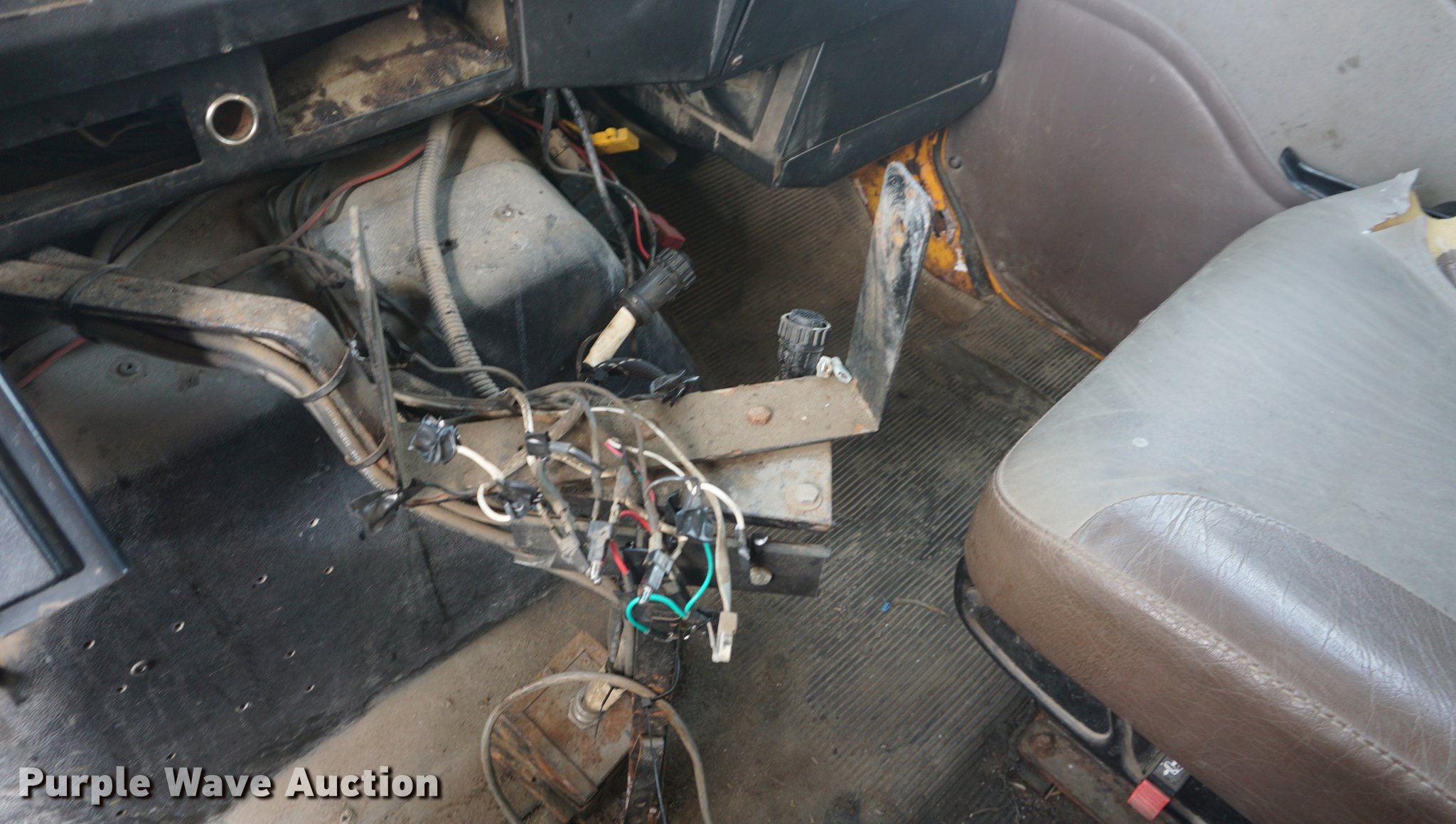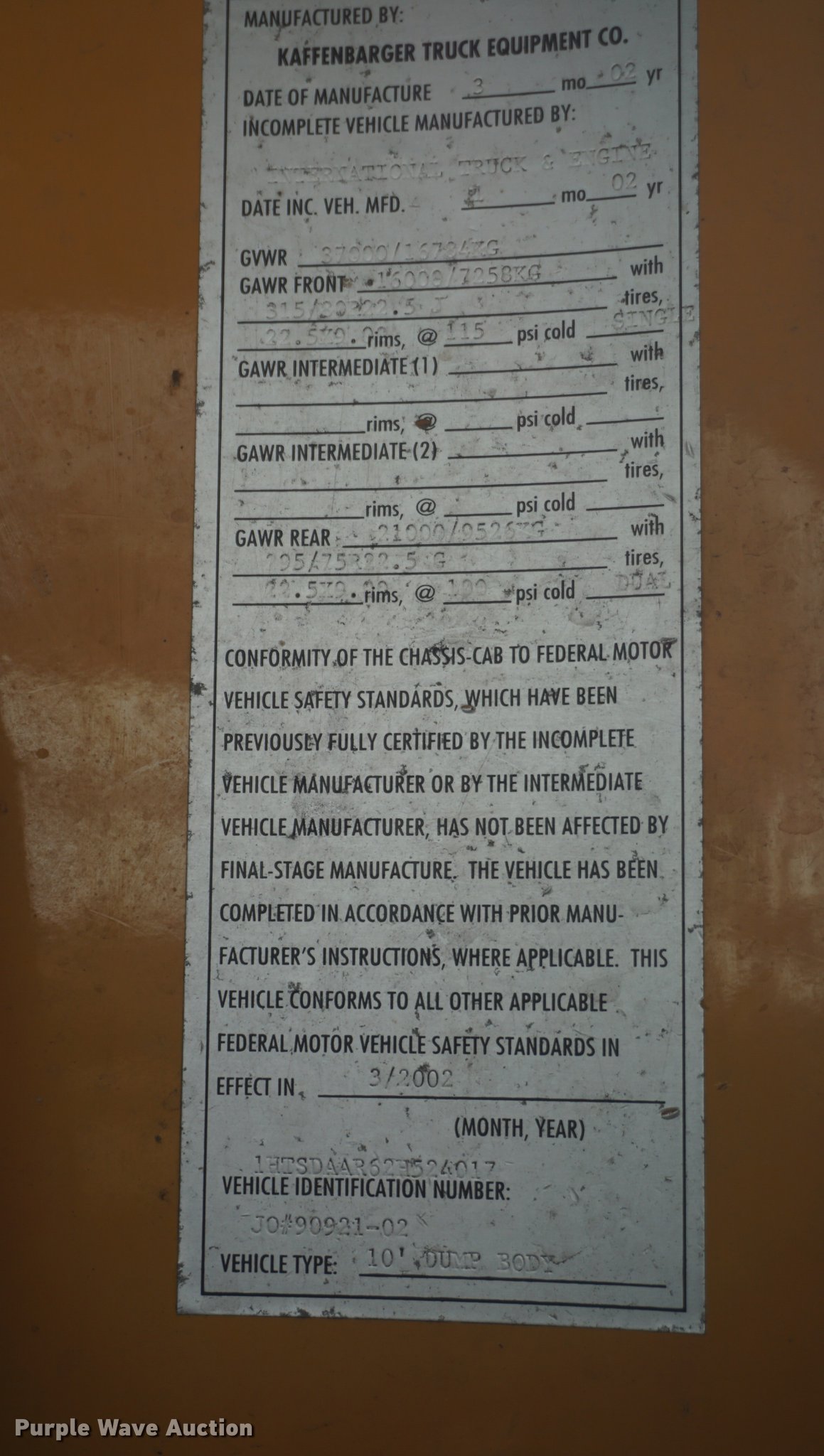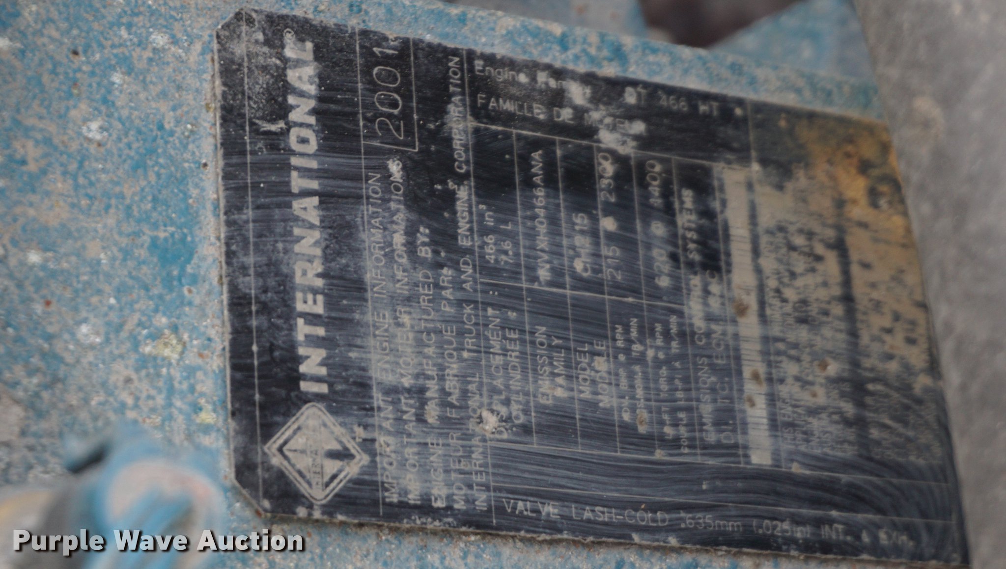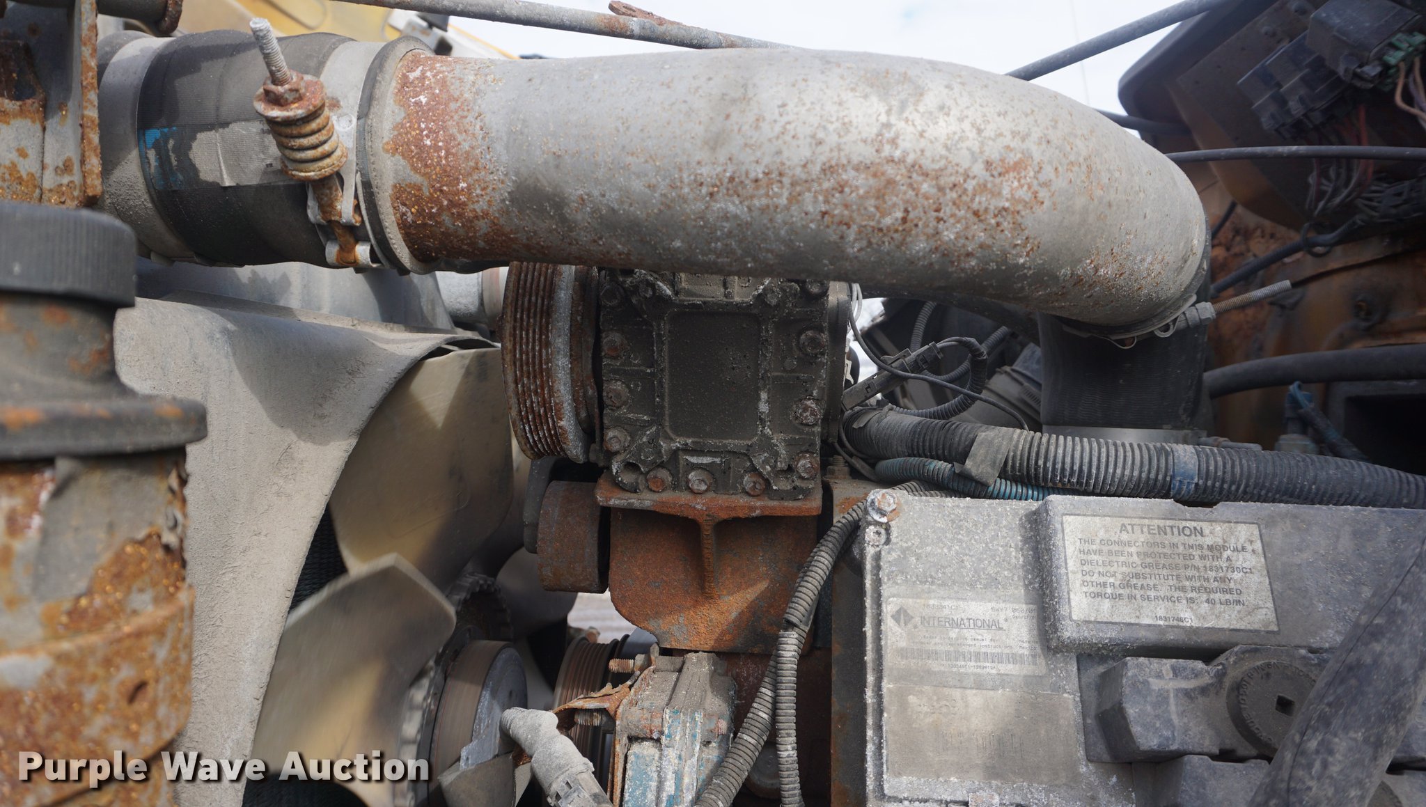 Purple Wave is selling a used Construction Dump Truck in Missouri. This item is a 2002 International 4900 dump truck with the following: 138,830 miles on odometer, 12,618 hours on meter, International DT466E 7.6L L6 turbo diesel engine, 215 HP, Allison automatic transmission, Single axle, AC and heat, Cruise, AM/FM, Power windows, Power and heated mirrors, Air suspension seat, Front mounted PTO, Galion 402FT steel dump bed, 10'L x 96"W, 24" side height, 5.6-6.8 cu. yd. capacity, Roll tarp, Bed vibrator, Single ram hoist, Air operated end gate, Single fuel tank, Pintle hitch, Spring suspension, Air brakes, 315/80R22.5 front tires, 11R22.5 rear tires, GVWR 37,000 lbs, FAWR 16,000 lbs, RAWR 21,000 lbs, Oil pan leak, Rear transmission leak, AC belt missing, Bed vibrator inoperable