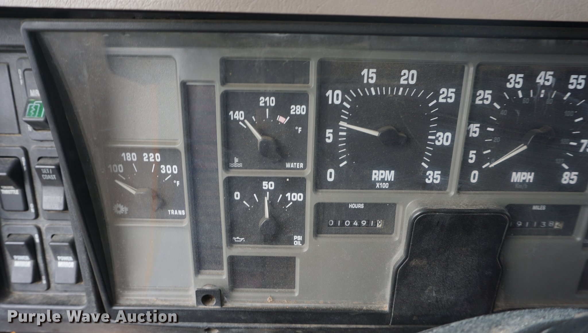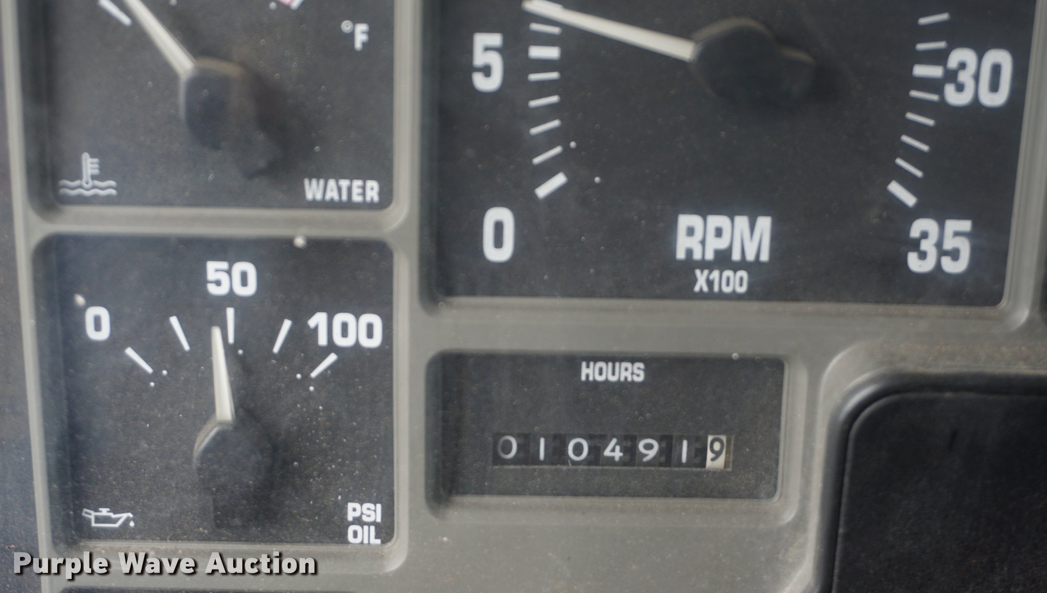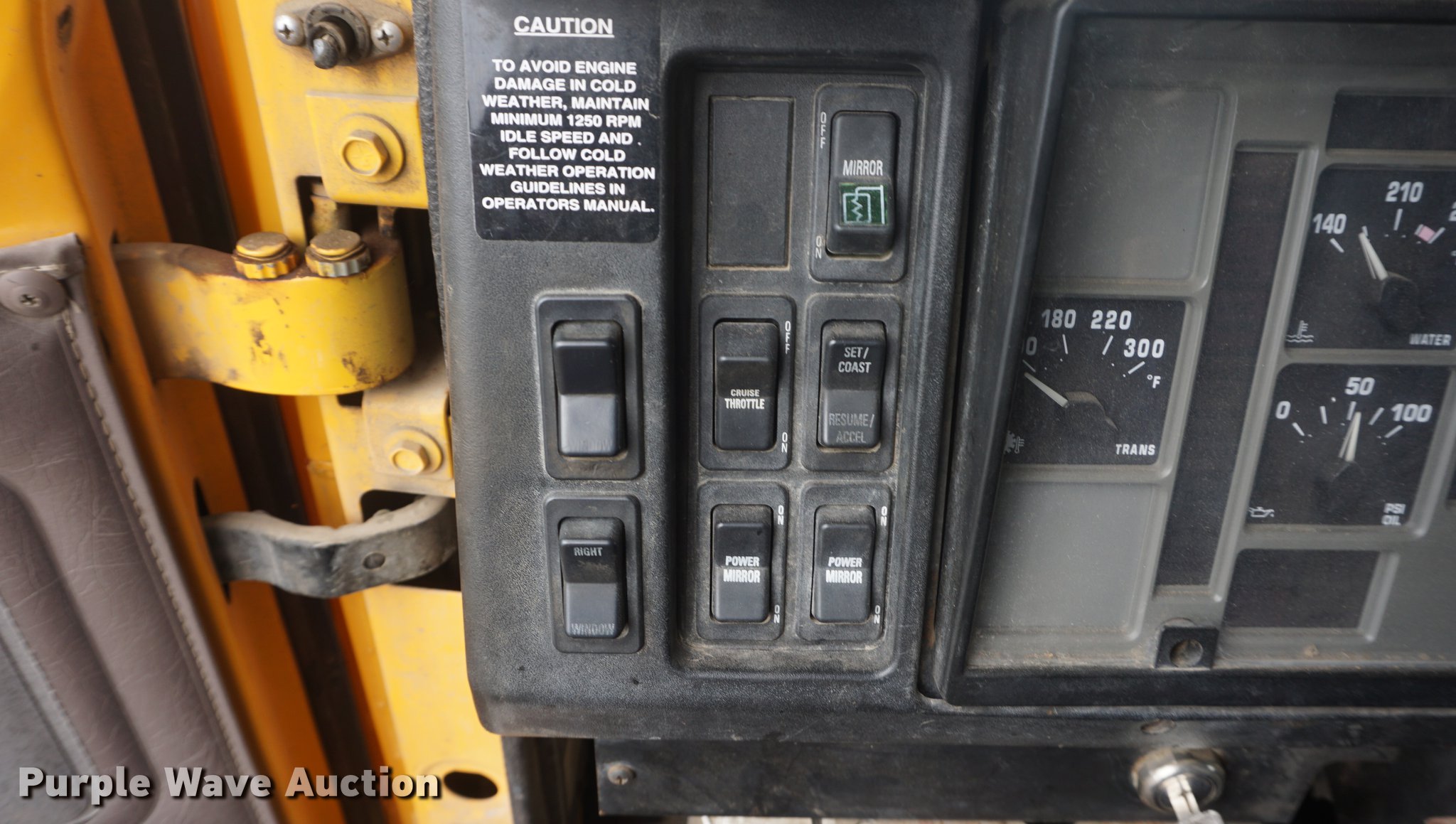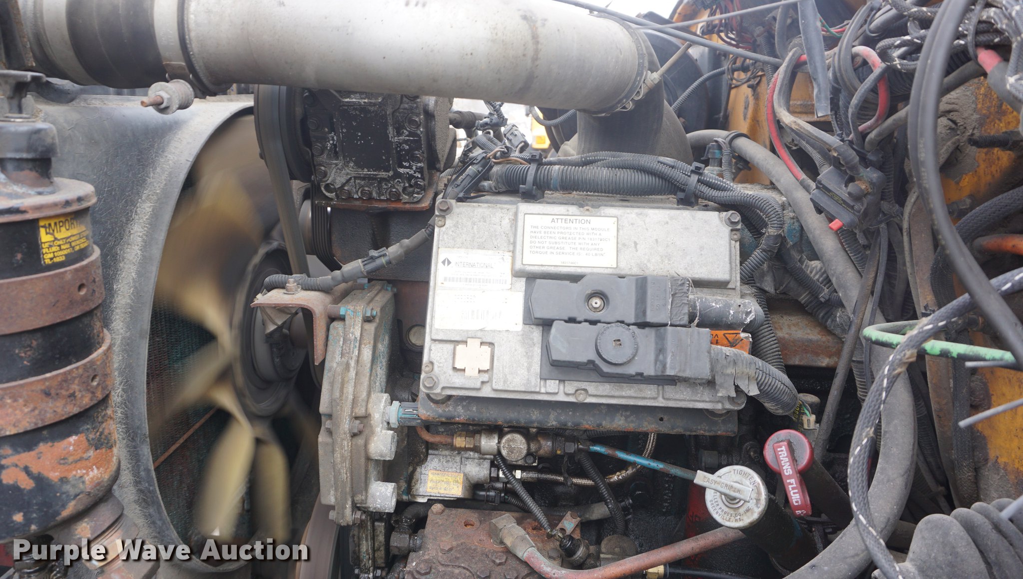 Purple Wave is selling a used Construction Dump Truck in Missouri. This item is a 2002 International 4900 Crew Cab dump truck with the following: 191,138 miles on odometer, 10,491 hours on meter, International DT466E 7.6L L6 turbo diesel engine, 215 HP, Allison automatic transmission, Single axle, AC and heat, Cruise, AM/FM, Power and heated mirrors, Air suspension seat, Front mounted PTO, Galion 402FT steel dump bed, 10'L x 96"W, 24" side height, 5.6-6.8 cu. yd. capacity, Electric roll tarp, Bed vibrator, Single ram hoist, Air operated end gate, Plow mount, 2001 Henke wing plow, Single fuel tank, Pintle hitch, Spring suspension, Air brakes, 315/80R22.5 front tires, 11R22.5 rear tires, GVWR 37,000 lbs, FAWR 16,000 lbs, RAWR 21,000 lbs, Radiator needs to be replaced, Non-operational AC, Bed vibrator inoperable, Lift cylinder leaks, Electric roll tarp inoperable