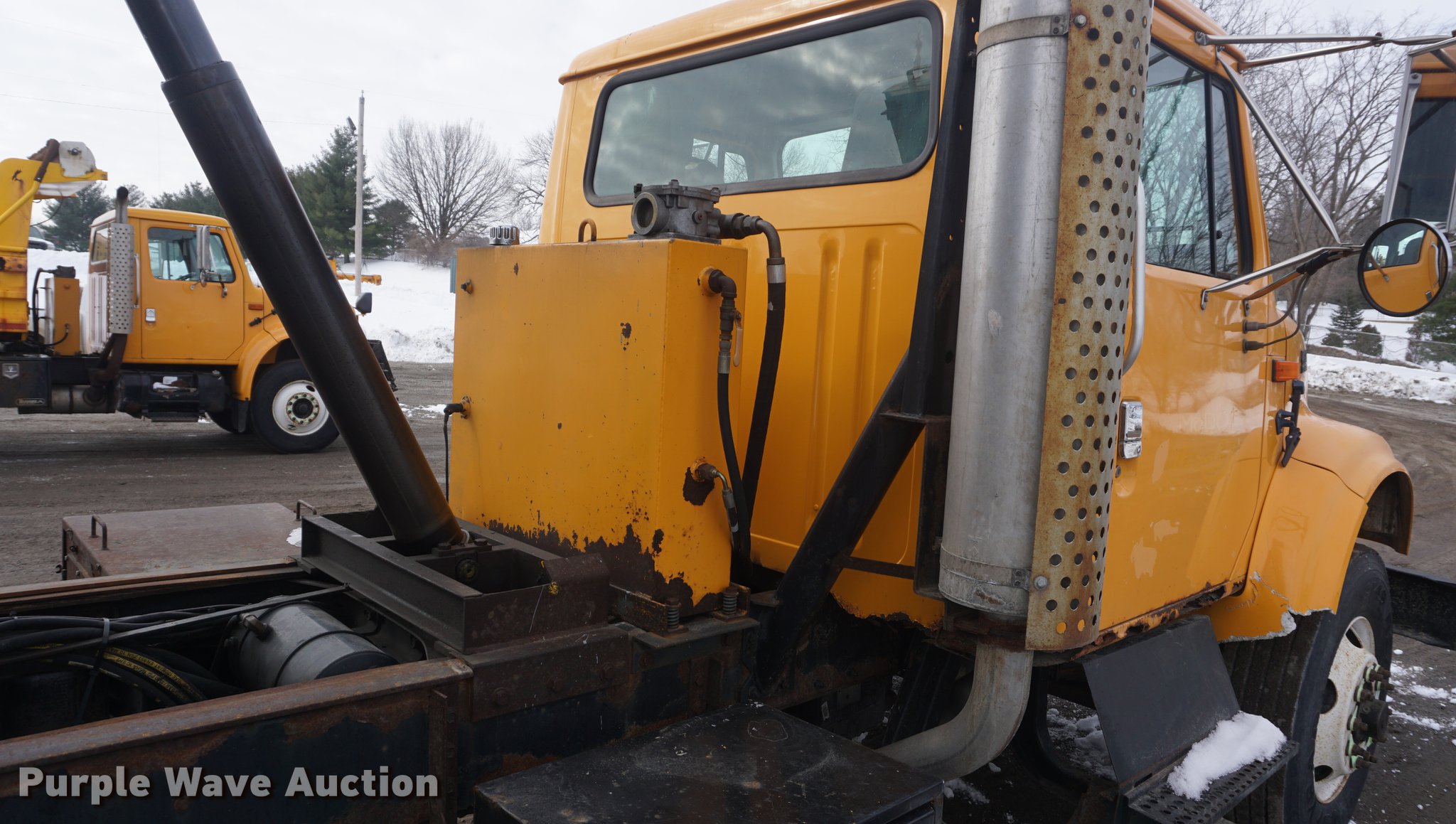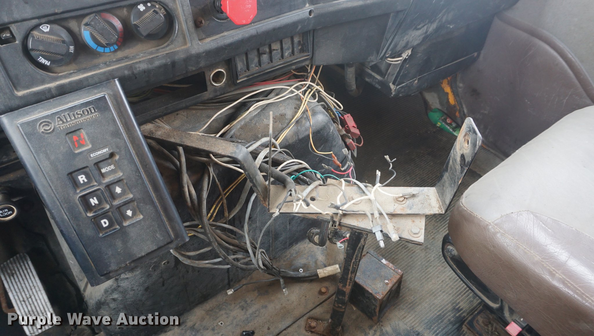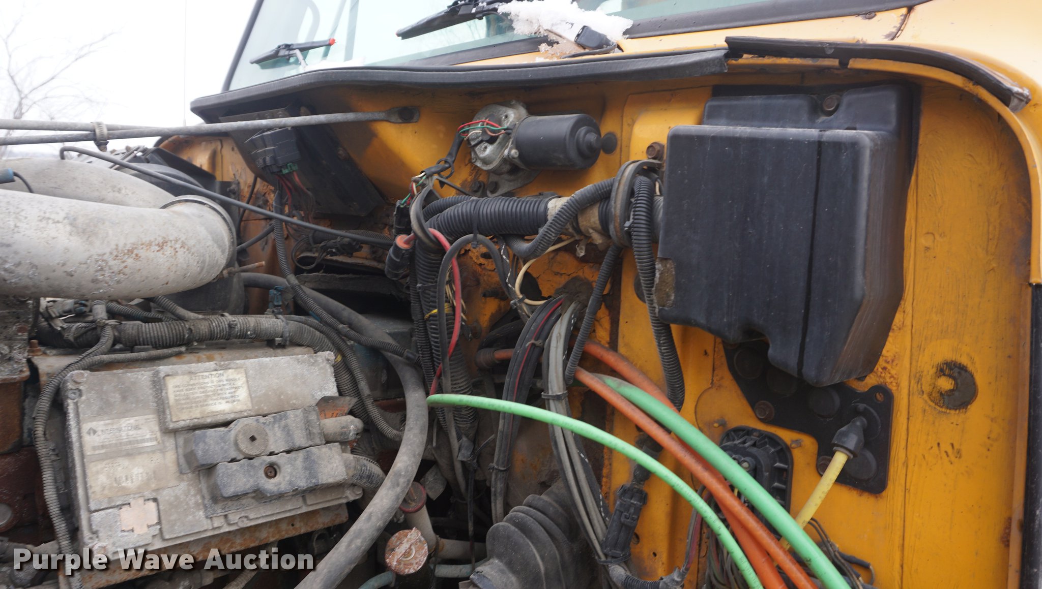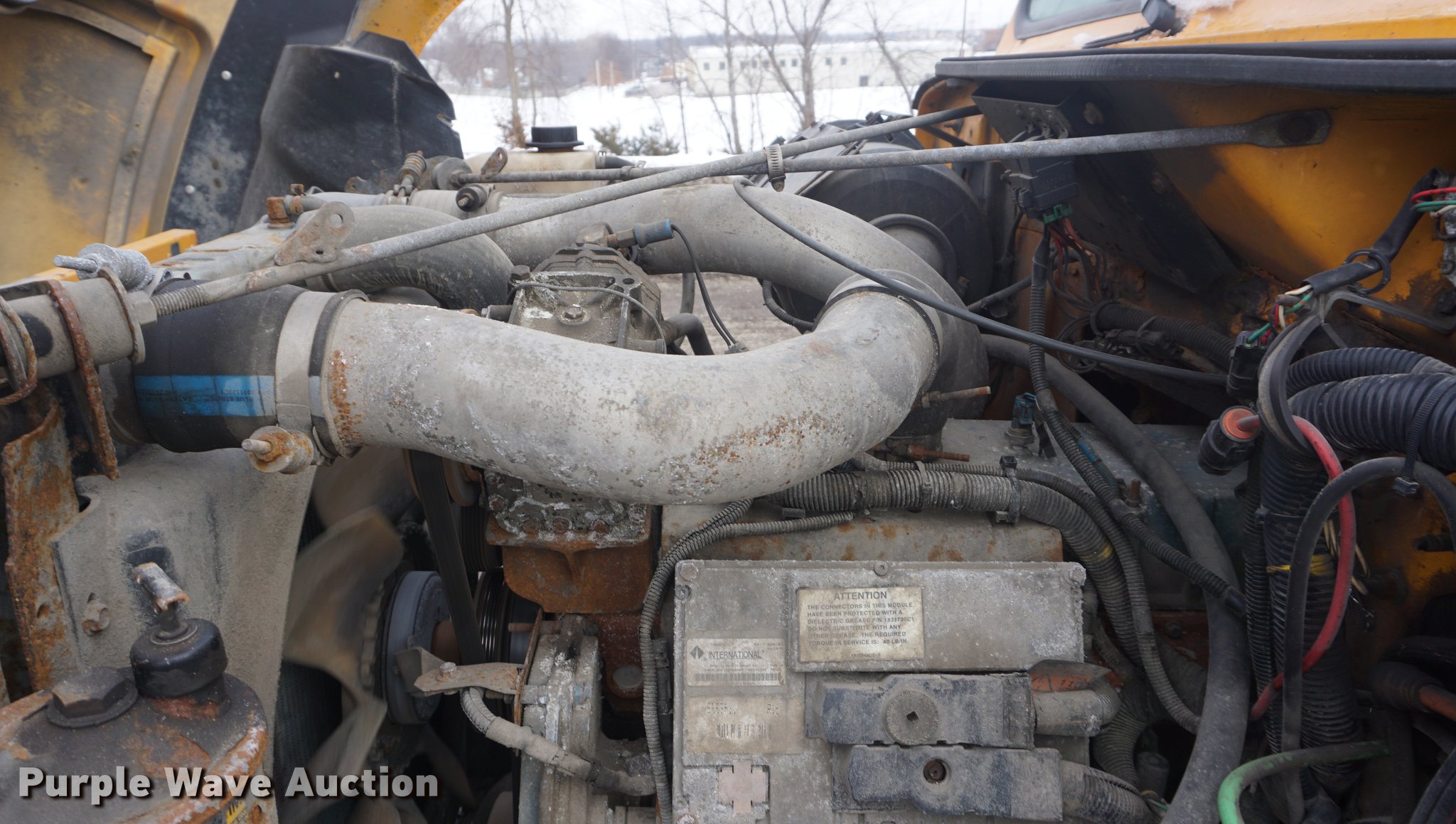 Purple Wave is selling a used Construction Dump Truck in Missouri. This item is a 2002 International 4900 dump truck with the following: 124,849 miles on odometer, 11,523 hours on meter, International DT466E 7.6L L6 turbo diesel engine, 215 HP, Allison automatic transmission, Single axle, AC and heat, Cruise, AM/FM, Power and heated mirrors, Air suspension seat, Front mounted PTO, Galion 402FT steel dump bed, 10'L x 96"W, 24" side height, 5.6-6.8 cu. yd. capacity, Roll tarp, Bed vibrator, Single ram hoist, Air operated end gate, Plow mount, Single fuel tank, Pintle hitch, Spring suspension, Air brakes, 11R22.5 tires, GVWR 37,000 lbs, FAWR 16,000 lbs, RAWR 21,000 lbs, Front fenders broken, Non-operational AC