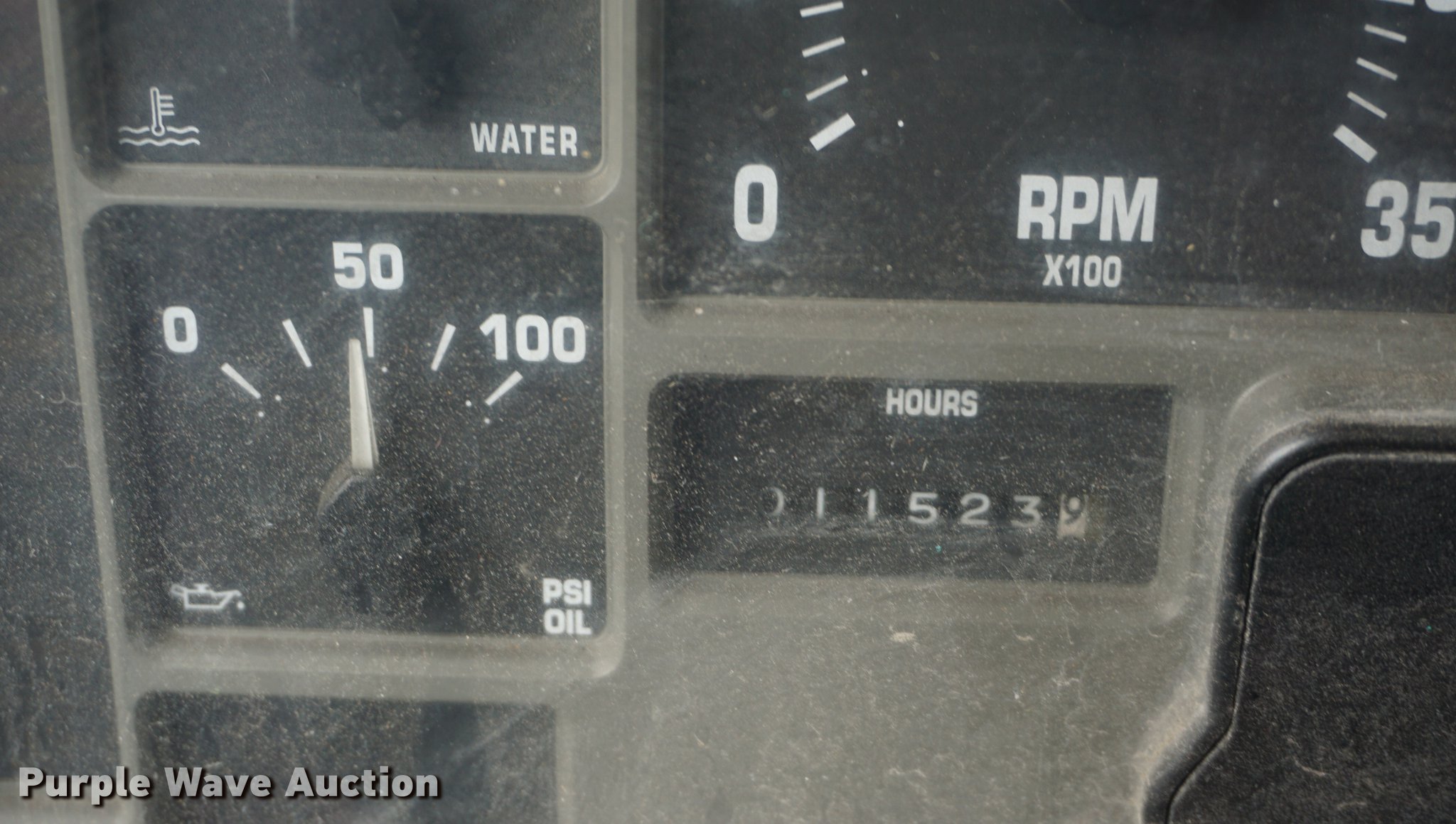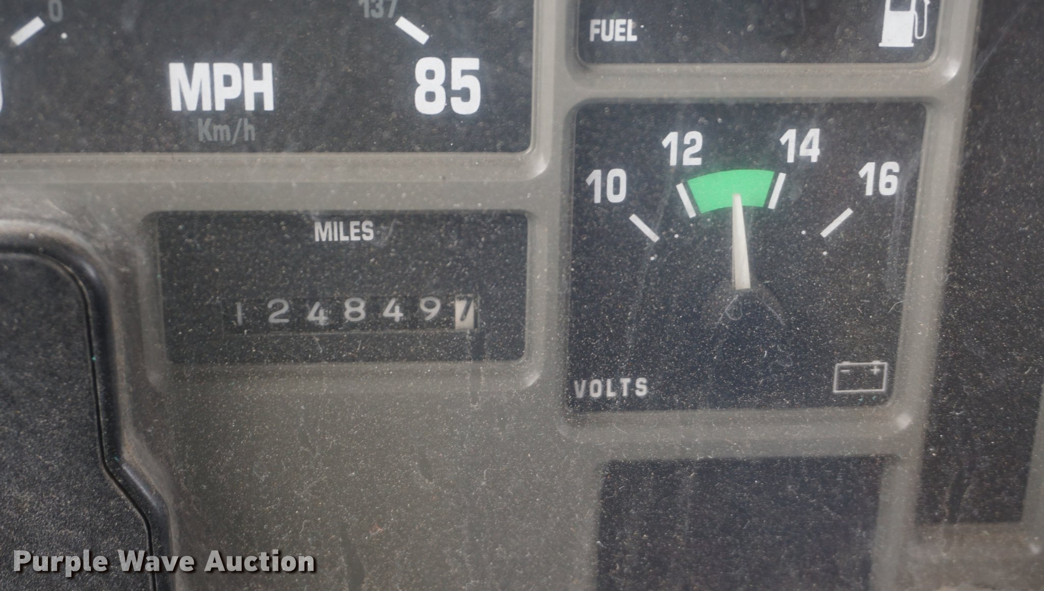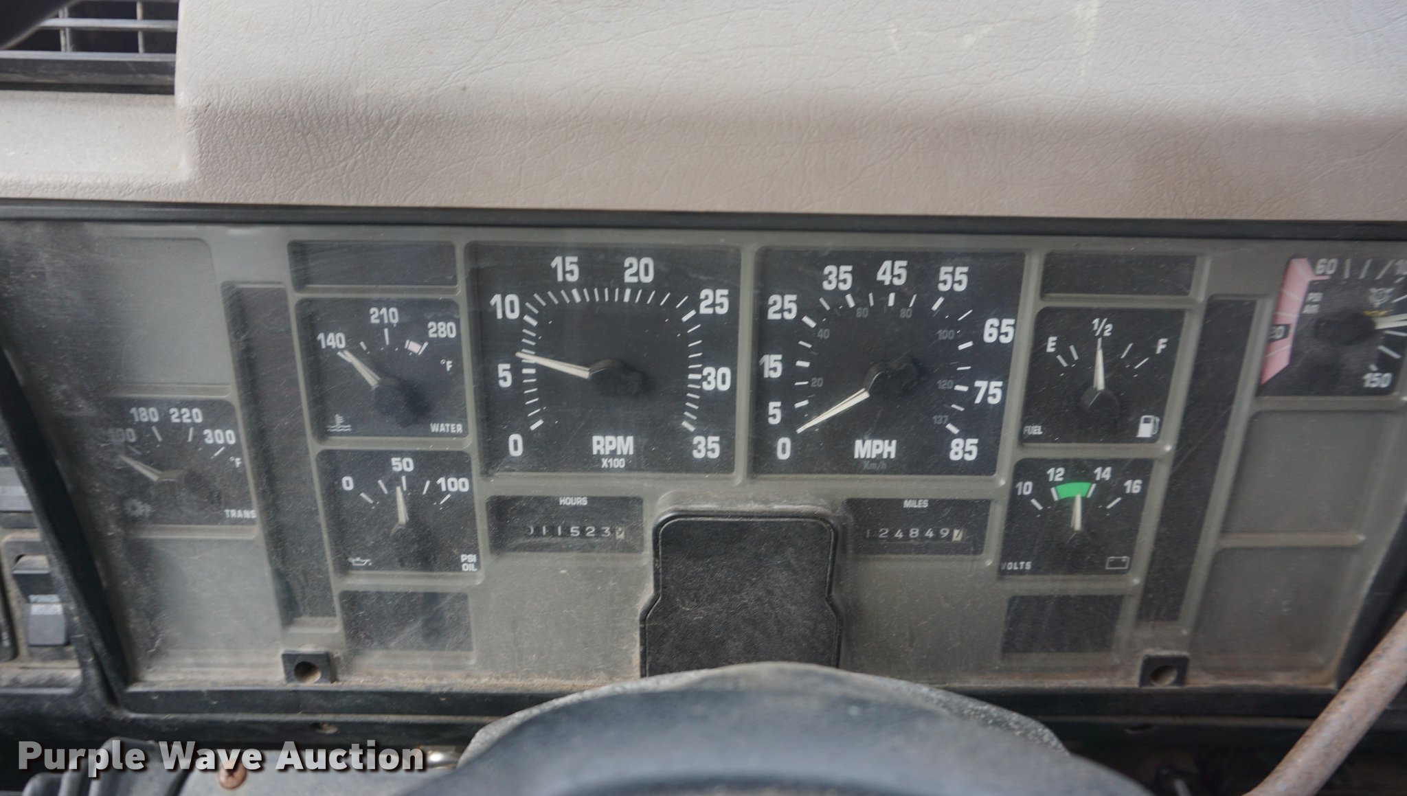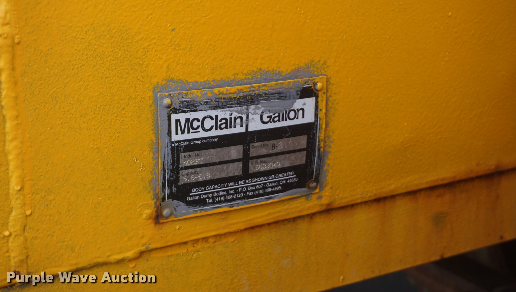 Purple Wave is selling a used Construction Dump Truck in Missouri. This item is a 2002 International 4900 dump truck with the following: 124,849 miles on odometer, 11,523 hours on meter, International DT466E 7.6L L6 turbo diesel engine, 215 HP, Allison automatic transmission, Single axle, AC and heat, Cruise, AM/FM, Power and heated mirrors, Air suspension seat, Front mounted PTO, Galion 402FT steel dump bed, 10'L x 96"W, 24" side height, 5.6-6.8 cu. yd. capacity, Roll tarp, Bed vibrator, Single ram hoist, Air operated end gate, Plow mount, Single fuel tank, Pintle hitch, Spring suspension, Air brakes, 11R22.5 tires, GVWR 37,000 lbs, FAWR 16,000 lbs, RAWR 21,000 lbs, Front fenders broken, Non-operational AC