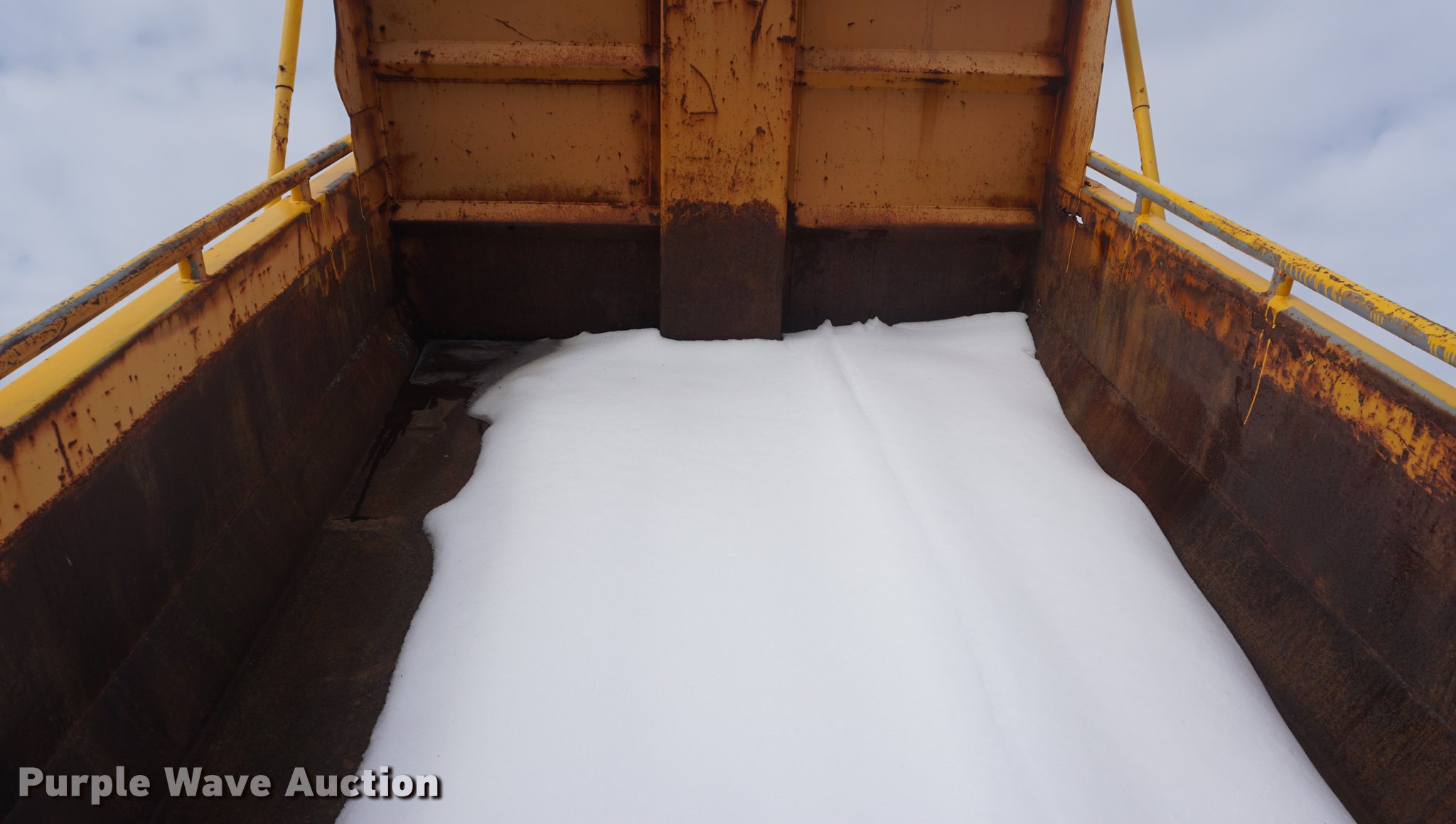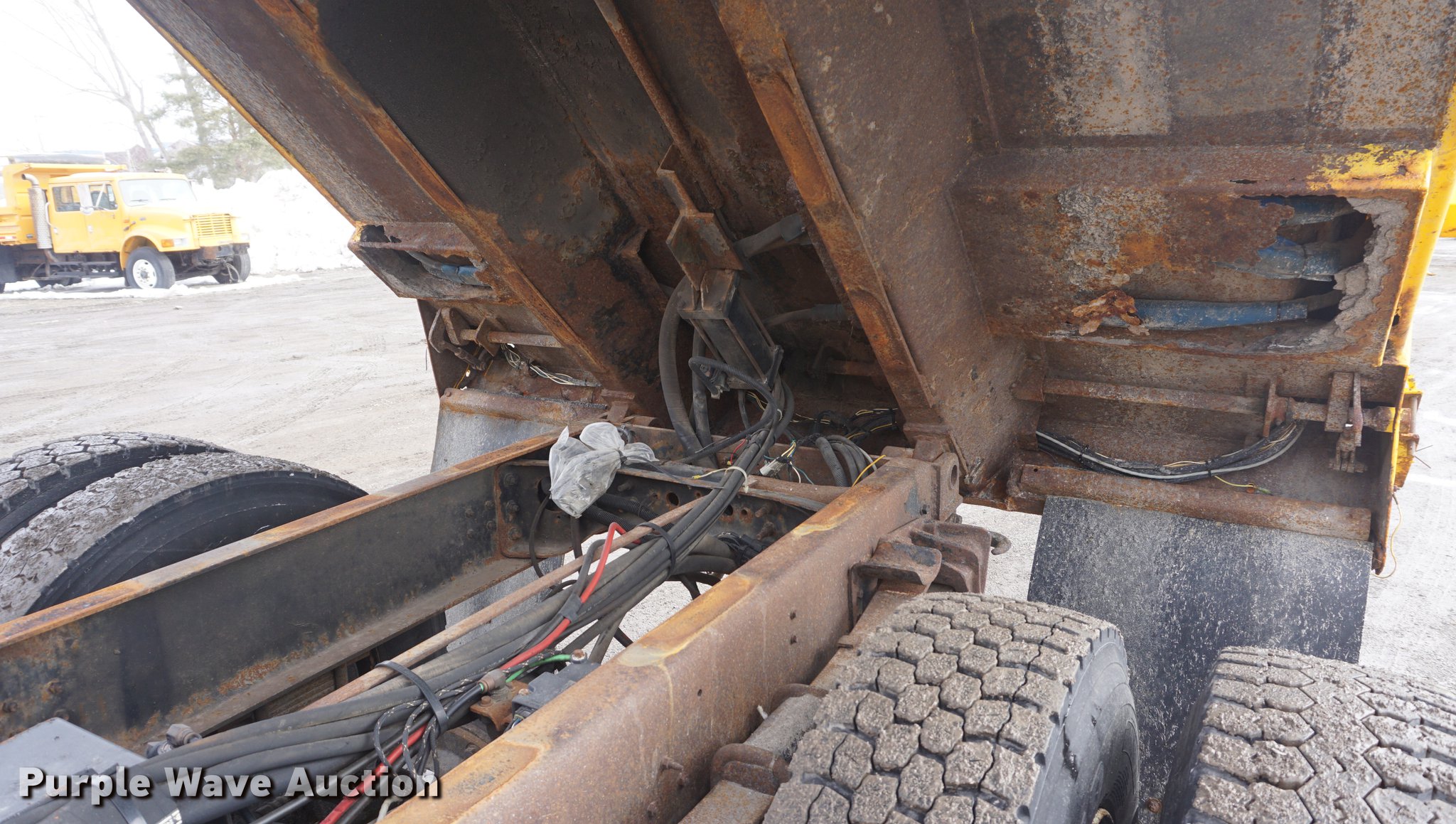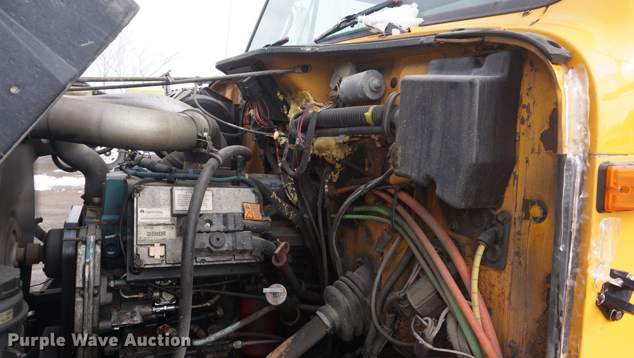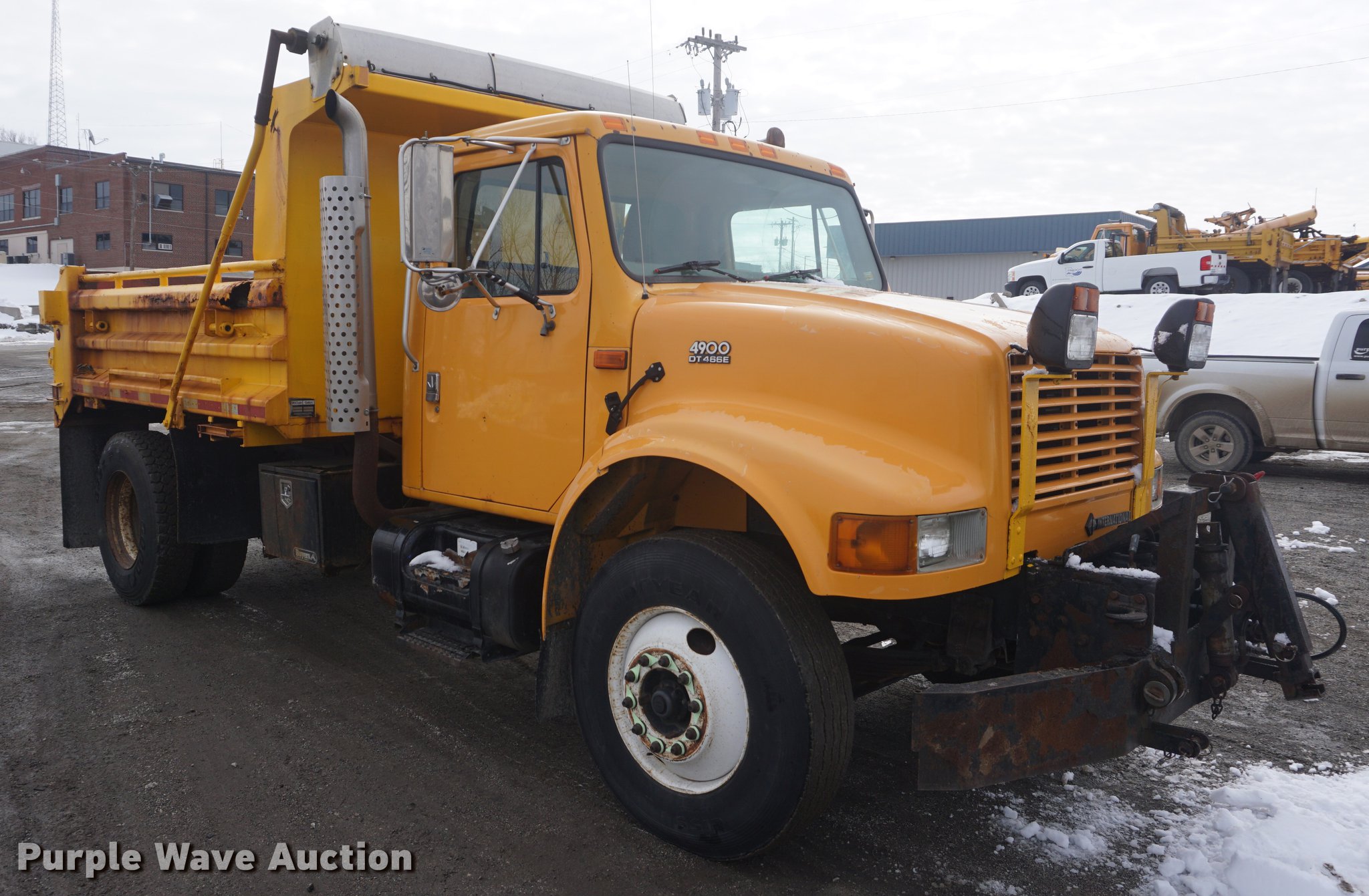 Purple Wave is selling a used Construction Dump Truck in Missouri. This item is a 2001 International 4900 dump truck with the following: 125,204 miles on odometer, 12,775 hours on meter, International DT466E 7.6L L6 turbo diesel engine, Allison automatic transmission, Single axle, Heat, Cruise, AM/FM, Heated mirrors, Air suspension seat, Front mounted PTO, Galion 402FT steel dump bed, 10'L x 96"W, 24" side height, 5.6-6.8 cu. yd. capacity, Roll tarp, Bed vibrator, Single ram hoist, Air operated end gate, Plow mount, Single fuel tank, Pintle hitch, Spring suspension, Air brakes, 11R22.5 tires, GVWR 34,220 lbs, FAWR 13,220 lbs, RAWR 21,000 lbs, Oil and fuel leak on engine, Pinion seal leaks, Air valve cylinder for bed latch inoperable, Tarp torn, Bed vibrator inoperable