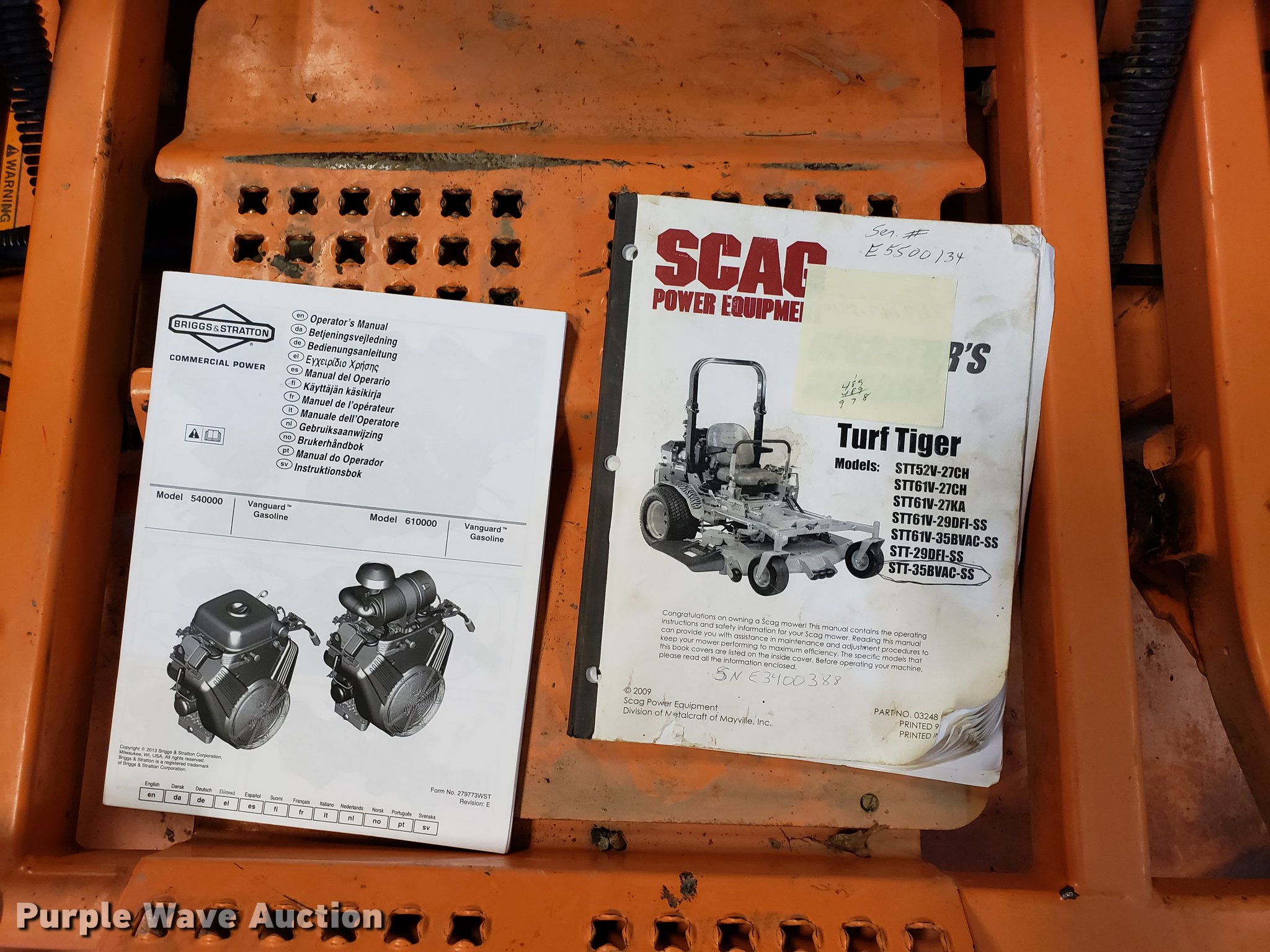 Purple Wave is selling a used Commercial Turf Mower in Missouri. This item is a Scag Turf Tiger STT-35BVAC-SS ZTR lawn mower with the following: 2,970 hours on meter, 72" cut, Vanguard two cylinder gas engine, 35 HP, Hydrostatic transmission, 13x6.50x6 front tires, 24x12-12 rear tires, Serial E5500134