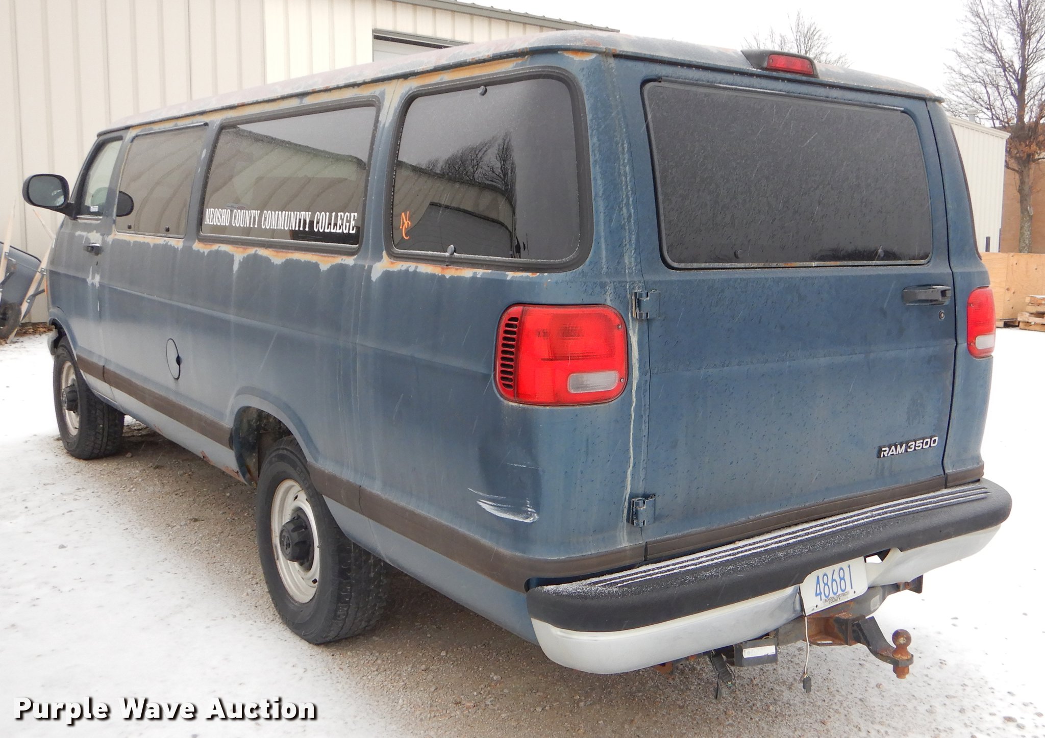 2000 Dodge Ram Wagon B3500 van. Approximately 192,406 miles on vehicle, 5.9L V8 OHV 16V gas engine, Automatic transmission, Cruise, AC and heat, 245/75R16 tires, Alternator issues, Contents not included, Windshield cracked. Kansas title. 2B5WB35Z8YK166413. Neosho Community College. 800 W 14th St. Chanute, KS 66720