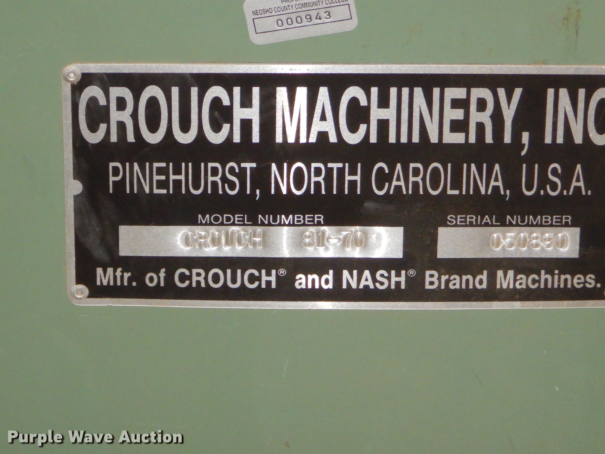 Tools. Fairbands 41-3132 scale 1,000 lbs capacity, Serial G806130, AEM 370COMBIN2770N planer 6'L x 4'W x 65"H, Three phase, Unknown operating condition, Ritter R30 router 70"L x 41"W x 48"H, Three phase, Serial 33, Unknown operating condition, Crouch Machinery 81-70 belt sander 80"L x 28"W x 48"H, Three phase, Serial 059890, Unknown operating condition. Neosho Community College. 800 W 14th St. Chanute, KS 66720