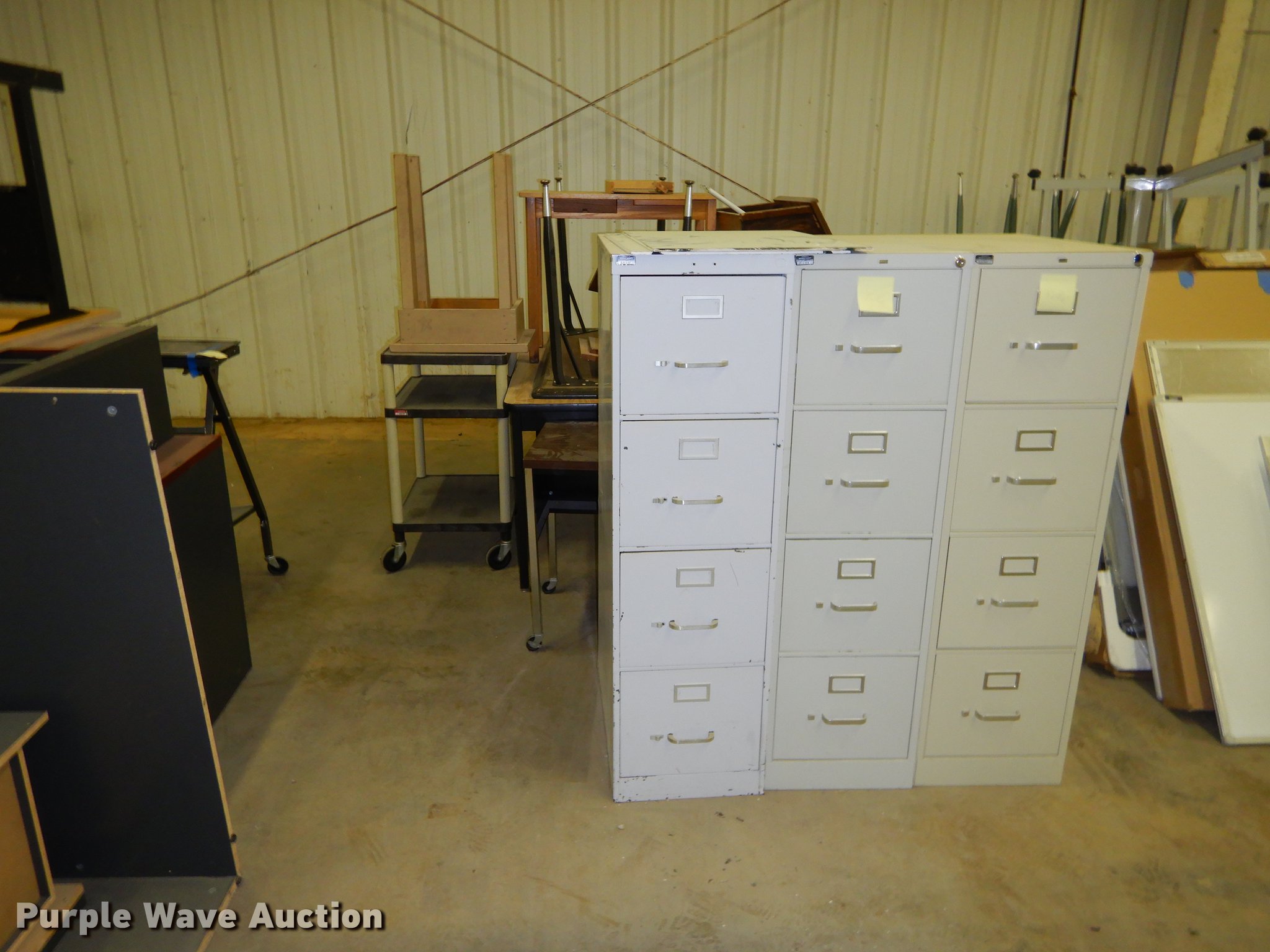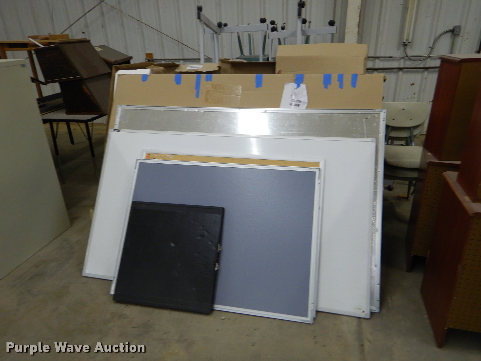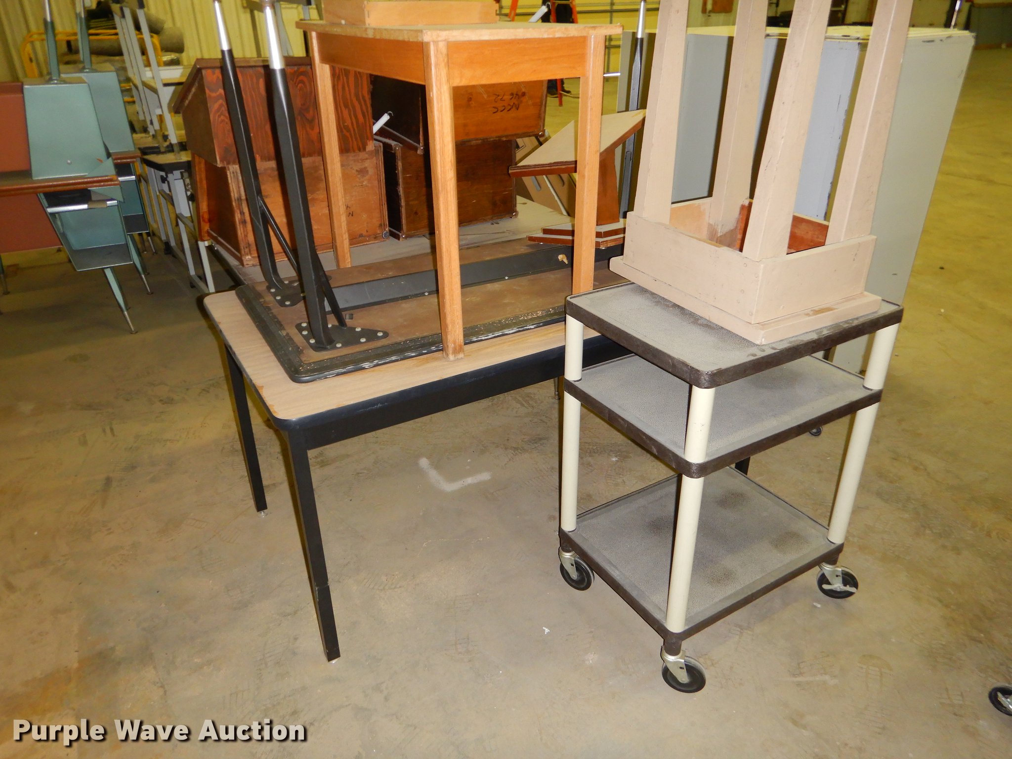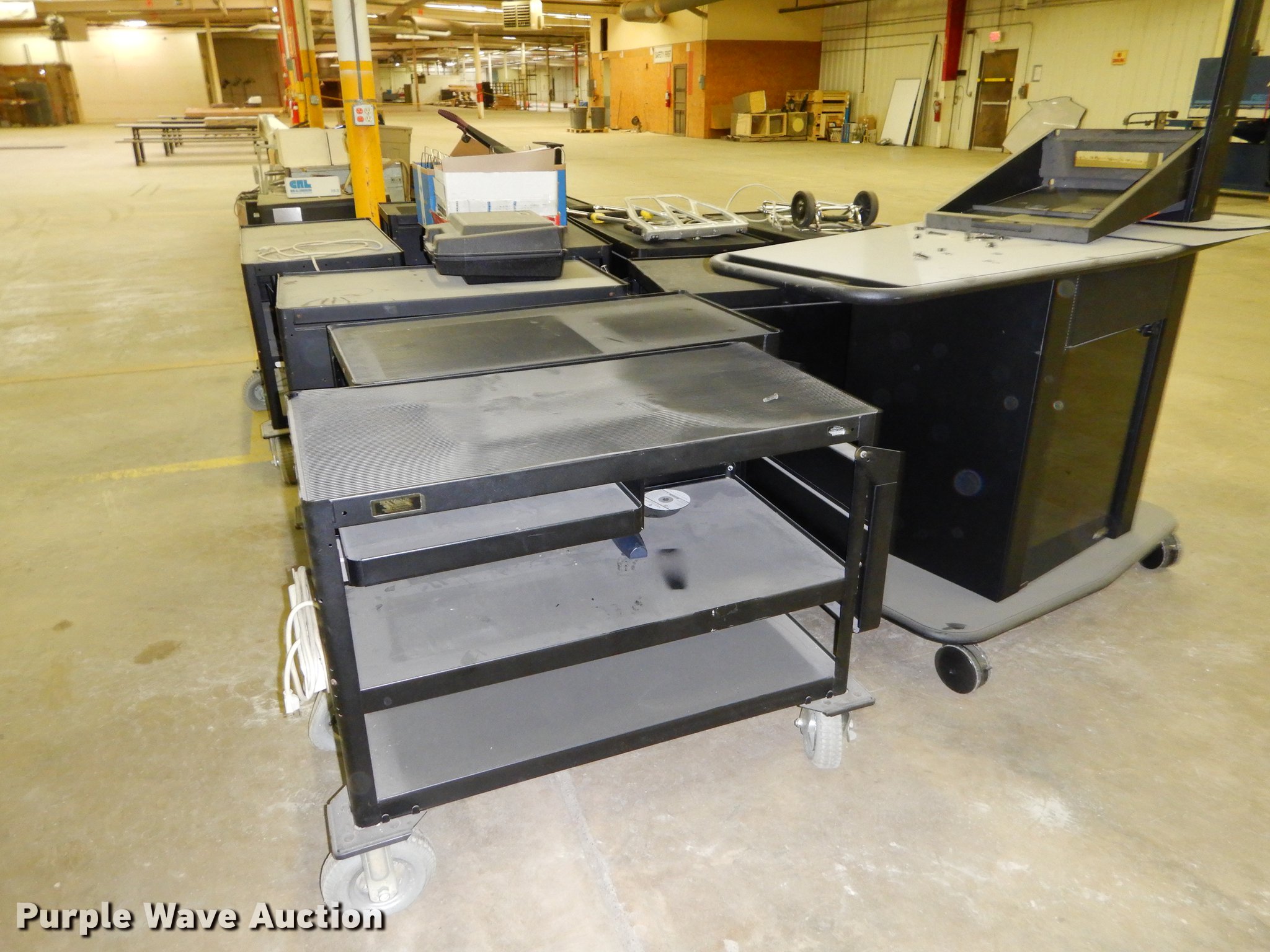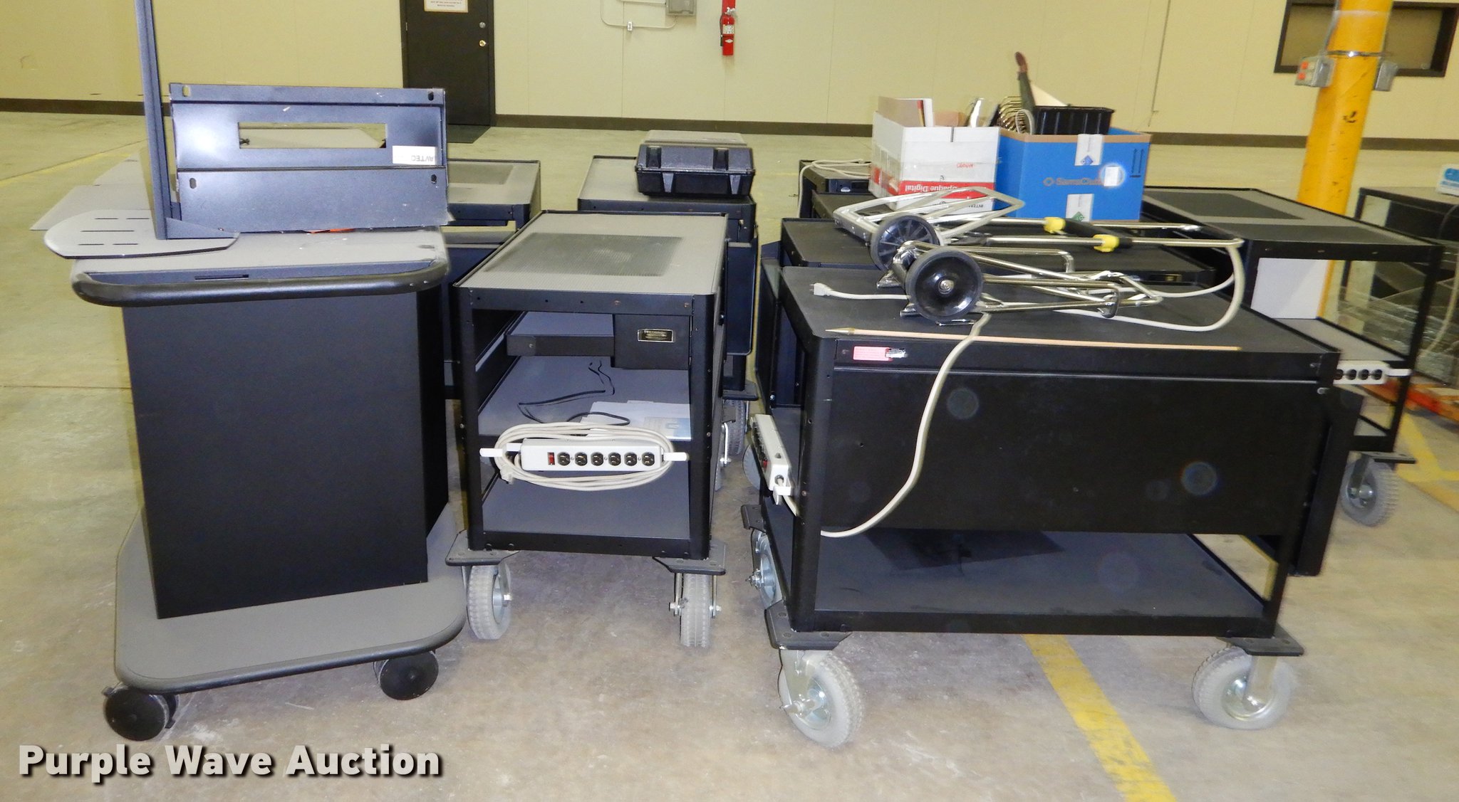Purple Wave is selling a used Office Supplies and Equip. in Kansas. This item is a Office supplies with the following: (2) chairs, (2) desks, (5) tables, (11) carts, (3) file cabinets, (5) dry erase boards, (4) metal desks, (4) cabinets, (7) school chairs, (2) smartboards, Unknown operating condition, (10) AV carts, (2) dollies, Ice machine, Unknown operating condition, (3) overhead projectors, (2) radios, (2) projector screens, (2) monitors, Approximately 30 CPU's, (2) box fans, (3) card racks, (2) motorcycle helmets, (6) restaurant tables, (9) booths