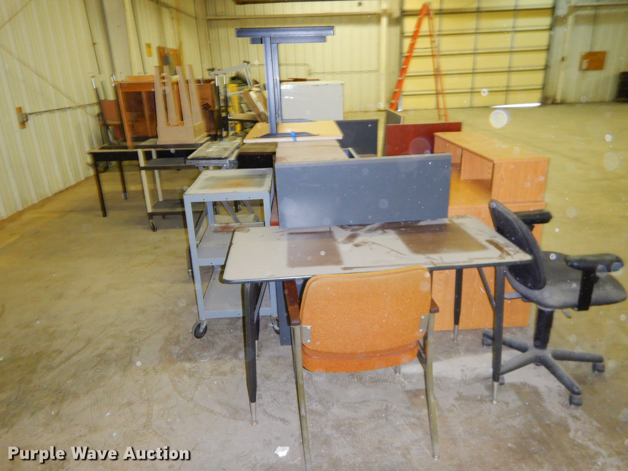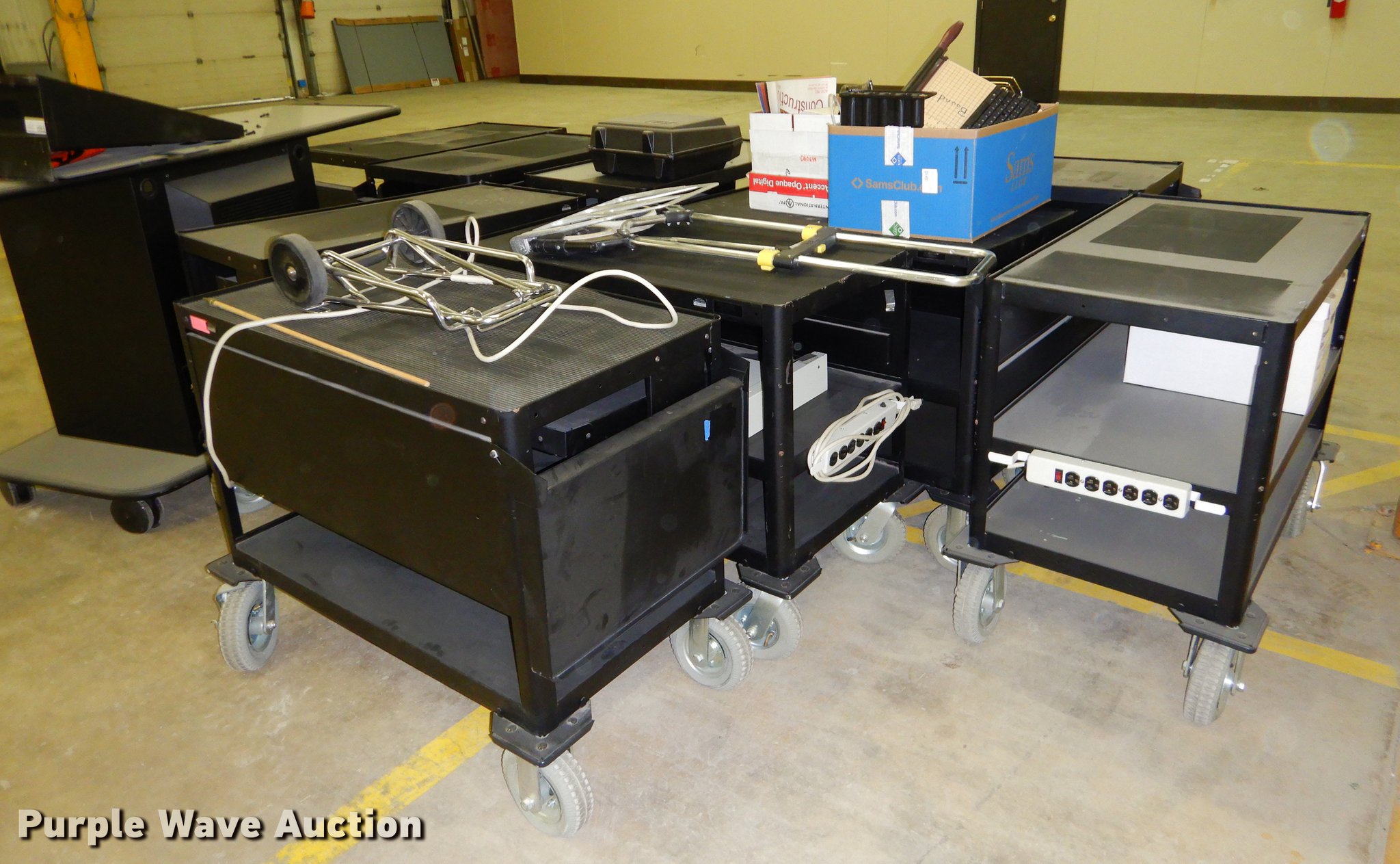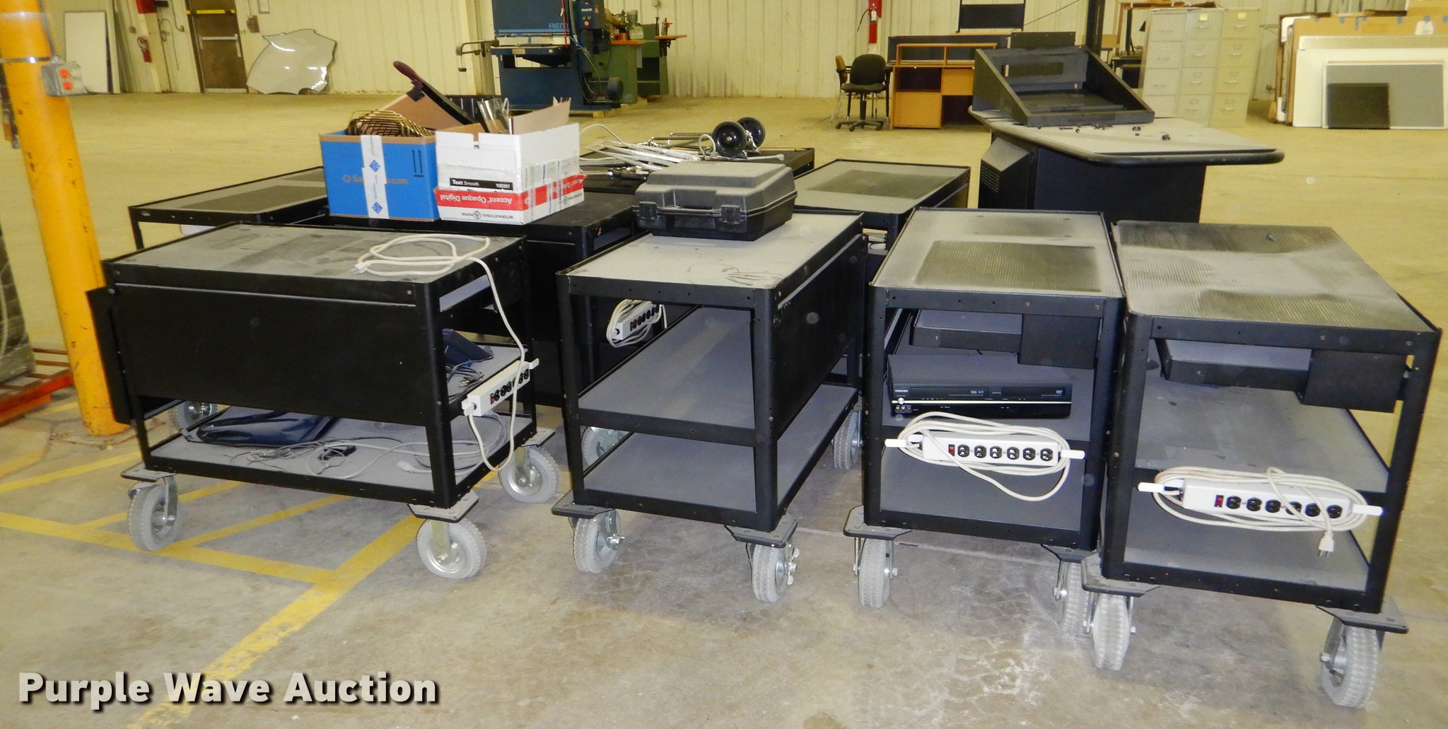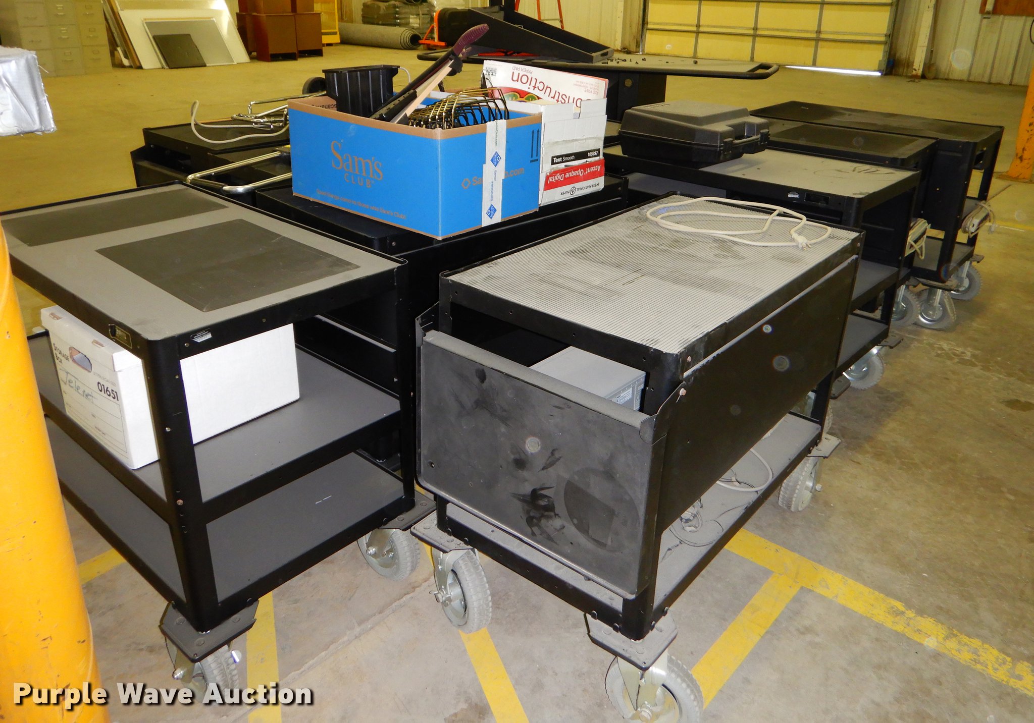 Purple Wave is selling a used Office Supplies and Equip. in Kansas. This item is a Office supplies with the following: (2) chairs, (2) desks, (5) tables, (11) carts, (3) file cabinets, (5) dry erase boards, (4) metal desks, (4) cabinets, (7) school chairs, (2) smartboards, Unknown operating condition, (10) AV carts, (2) dollies, Ice machine, Unknown operating condition, (3) overhead projectors, (2) radios, (2) projector screens, (2) monitors, Approximately 30 CPU's, (2) box fans, (3) card racks, (2) motorcycle helmets, (6) restaurant tables, (9) booths