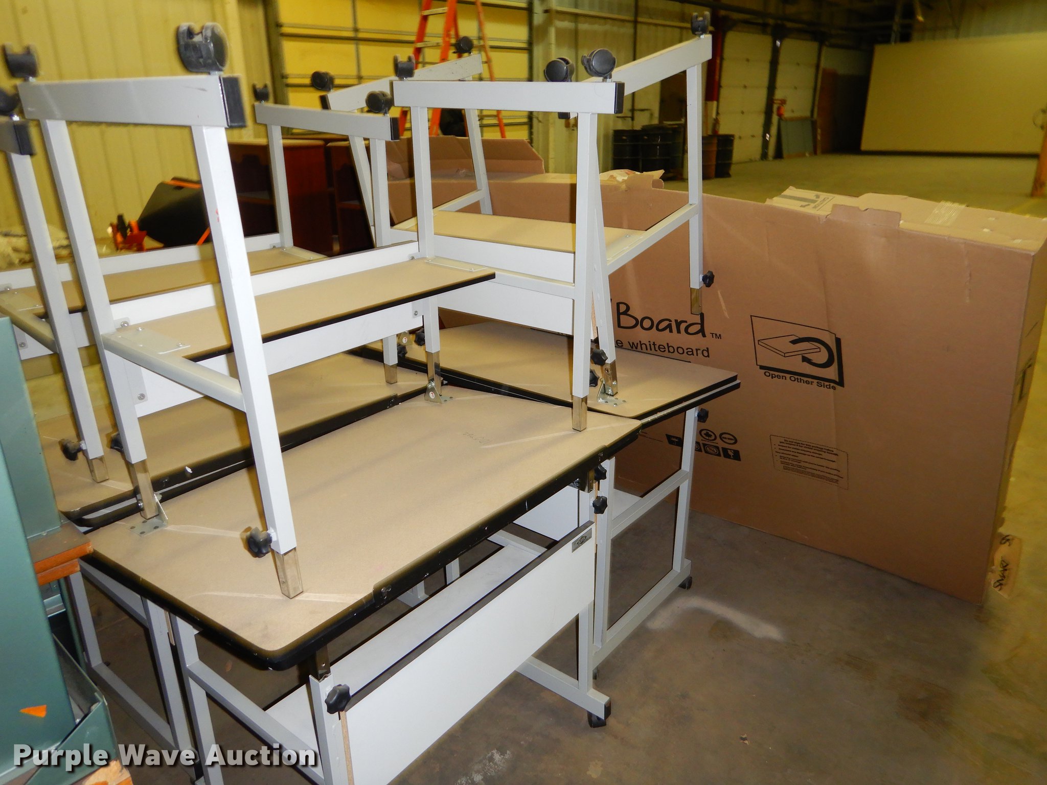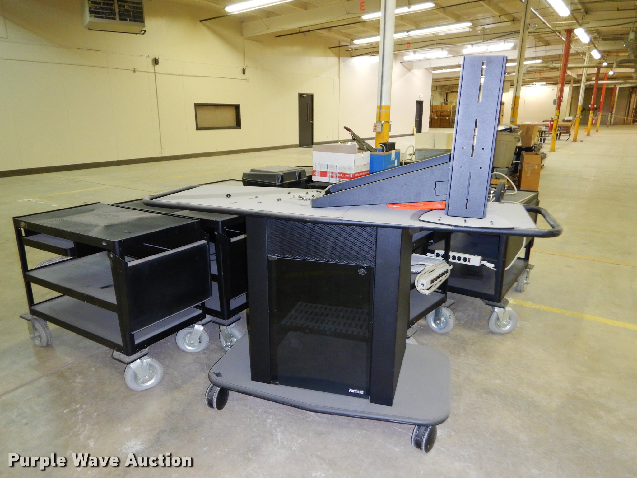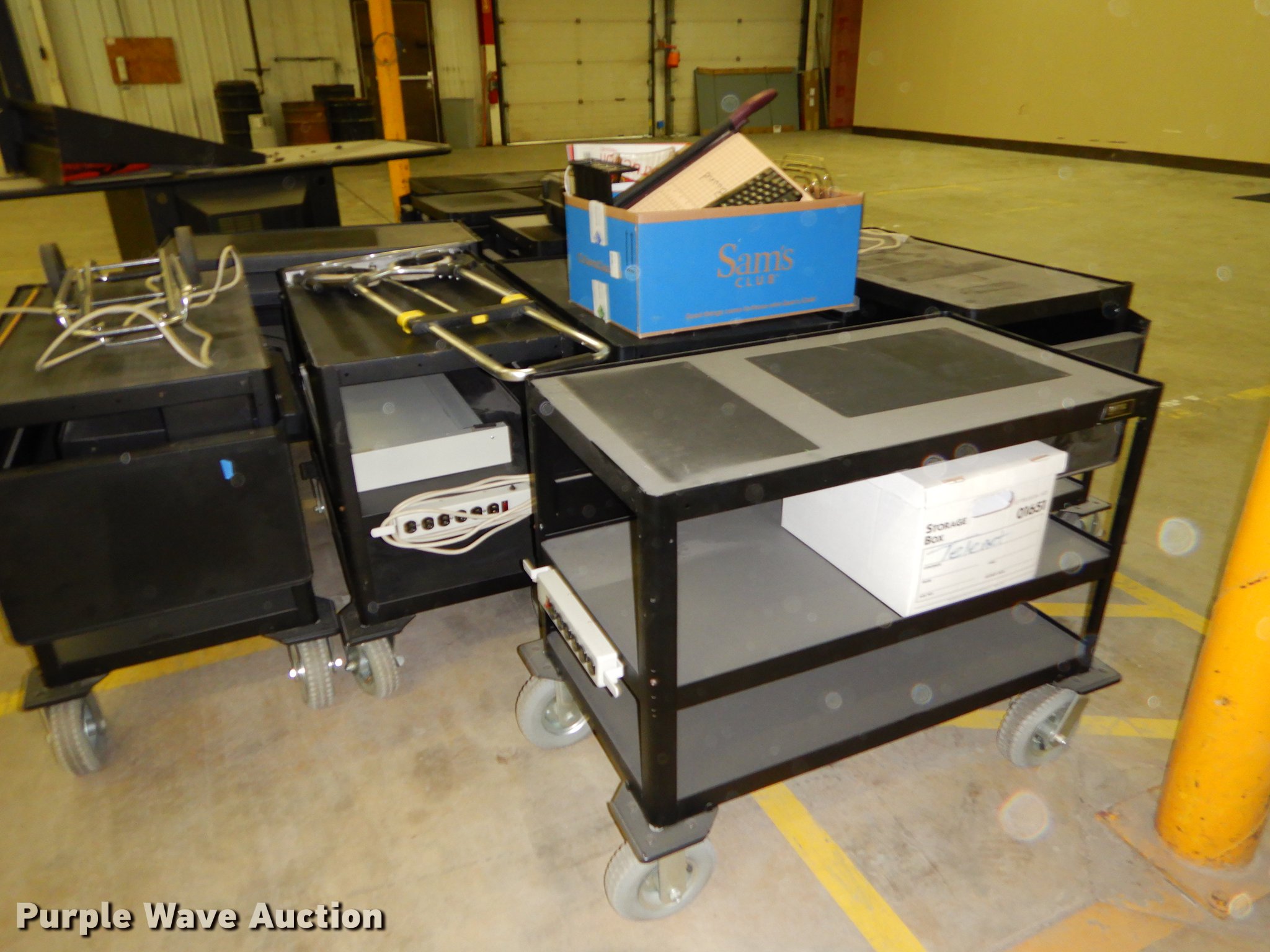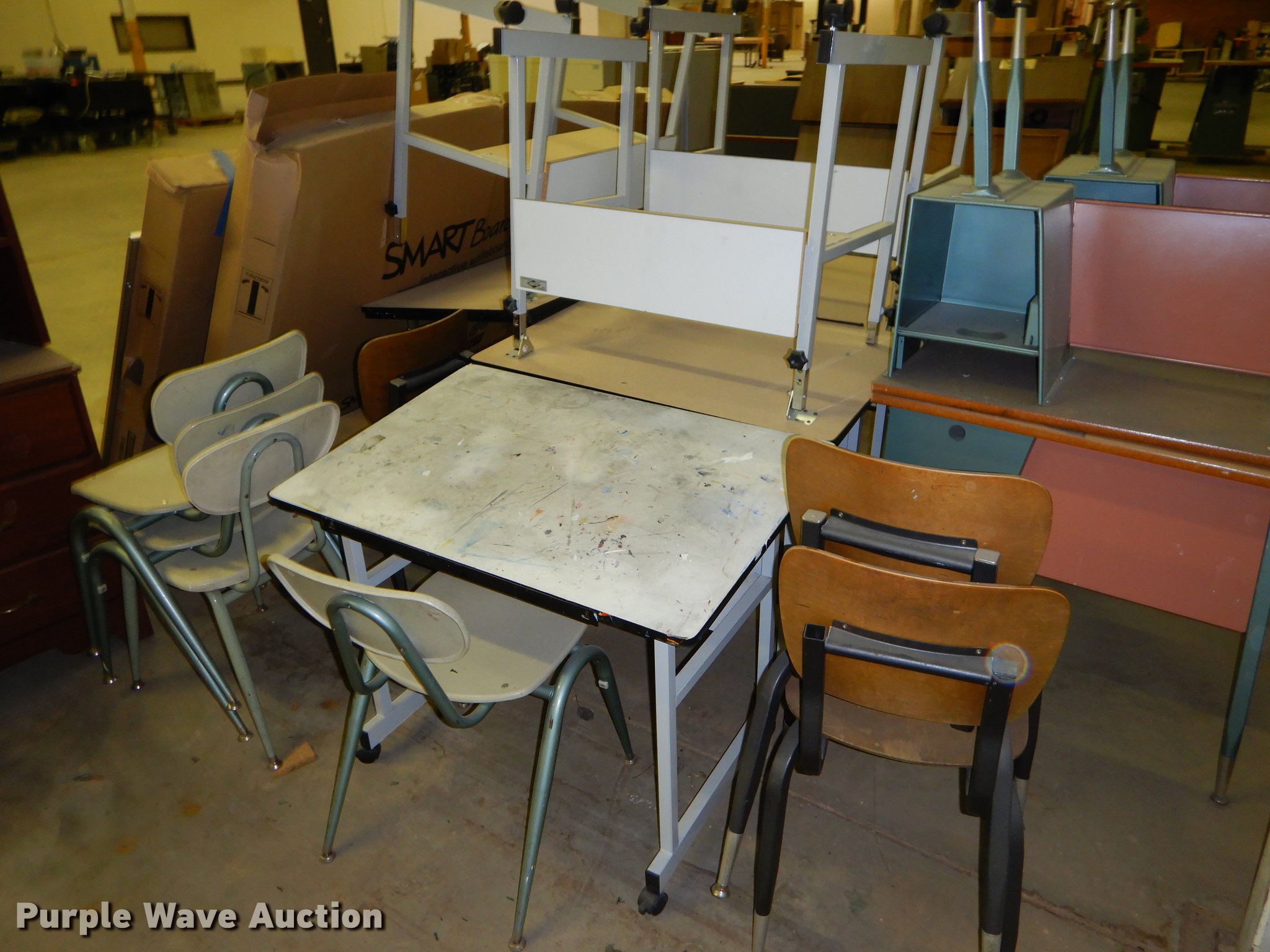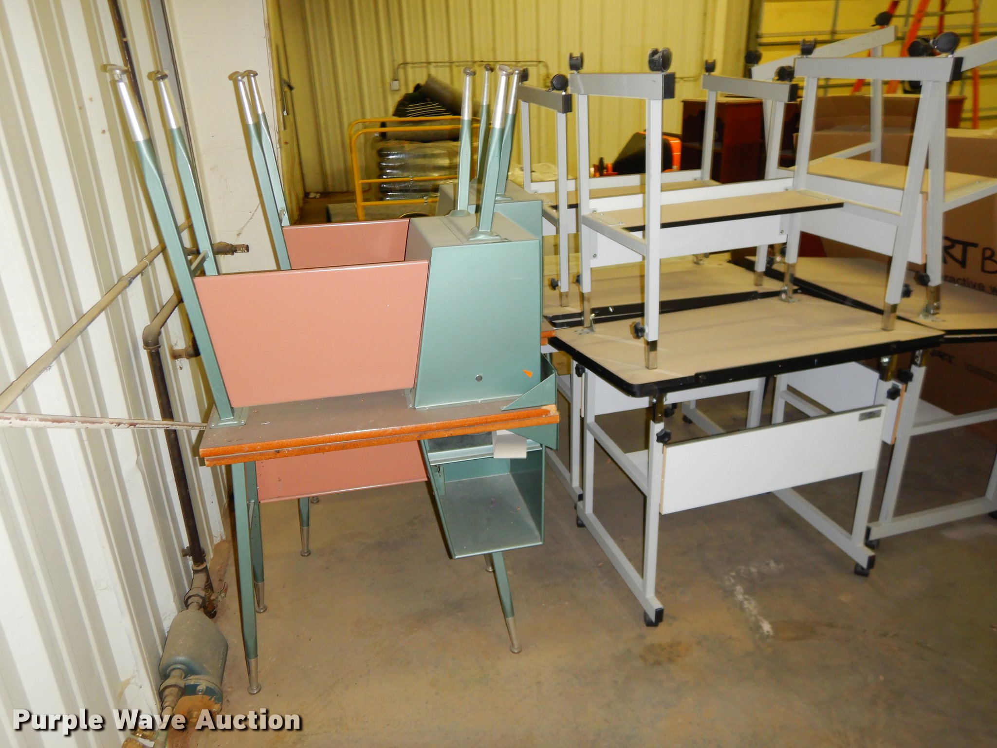 Purple Wave is selling a used Office Supplies and Equip. in Kansas. This item is a Office supplies with the following: (2) chairs, (2) desks, (5) tables, (11) carts, (3) file cabinets, (5) dry erase boards, (4) metal desks, (4) cabinets, (7) school chairs, (2) smartboards, Unknown operating condition, (10) AV carts, (2) dollies, Ice machine, Unknown operating condition, (3) overhead projectors, (2) radios, (2) projector screens, (2) monitors, Approximately 30 CPU's, (2) box fans, (3) card racks, (2) motorcycle helmets, (6) restaurant tables, (9) booths