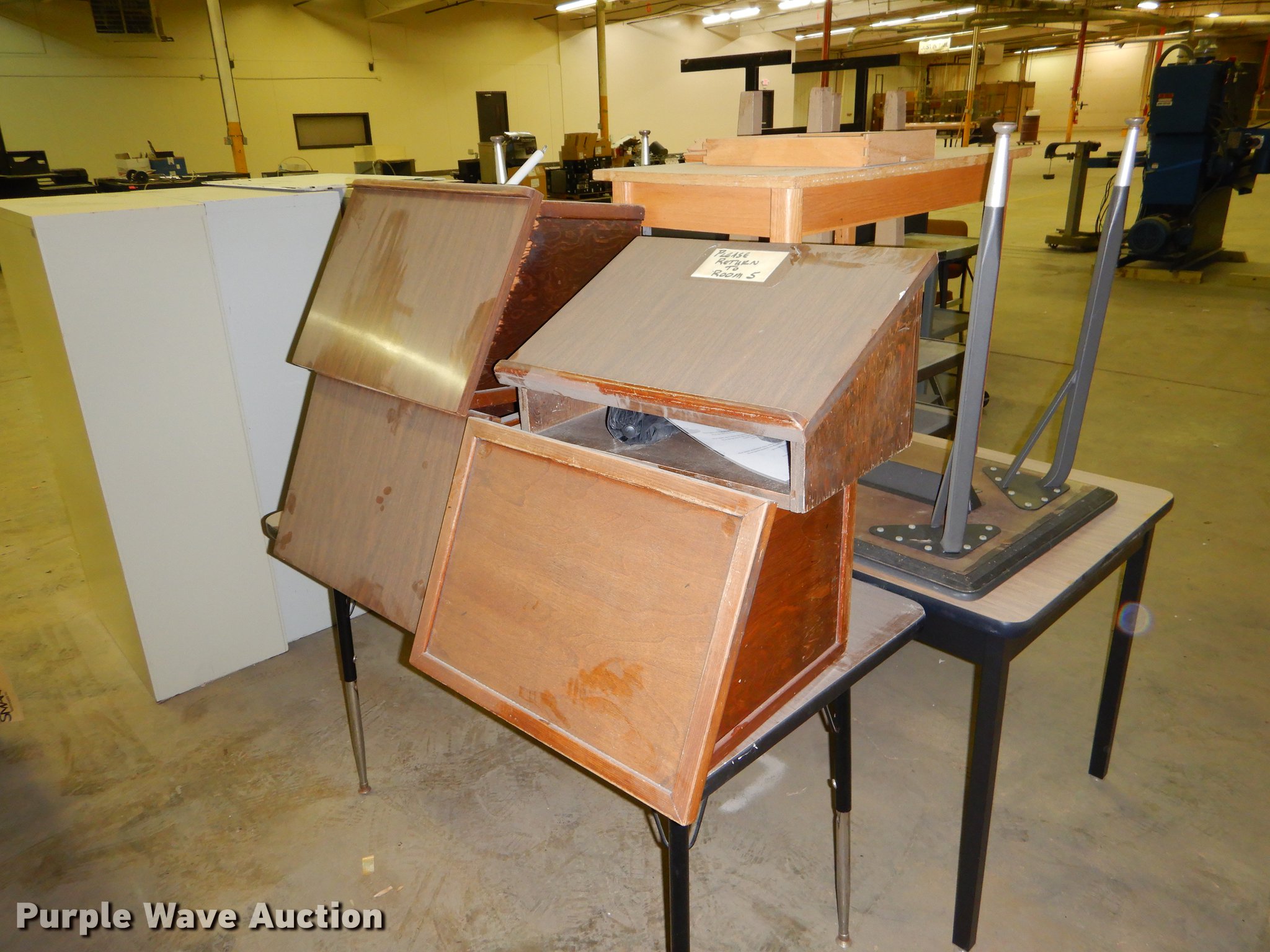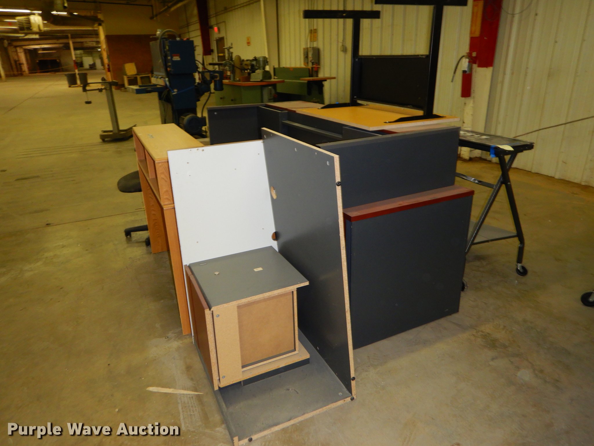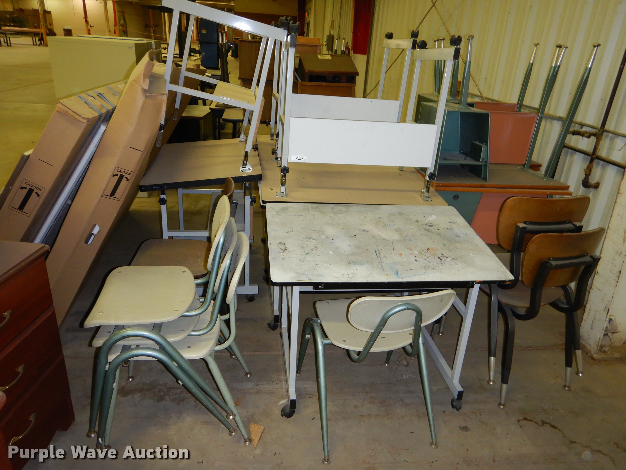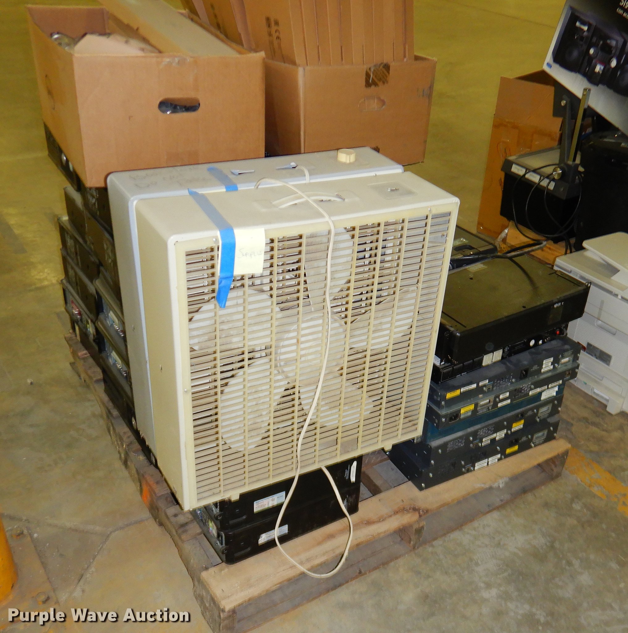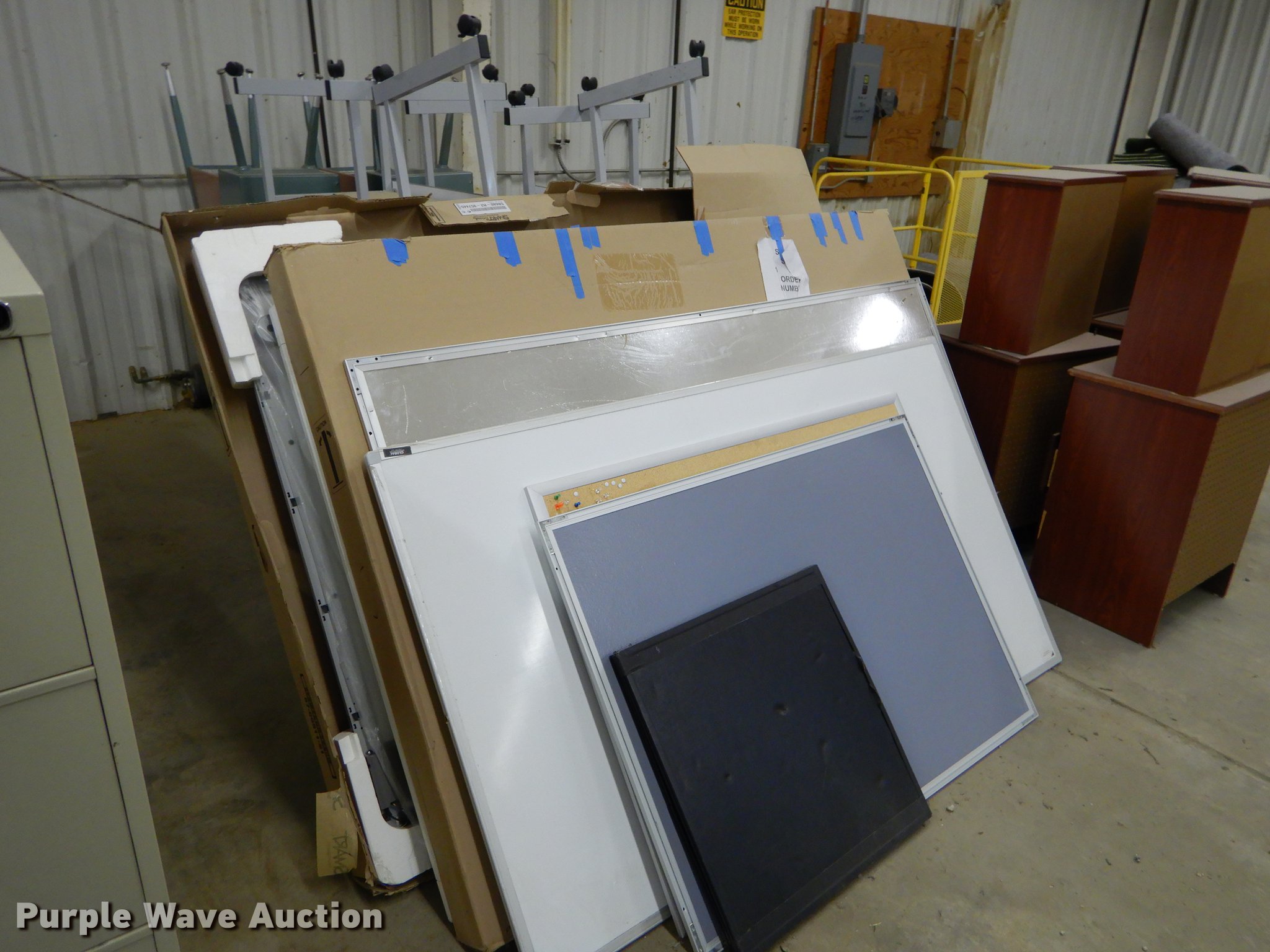 Purple Wave is selling a used Office Supplies and Equip. in Kansas. This item is a Office supplies with the following: (2) chairs, (2) desks, (5) tables, (11) carts, (3) file cabinets, (5) dry erase boards, (4) metal desks, (4) cabinets, (7) school chairs, (2) smartboards, Unknown operating condition, (10) AV carts, (2) dollies, Ice machine, Unknown operating condition, (3) overhead projectors, (2) radios, (2) projector screens, (2) monitors, Approximately 30 CPU's, (2) box fans, (3) card racks, (2) motorcycle helmets, (6) restaurant tables, (9) booths