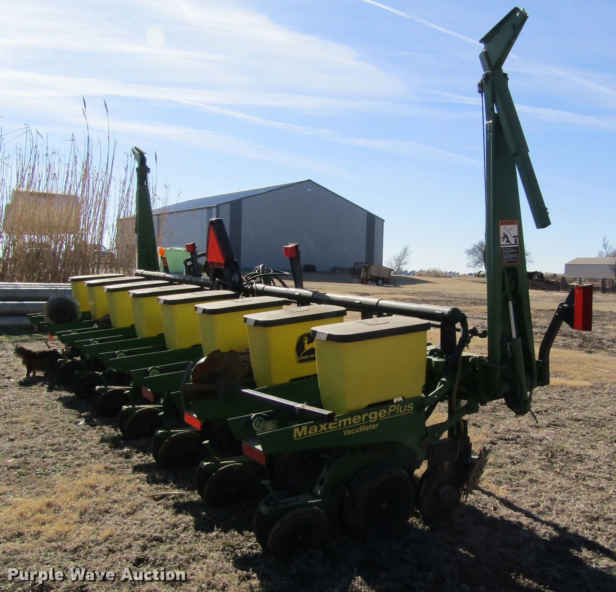 Purple Wave is selling a used Planter in Kansas. This item is a John Deere 1700 Max Emerge Plus no-till planter with the following: Eight rows, 30" row spacing, Marker arms, Individual seed hoppers, Vacuum metering, Ground meter drive, Corn, soybean, milo, sunflower, and small and large corn seed meters, Row cleaners, No-till coulters, Double disk openers, Double rubber closing system, Insecticide boxes, Liquid hose with Banjo fittings, John Deere Trak 250 monitor, Three point, (2) 7.50-15 drive/outside tires, Additional parts included, Stored inside, Serial H01700R685341