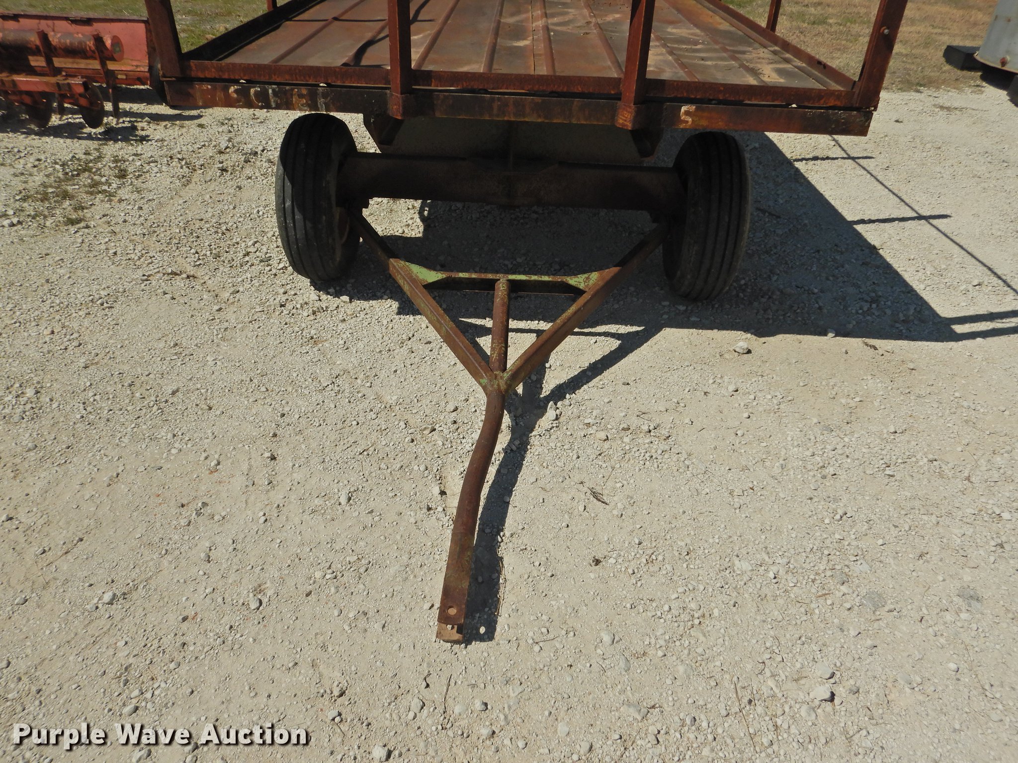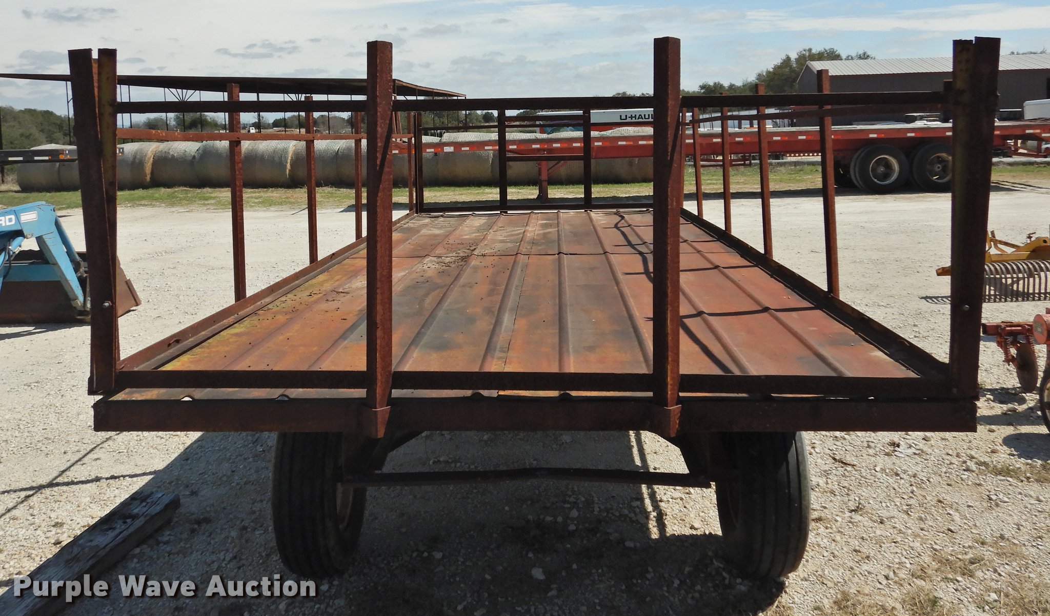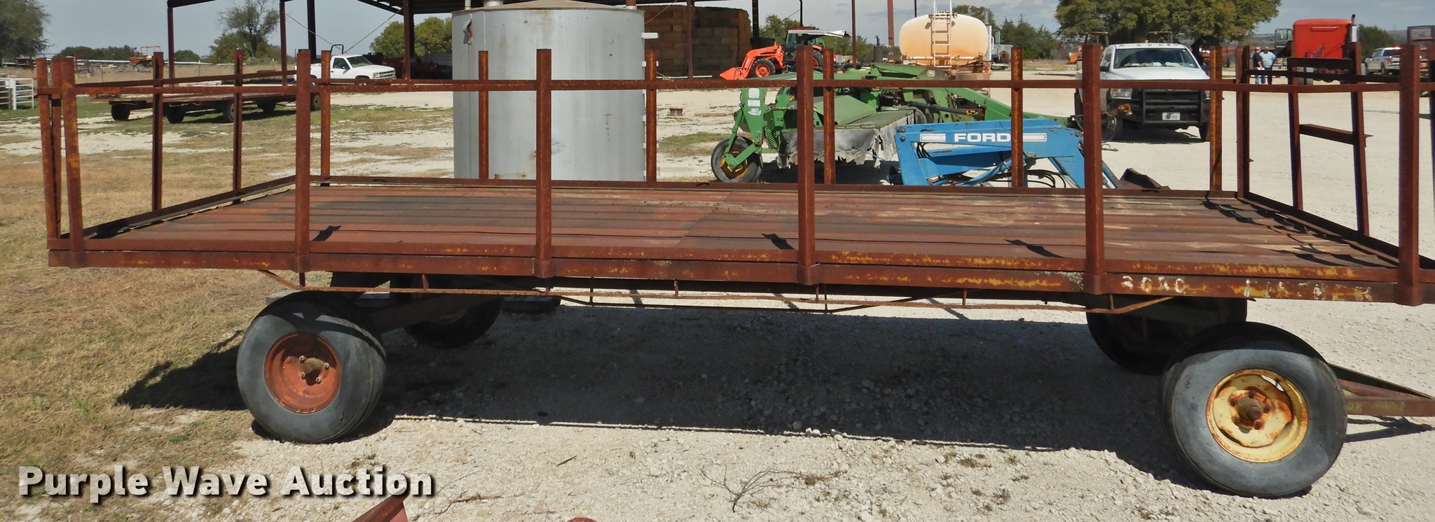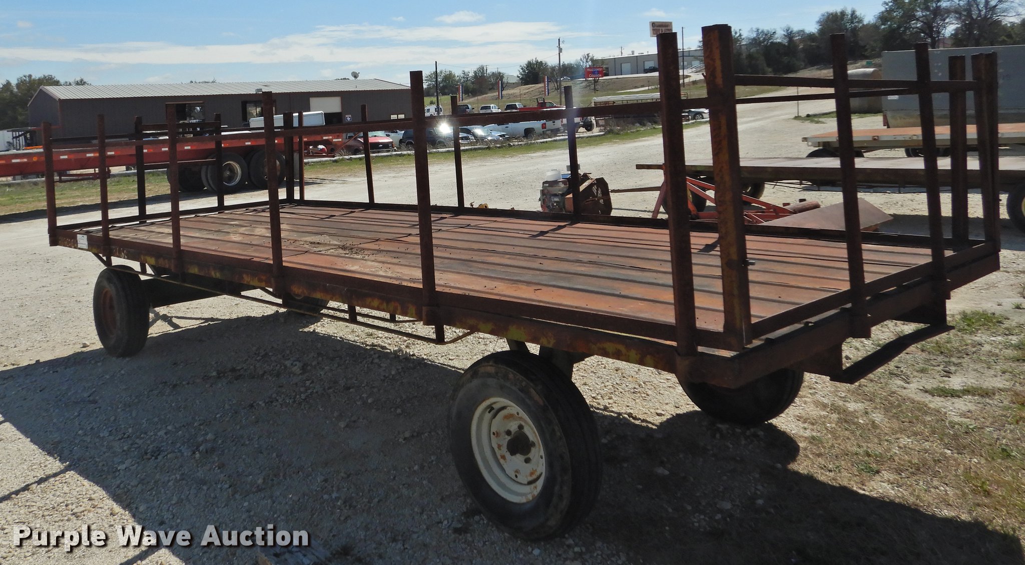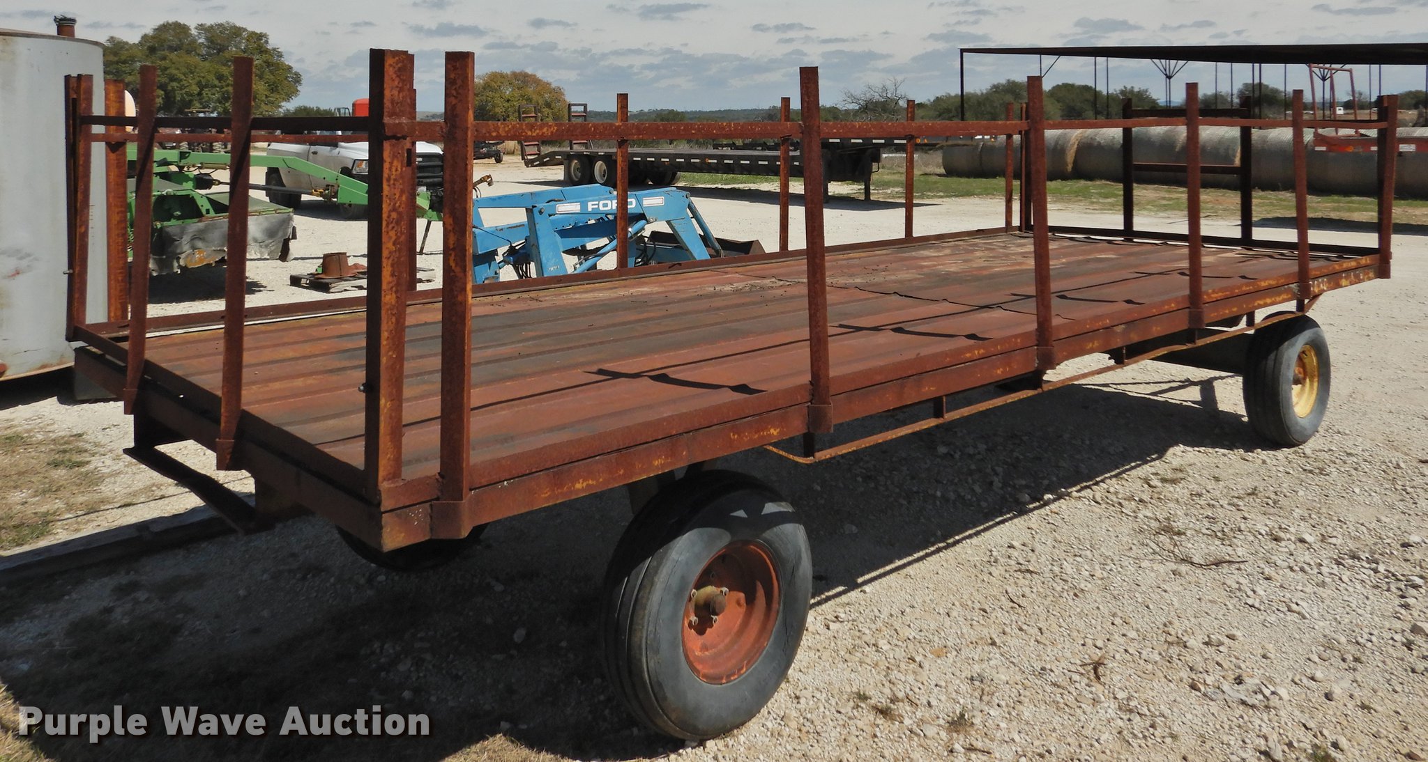 Purple Wave is selling a used Hay Handling in Texas. This item is a Shop built hay wagon with the following: 24'10"L x 7'8"W overall, 19'10"L steel deck, 3'H stake sides, Pin hitch, Steel wheels, 9.5L-14 tires