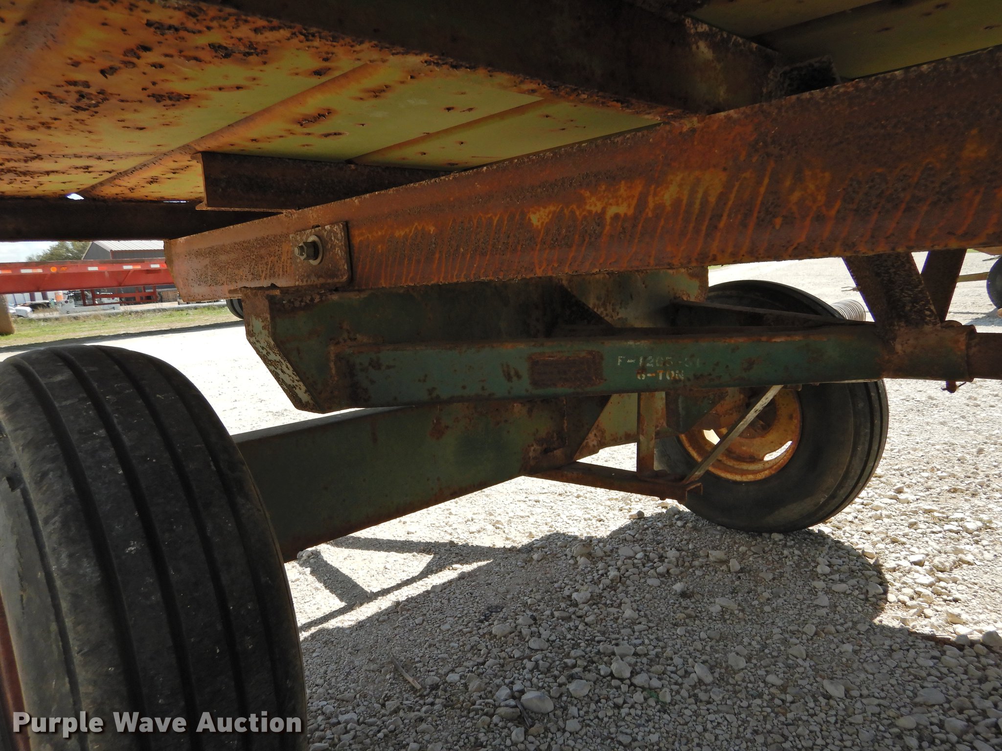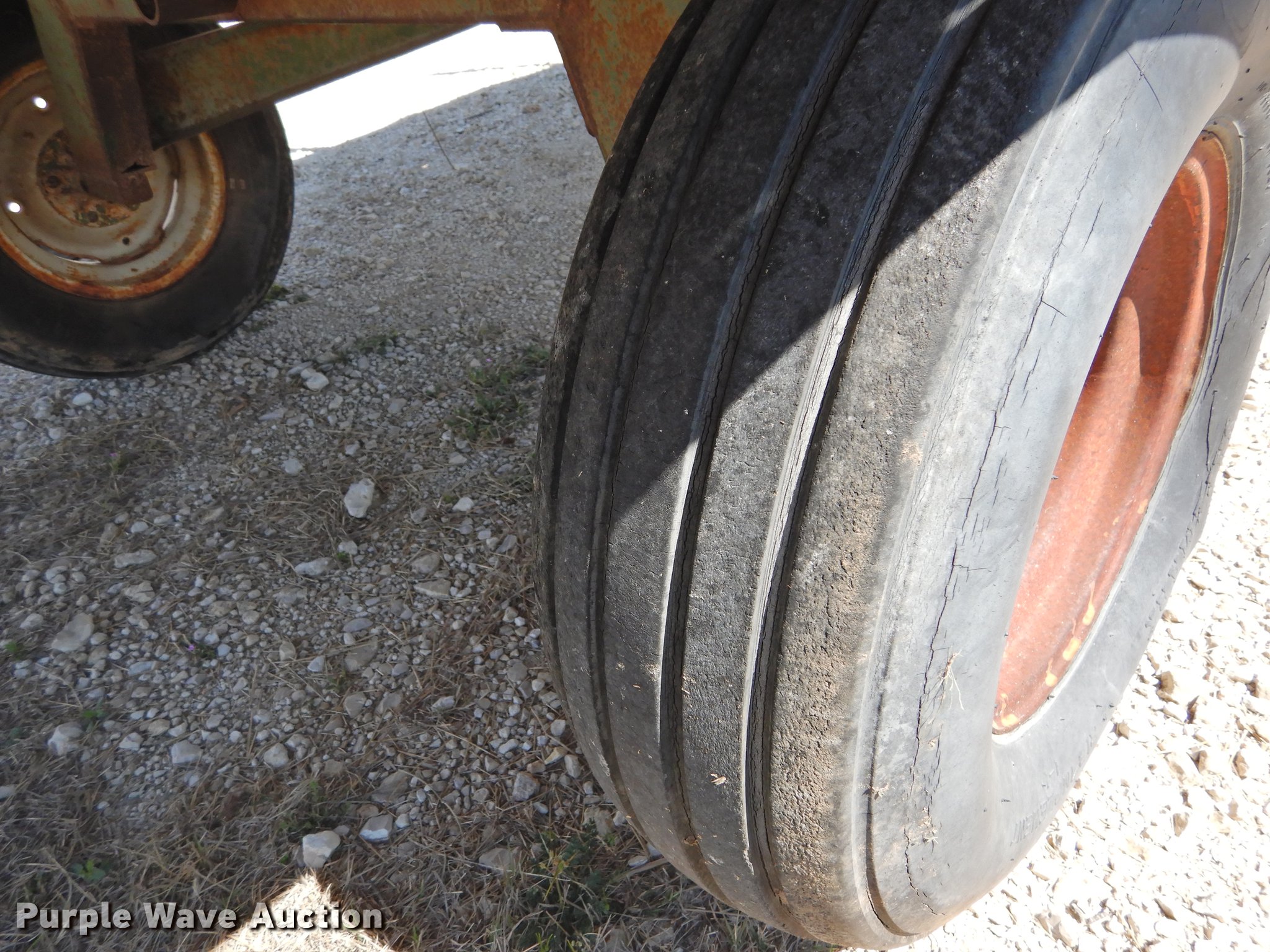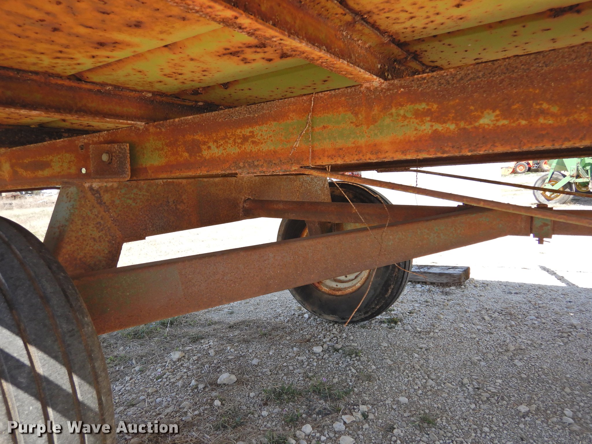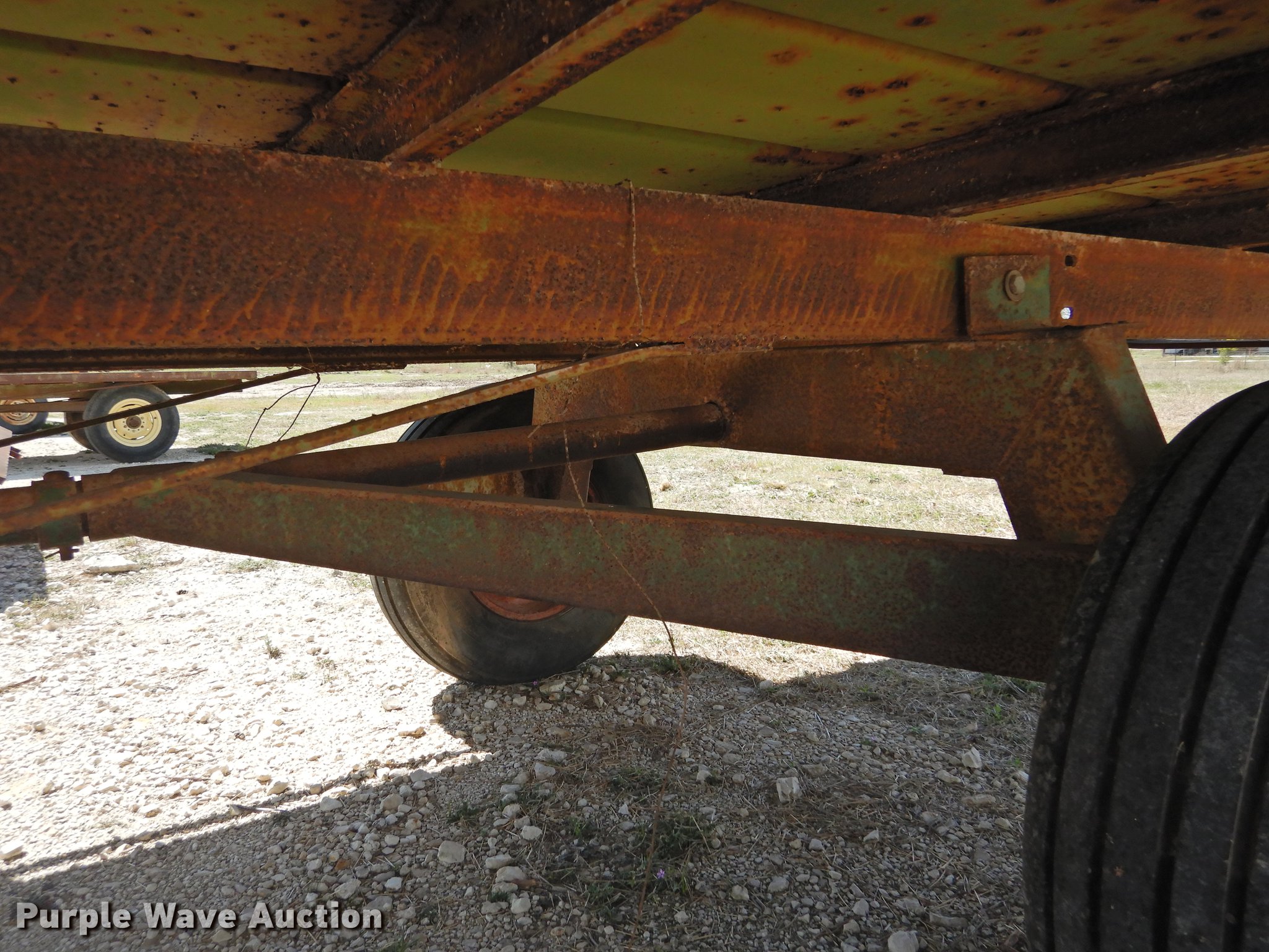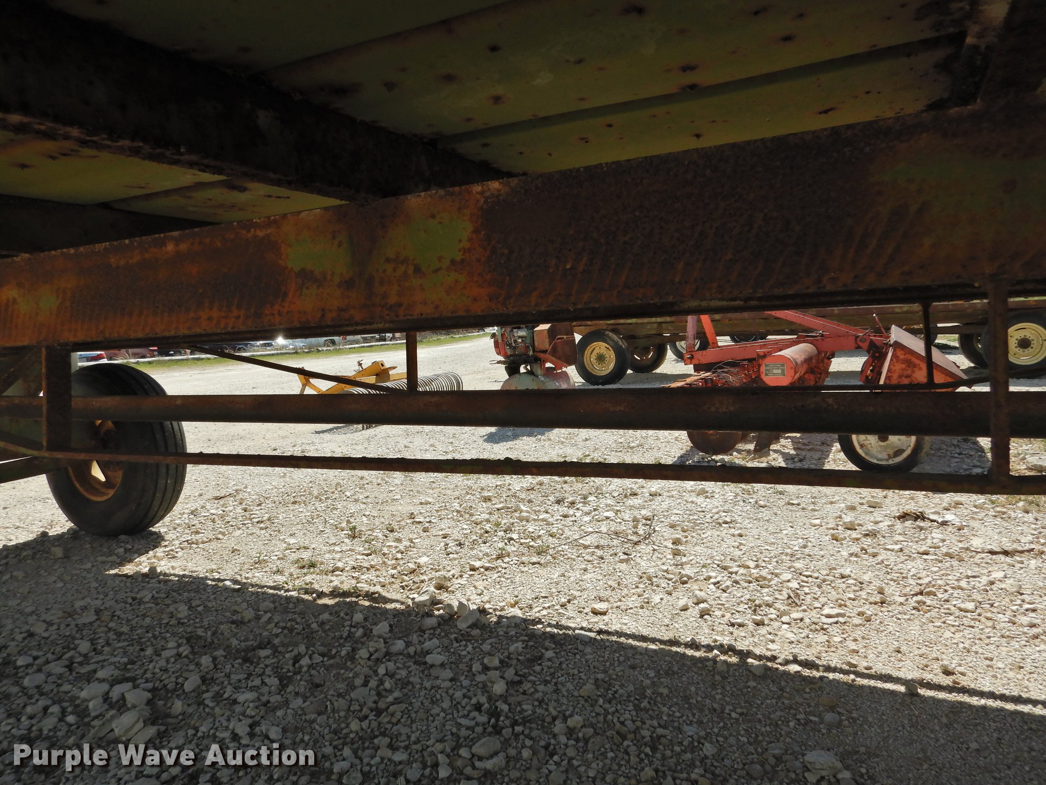 Purple Wave is selling a used Hay Handling in Texas. This item is a Shop built hay wagon with the following: 24'10"L x 7'8"W overall, 19'10"L steel deck, 3'H stake sides, Pin hitch, Steel wheels, 9.5L-14 tires