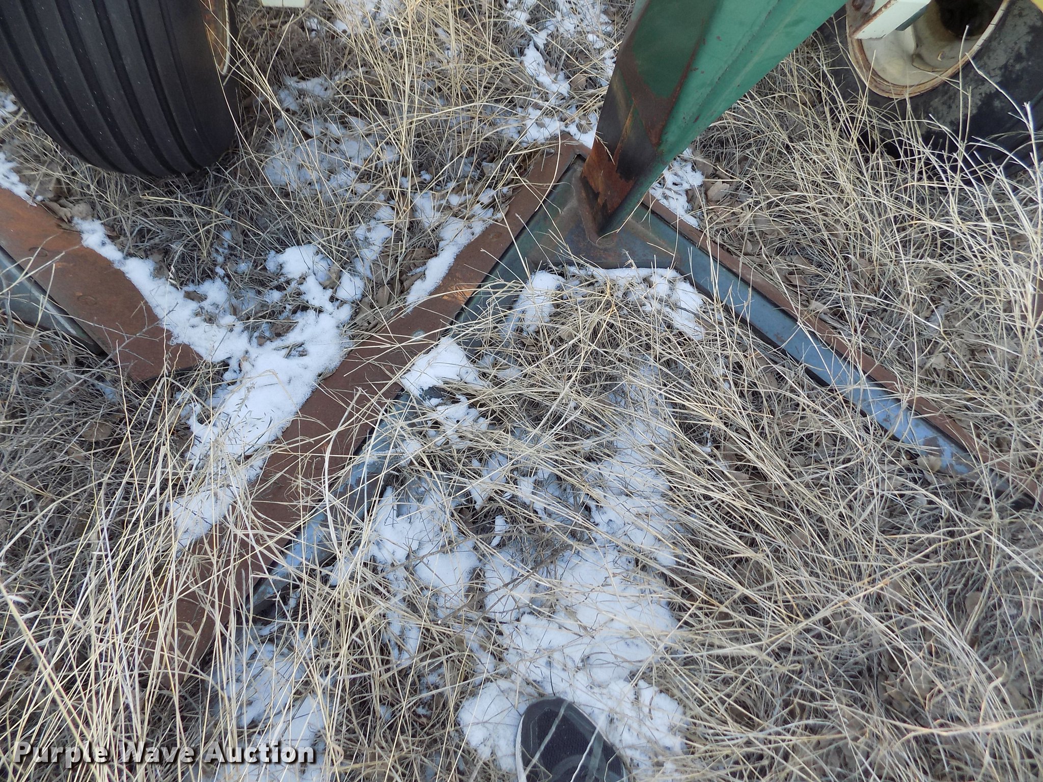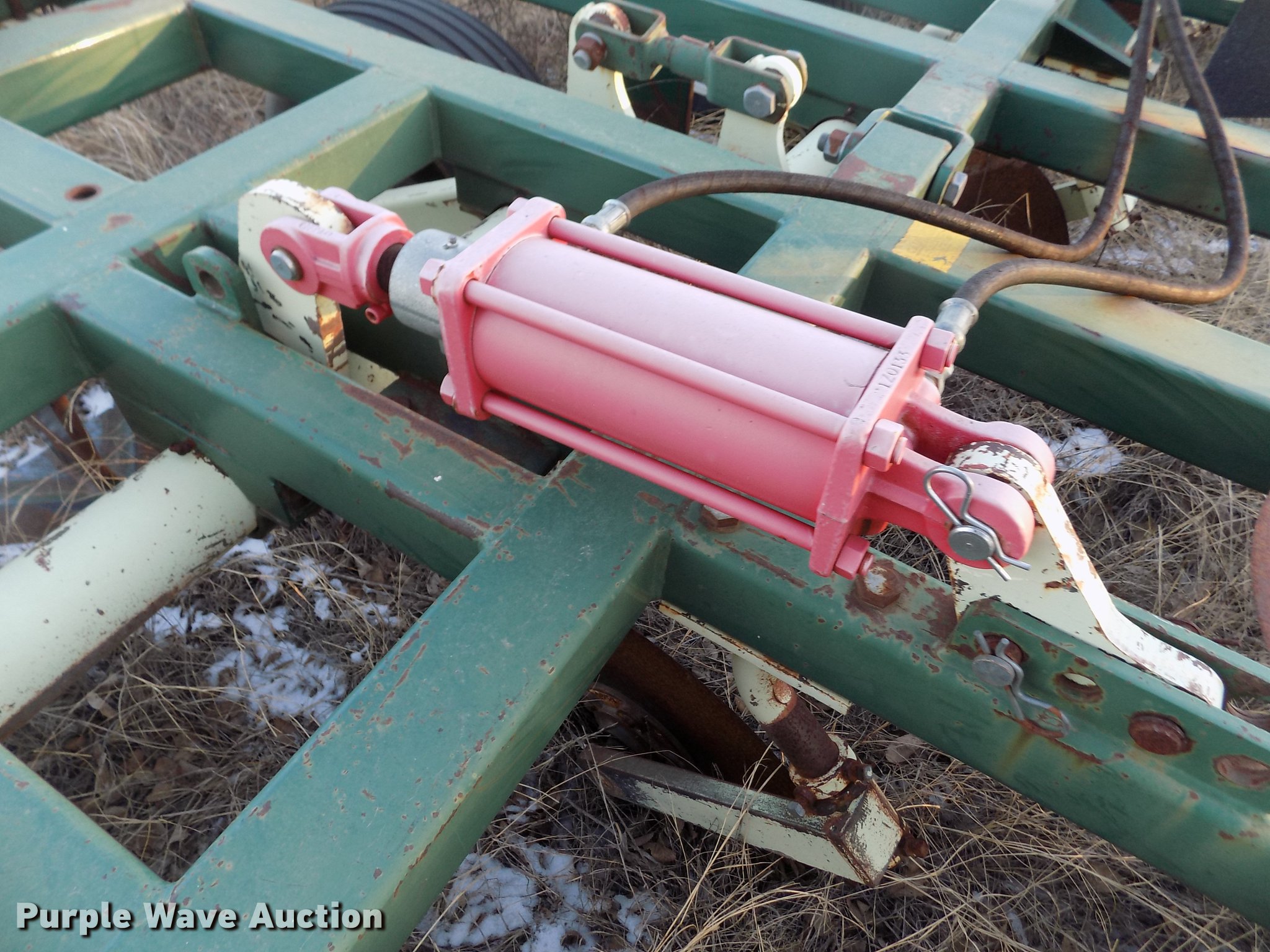 Purple Wave is selling a used Field Cultivator or Sweep Plow in Kansas. This item is a Flex King 5X5 sweep plow with the following: 25'W overall, (5) 60"W sweeps, Degelman three bar tine harrow, Manual leveler, Hydraulic lift and fold, Slab hitch, Rear hitch, 9.5L-15 tires, Hoses showing wear