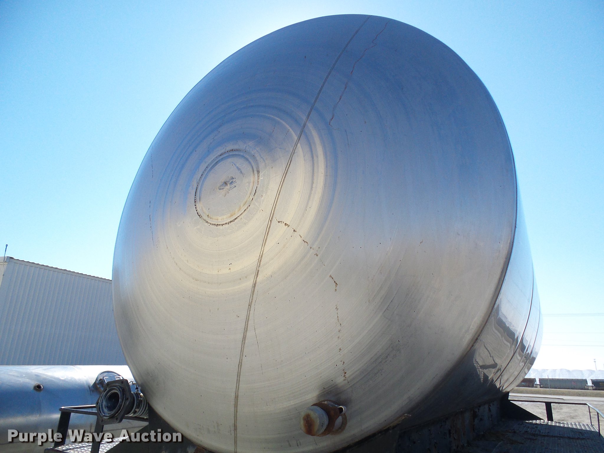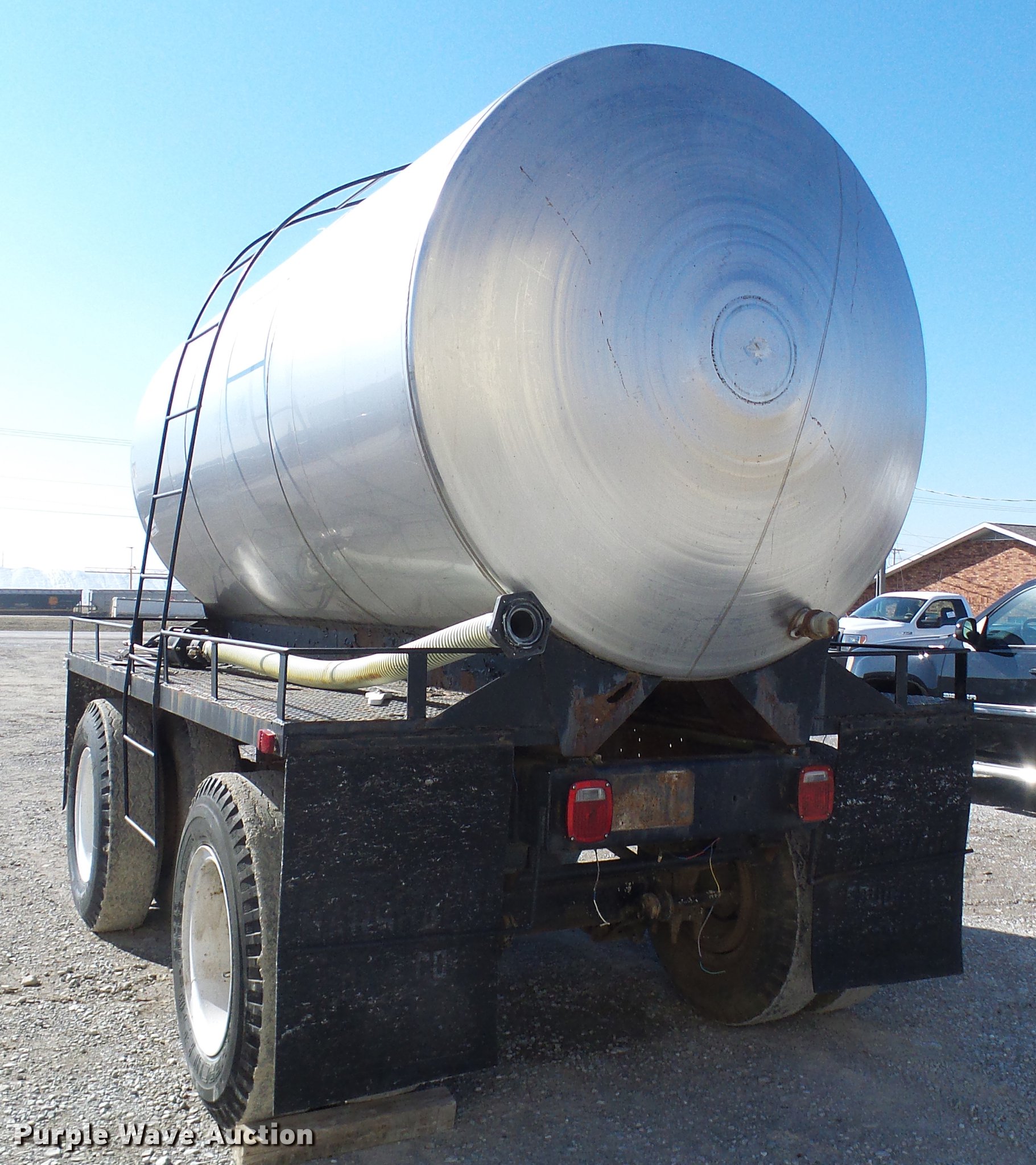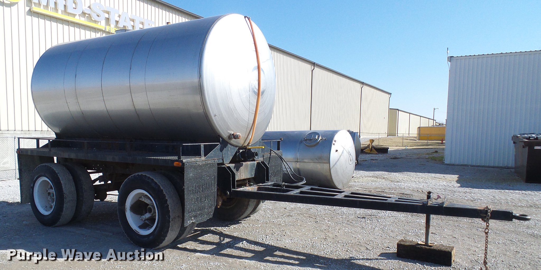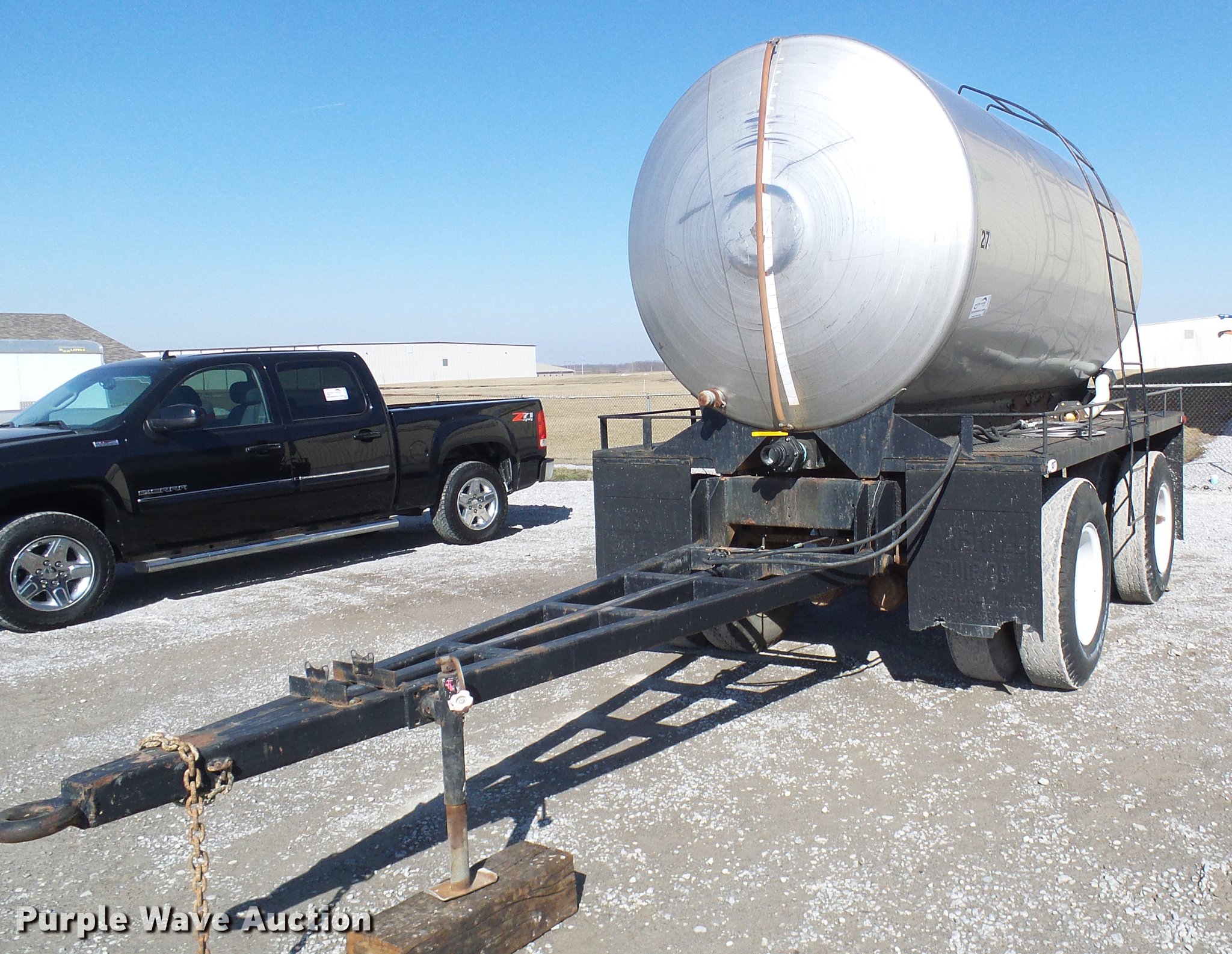 Purple Wave is selling a used Tank Trailer in Missouri. This item is a 1983 shop built tank trailer with the following: 12'L x 8'W, 12'L stainless steel tank, 3,000 gallon capacity, Sight glass, Hoses, Top fill, Pintle hitch, Single leg landing gear, Spread axle, Spring suspension, Air brakes, Steel wheels, 10.00-20 tires, Tank leak at valve, Unit# 27