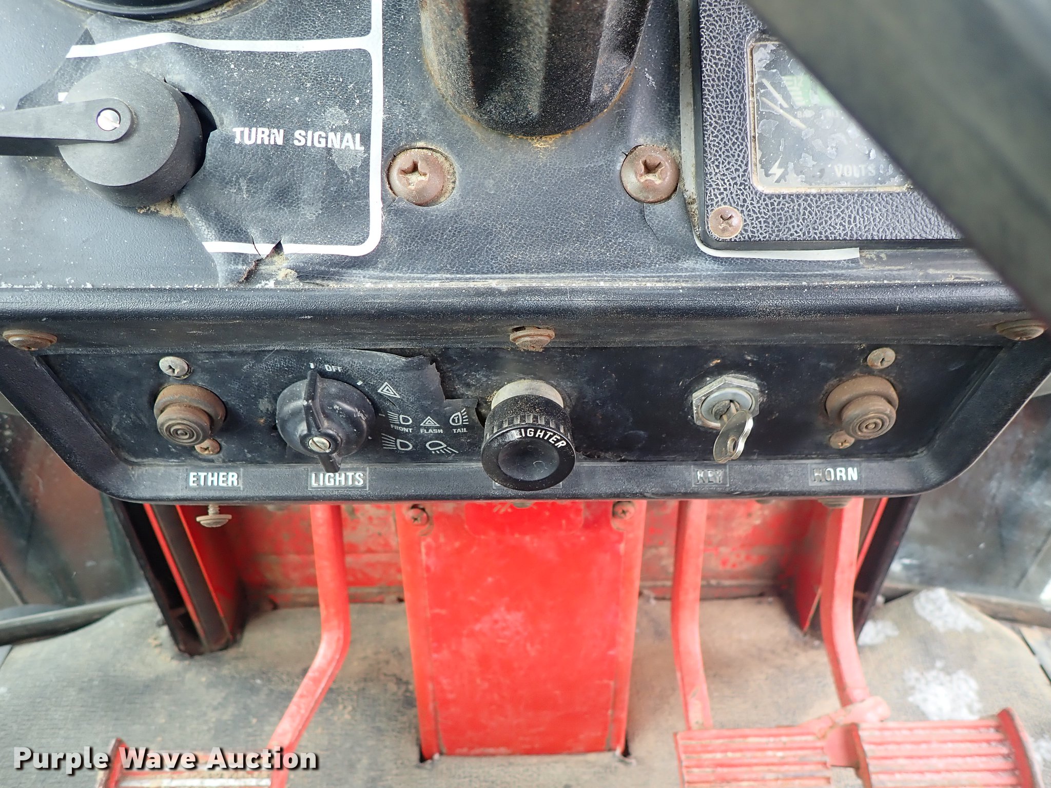 Purple Wave is selling a used Tractor in Kansas. This item is a International F986 tractor with the following: 6,895 hours on meter, International 7.1L six cylinder diesel engine, Torque Amplifier transmission, 16F-8R gears, EROPS enclosed cab, AC and heat, Westendorf Allmatic WL42 loader, 84"W bucket, Bale spear, Quick attach, Three point, 540/1000 PTO, (2) rear hydraulic remote sets, 10.00-16 front tires, 18.4-28 rear tires, Dual rear tires included, One tire damaged