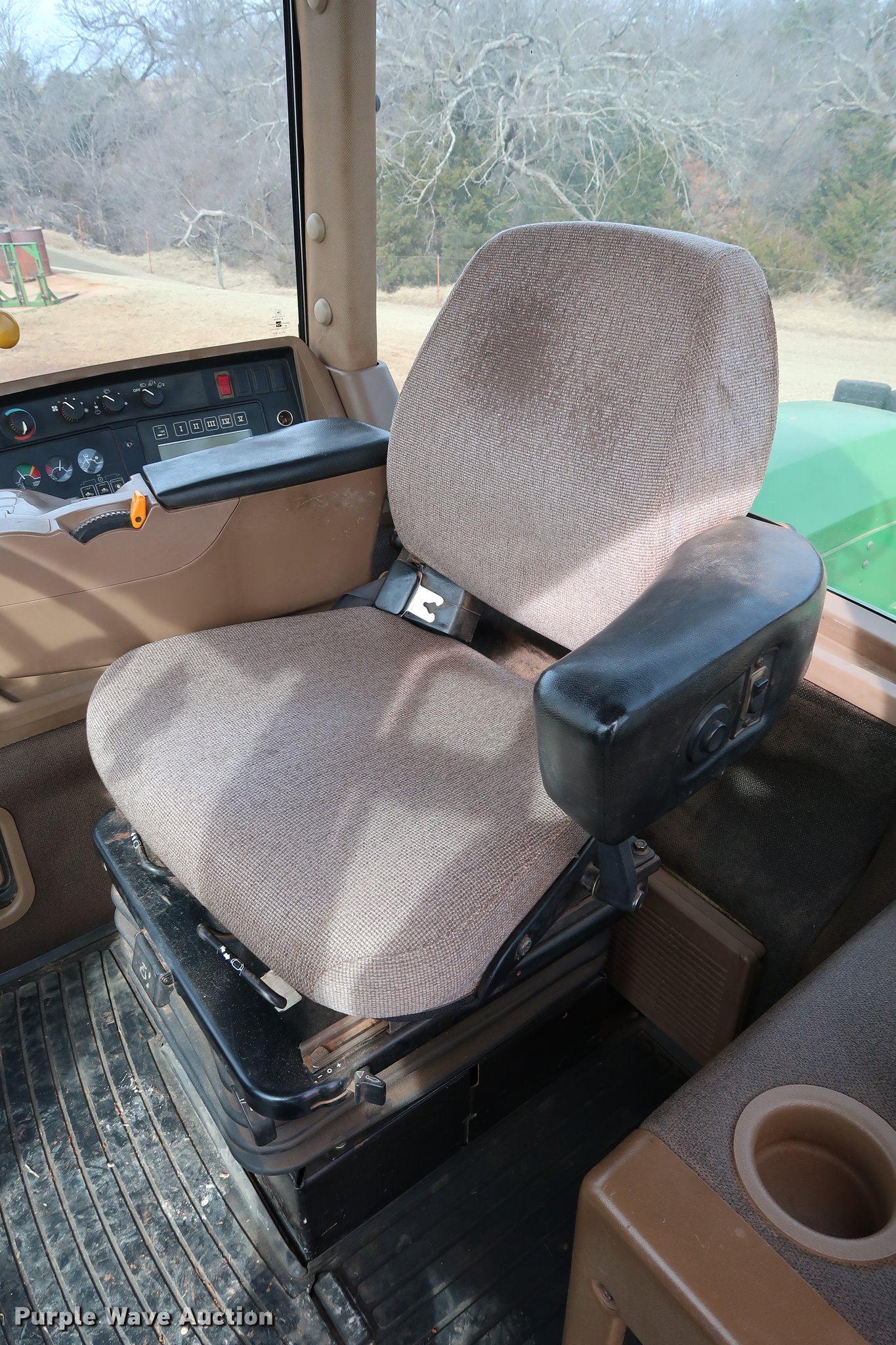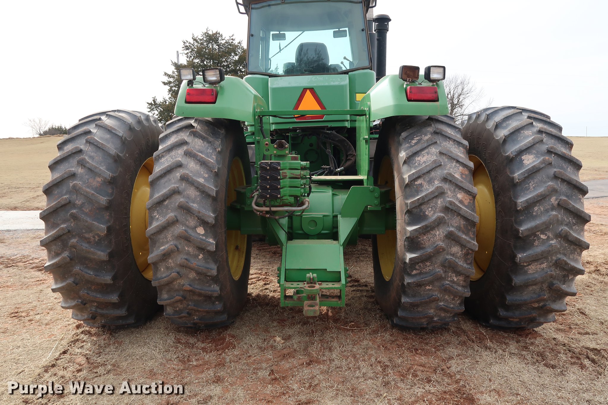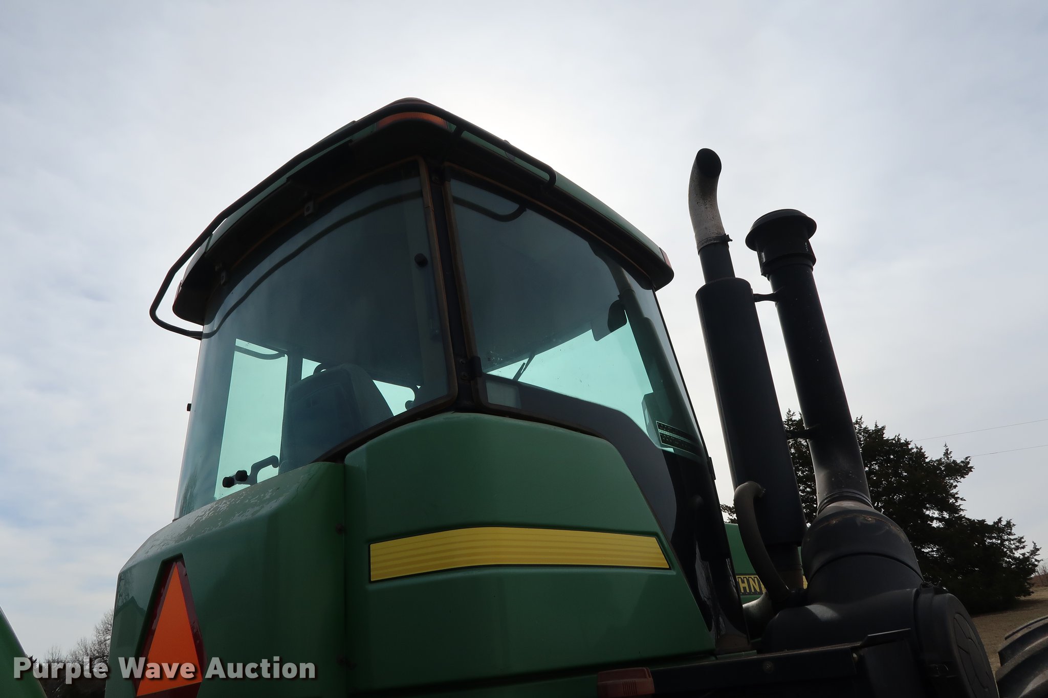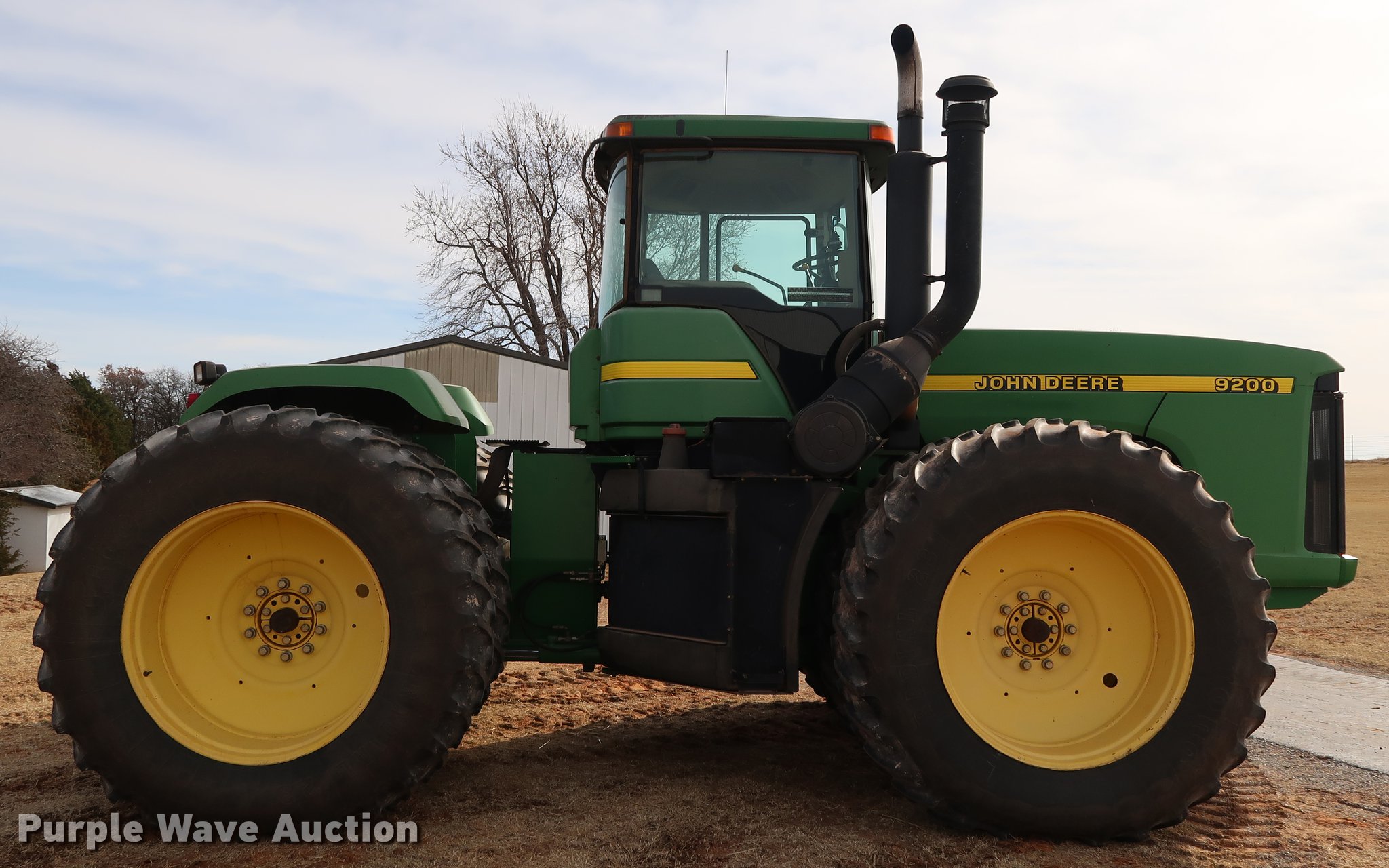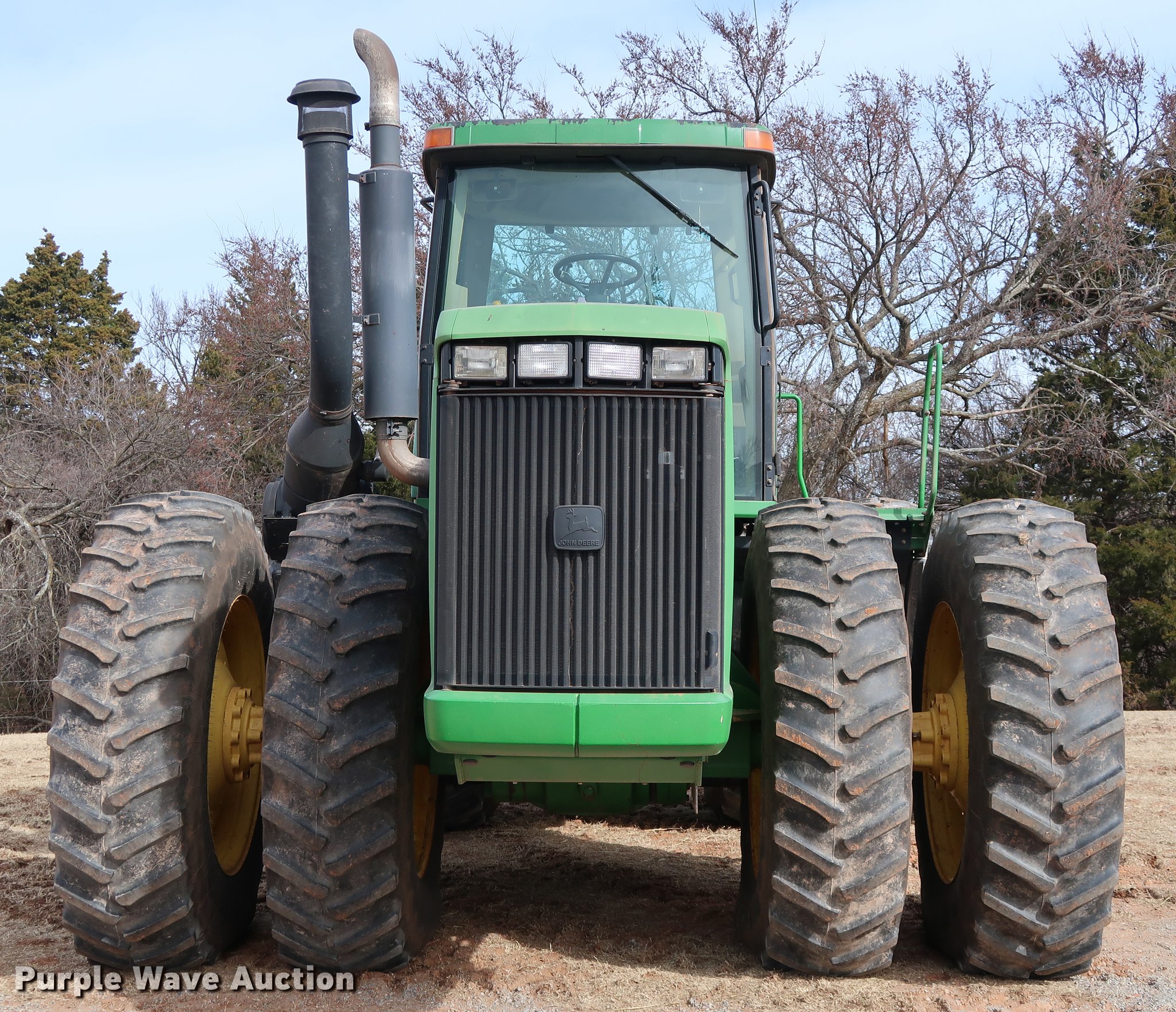 Purple Wave is selling a used Articulated 4-Wheel Drive Tractor in Oklahoma. This item is a 1998 John Deere 9200 4WD tractor with the following: 8,591 hours on meter, John Deere 6105HRW01 10.5L six cylinder turbo diesel engine, 310 HP, Serial RG6105H002956, PowrSync transmission, 24F-6R gears, Differential lock, AC and heat, Tilt steering wheel, AM/FM, Suspension seat, Block heater, Ether start, Seven pin outlet, (4) rear hydraulic remote sets, 138" wheelbase, Firestone 20.8R42 dual tires, Serial RW9200H010817