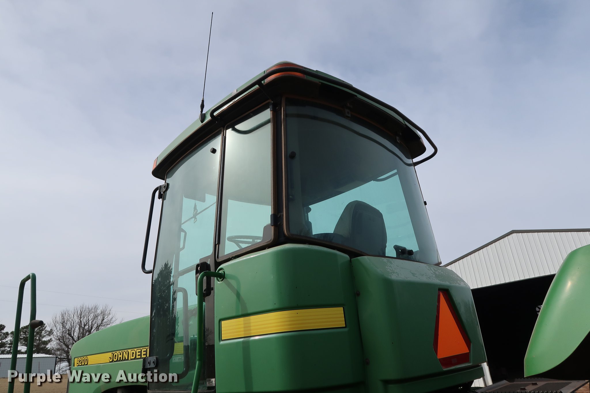 1998 John Deere 9200 4WD tractor. 8,591 hours on meter, John Deere 6105HRW01 10.5L six cylinder turbo diesel engine 310 HP, Serial RG6105H002956, PowrSync transmission 24F-6R gears, Differential lock, AC and heat, Tilt steering wheel, AM/FM, Suspension seat, Block heater, Ether start, Seven pin outlet, (4) rear hydraulic remote sets, 138" wheelbase, Firestone 20.8R42 dual tires, Serial RW9200H010817. VMD Farms - Open inspection March 19. 22149 CS 2630. Gracemont, OK 73042