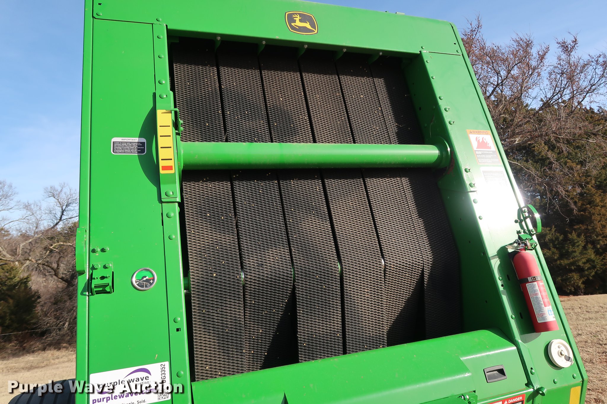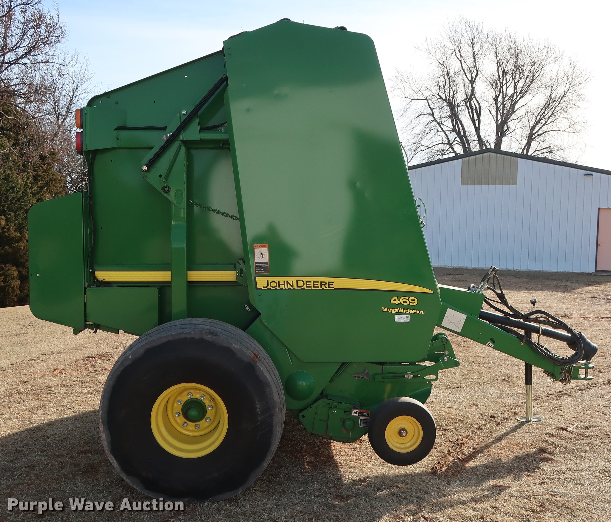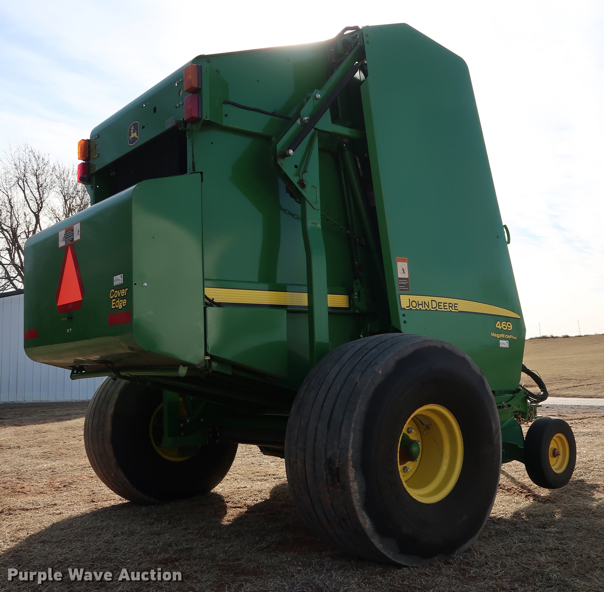 Purple Wave is selling a used Round Baler in Oklahoma. This item is a 2014 John Deere 469 Mega Wide Plus round baler with the following: 3,033 bale count, 4' x 6' bale capacity, 60"W pickup, Hydraulic pickup lift, Rotor cutter, 4.80/3.75 gauge wheels, Feed assist roller, John Deere monitor, Twin twine tie, CoverEdge net wrap, Bale kicker, Work lights, Transport lights, 540 PTO, Pin hitch, 21.5L-16.1SL tires, Serial 1E00469XJDE400064