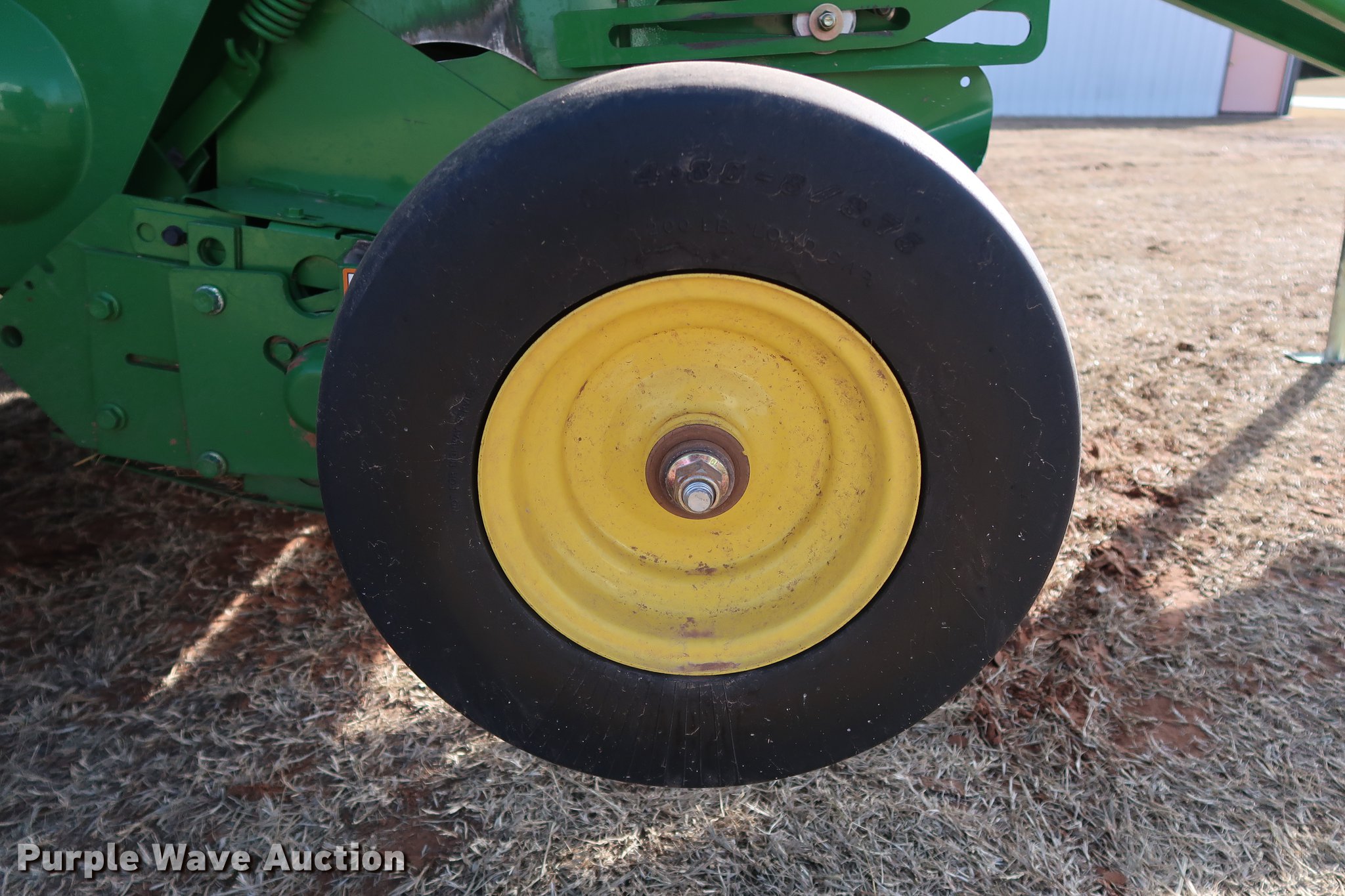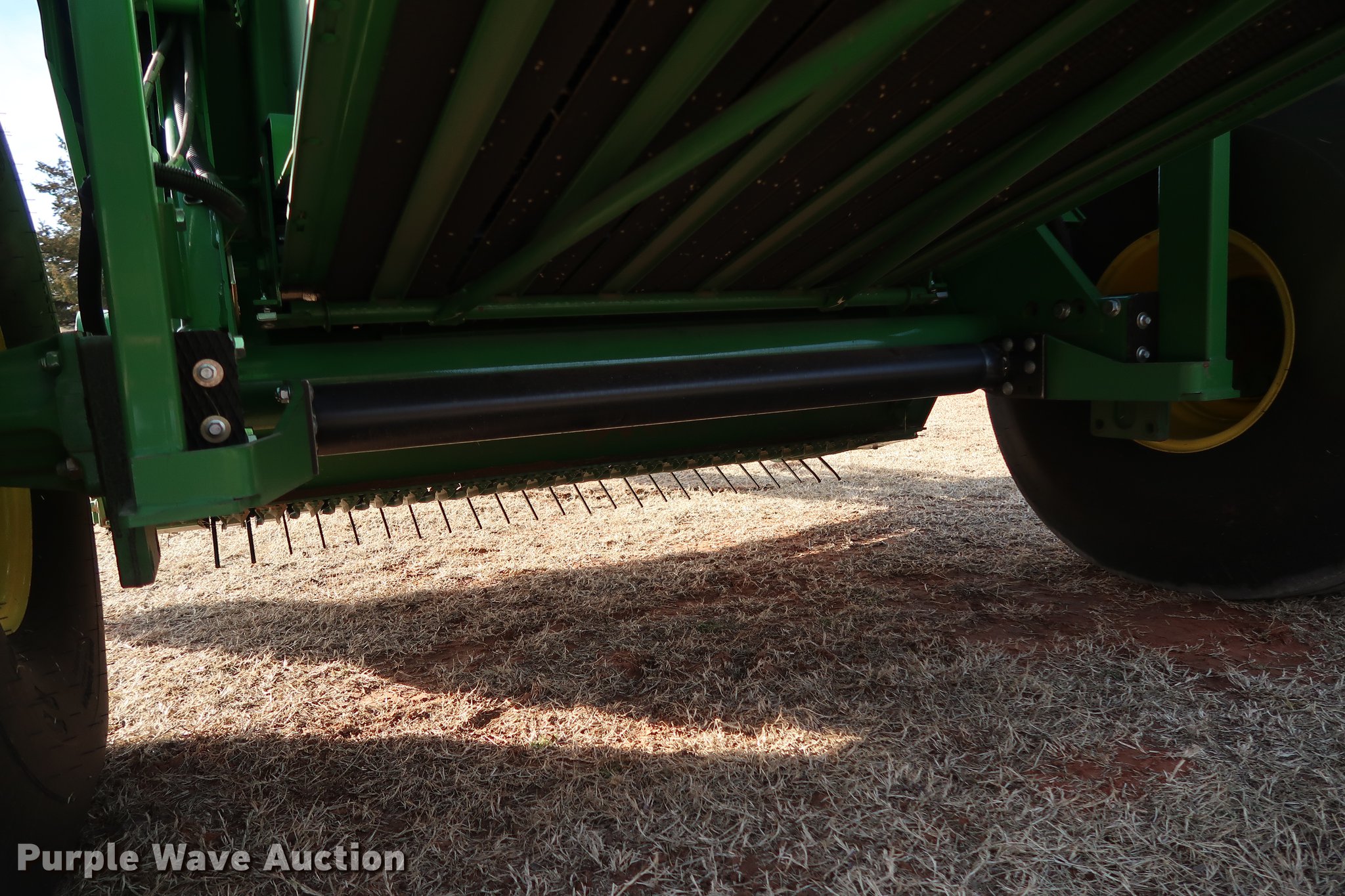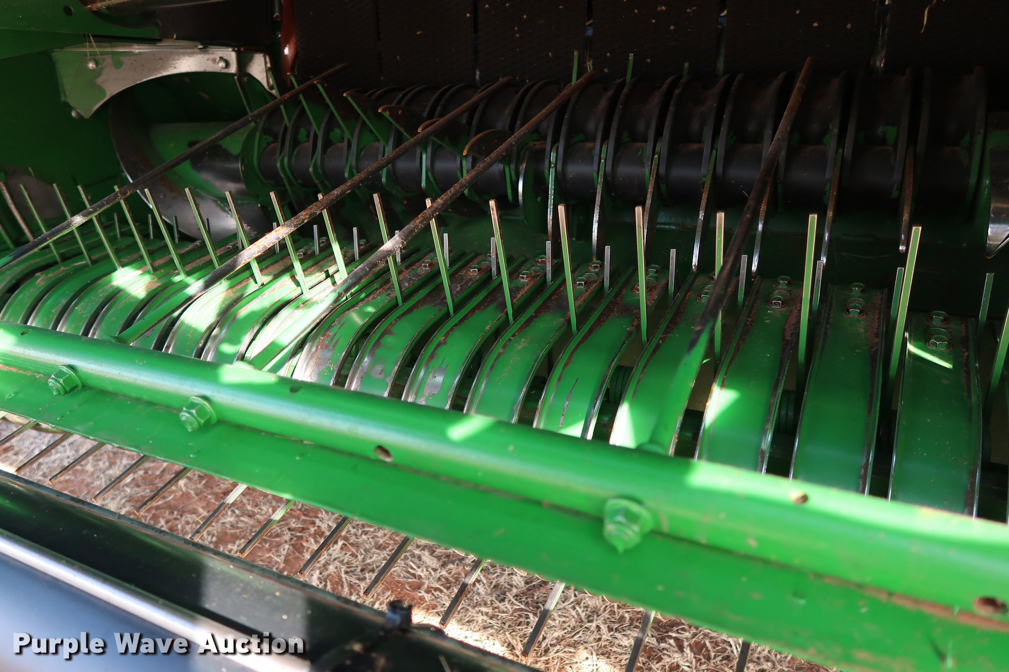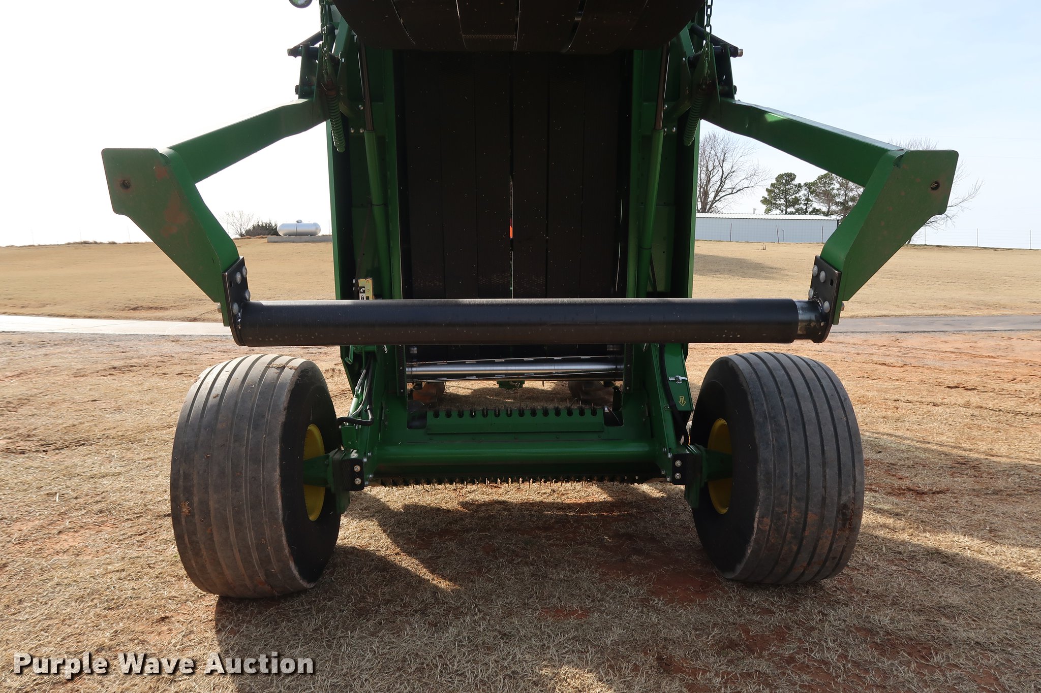 Purple Wave is selling a used Round Baler in Oklahoma. This item is a 2014 John Deere 469 Mega Wide Plus round baler with the following: 3,033 bale count, 4' x 6' bale capacity, 60"W pickup, Hydraulic pickup lift, Rotor cutter, 4.80/3.75 gauge wheels, Feed assist roller, John Deere monitor, Twin twine tie, CoverEdge net wrap, Bale kicker, Work lights, Transport lights, 540 PTO, Pin hitch, 21.5L-16.1SL tires, Serial 1E00469XJDE400064