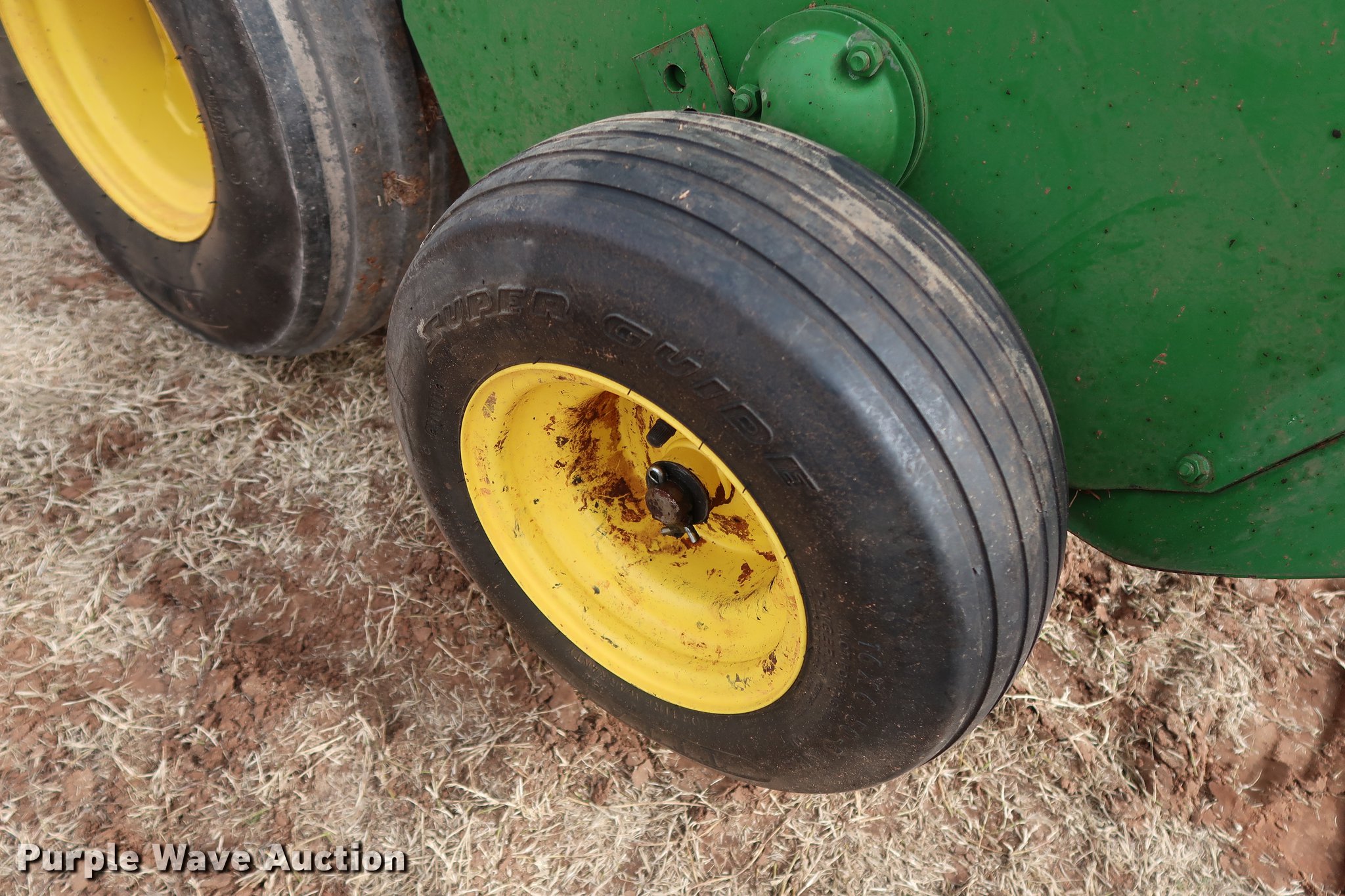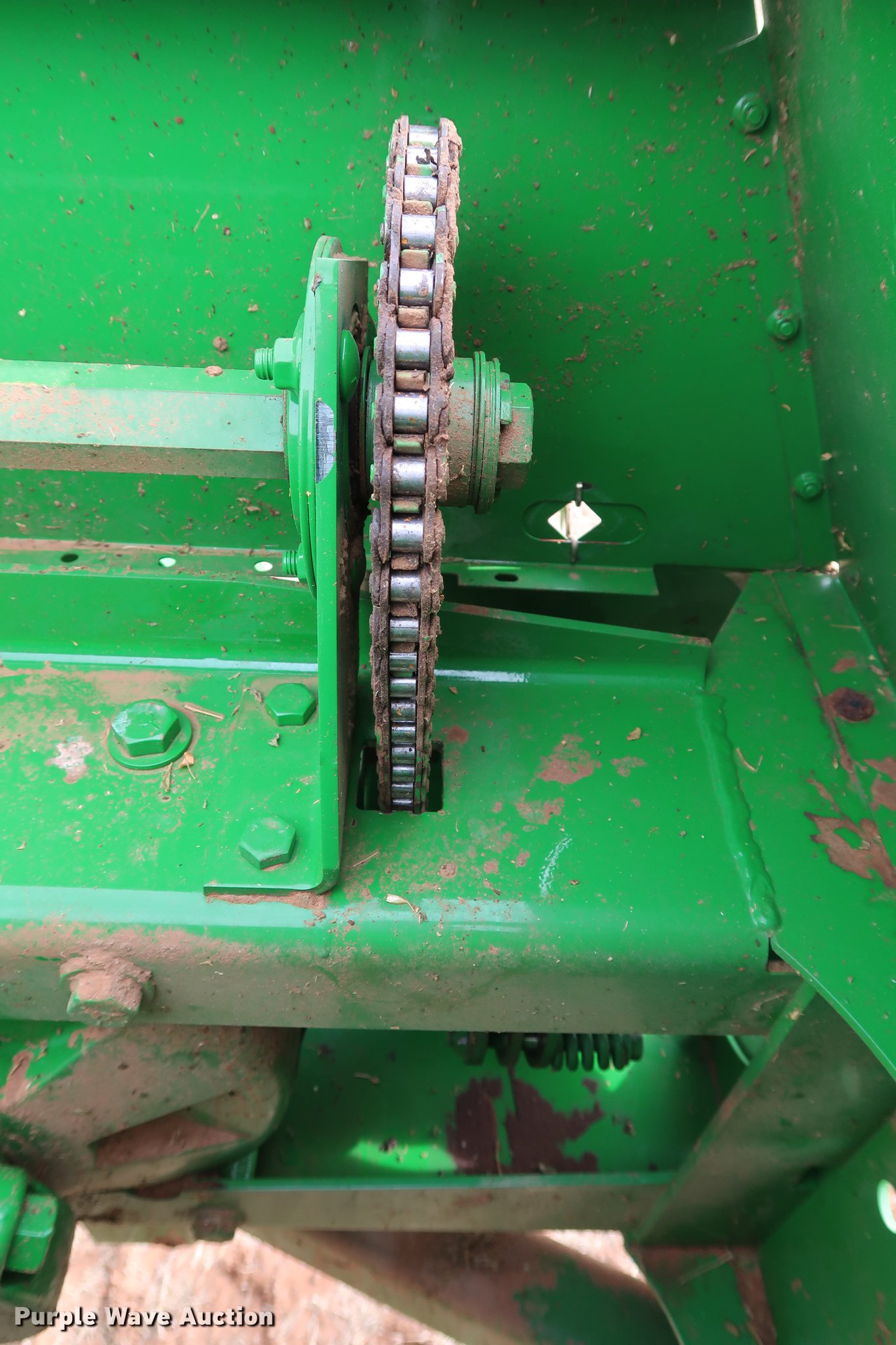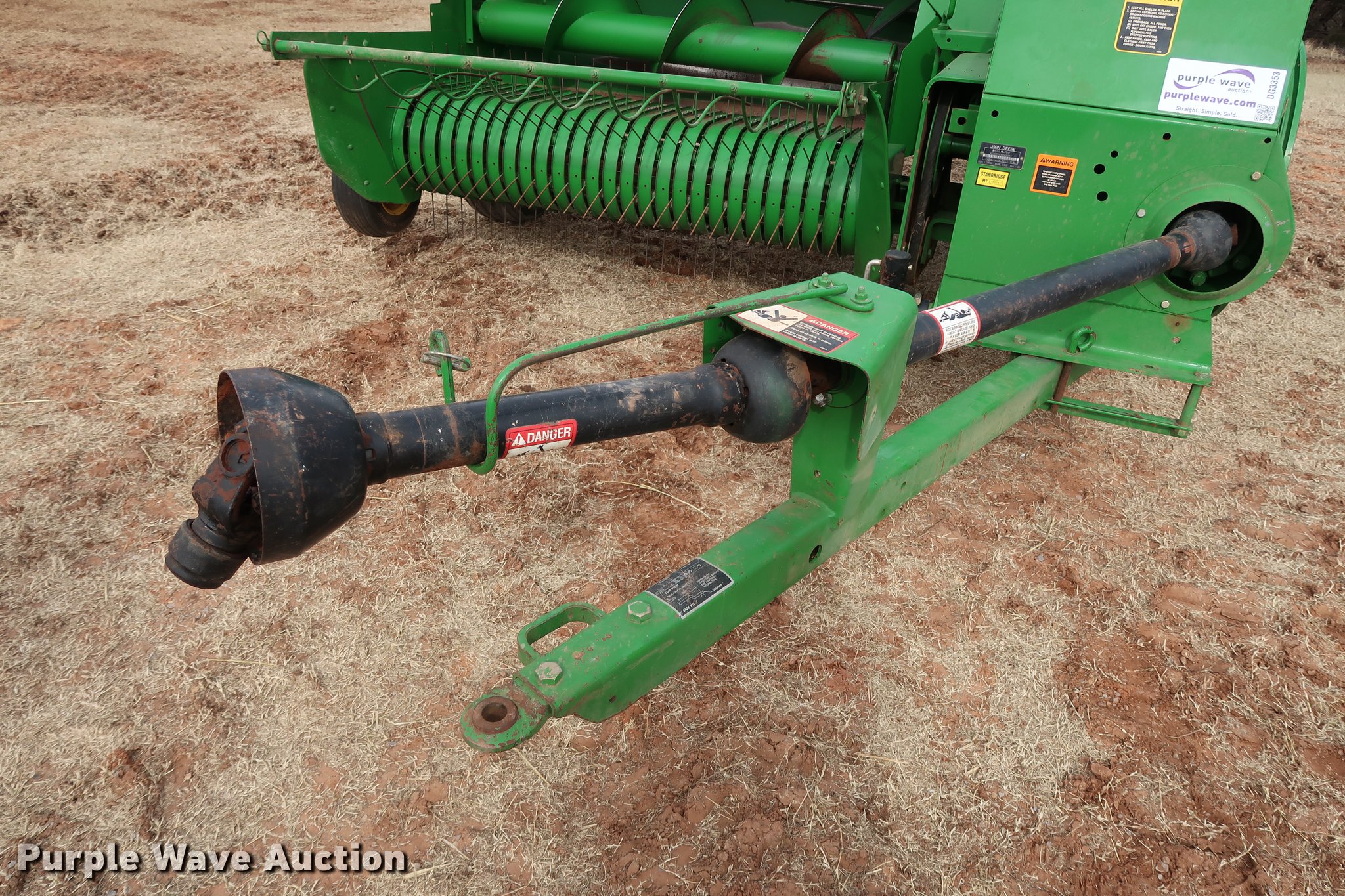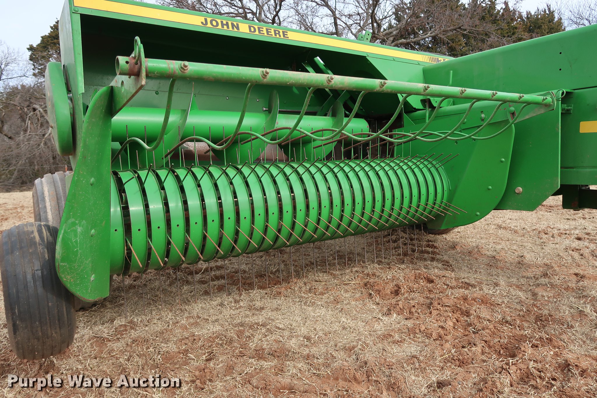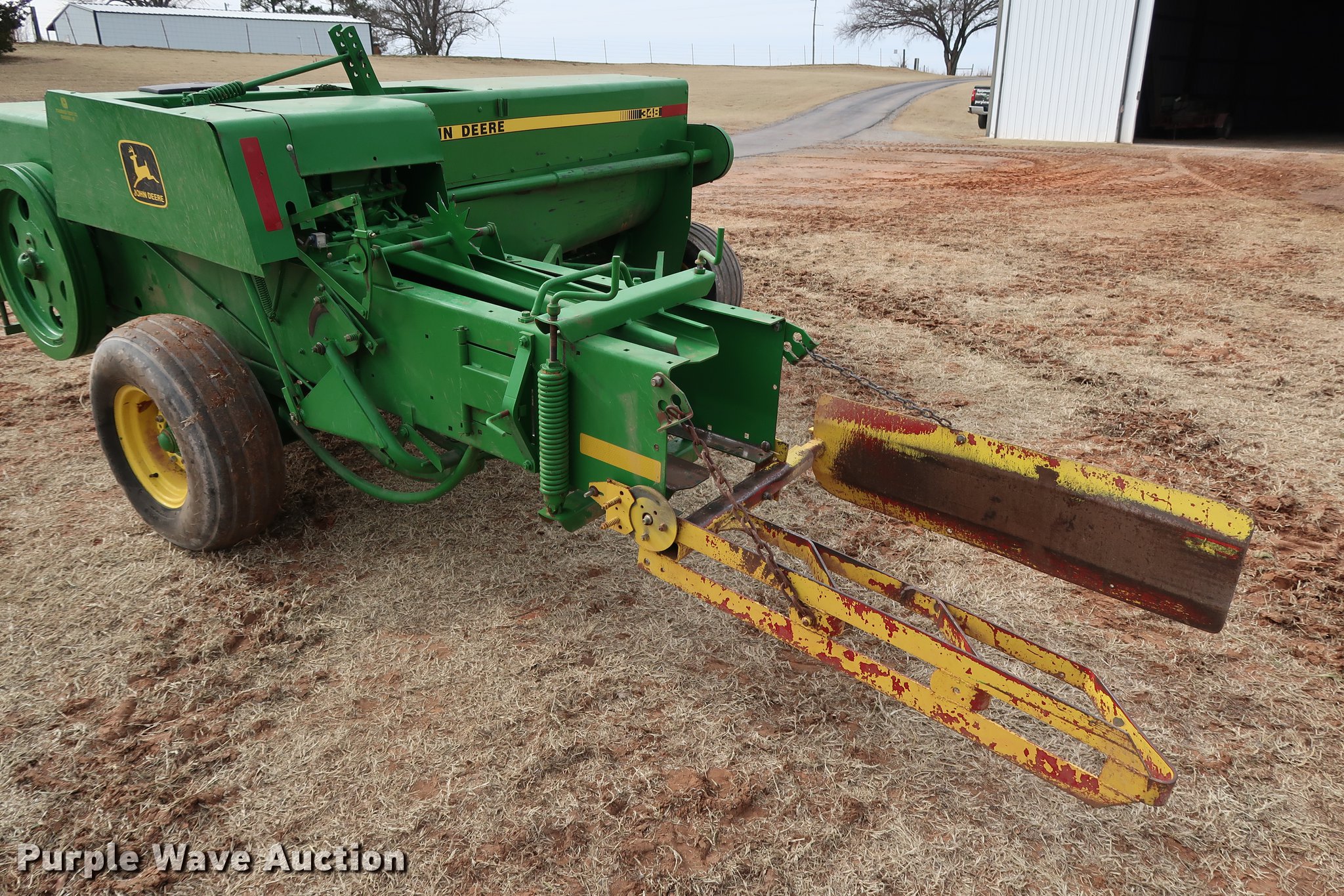 Purple Wave is selling a used Square Baler in Oklahoma. This item is a 2001 John Deere 348 small square baler with the following: 14" x 18" bale capacity, 60"W pickup, 16-6.5/8 gauge wheels, Wire tie, Bale chute, 540 PTO, Pin hitch, 26x12.00-12 tires, Serial E00348X991556