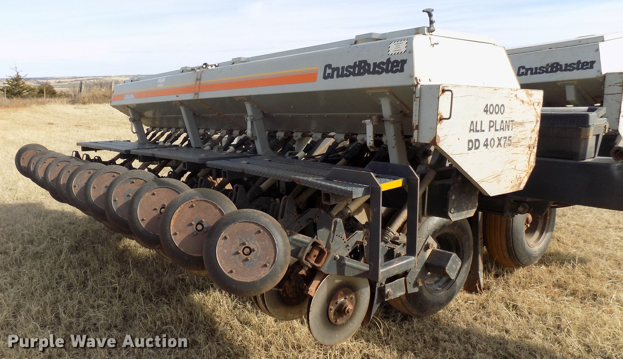 Purple Wave is selling a used Grain Drill or Seeder in Oklahoma. This item is a CrustBuster 4000AP grain drill with the following: 19,824 acres on meter, 25'W overall, 40 row units, 7.5" row spacing, Hydraulic front fold, Bulk fill system, Double disk openers, Single closing system, Pin hitch, (12) 11L-15 transport tires, Serial 10708