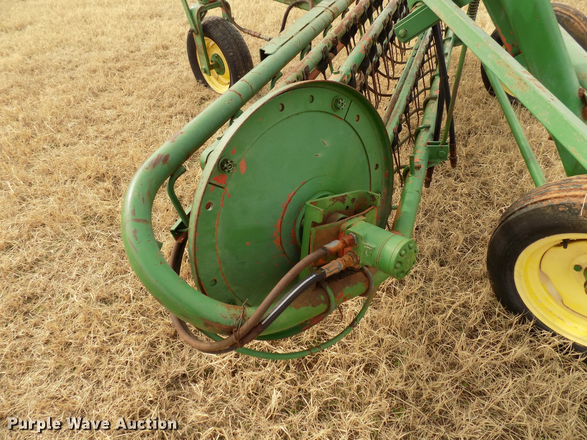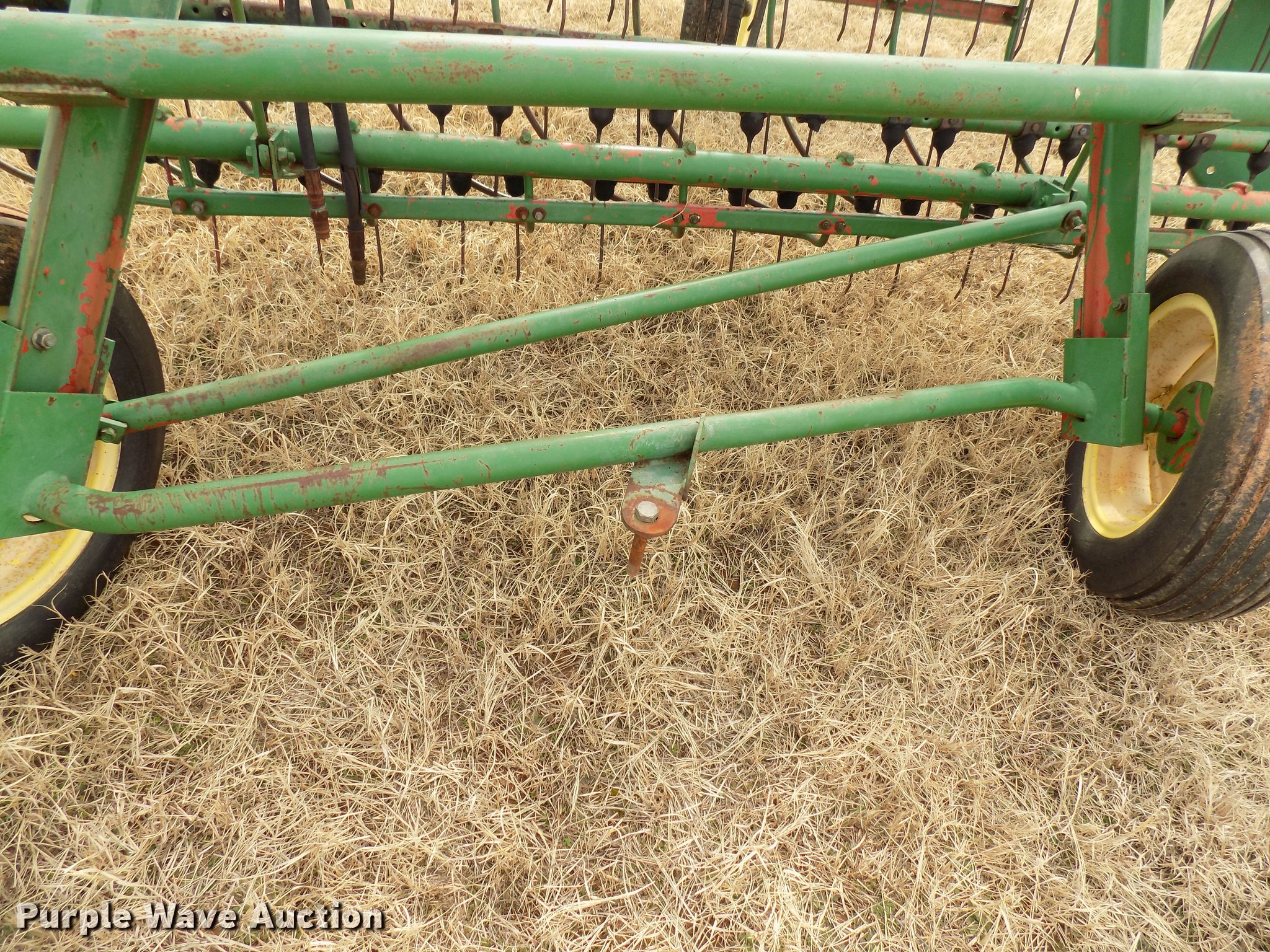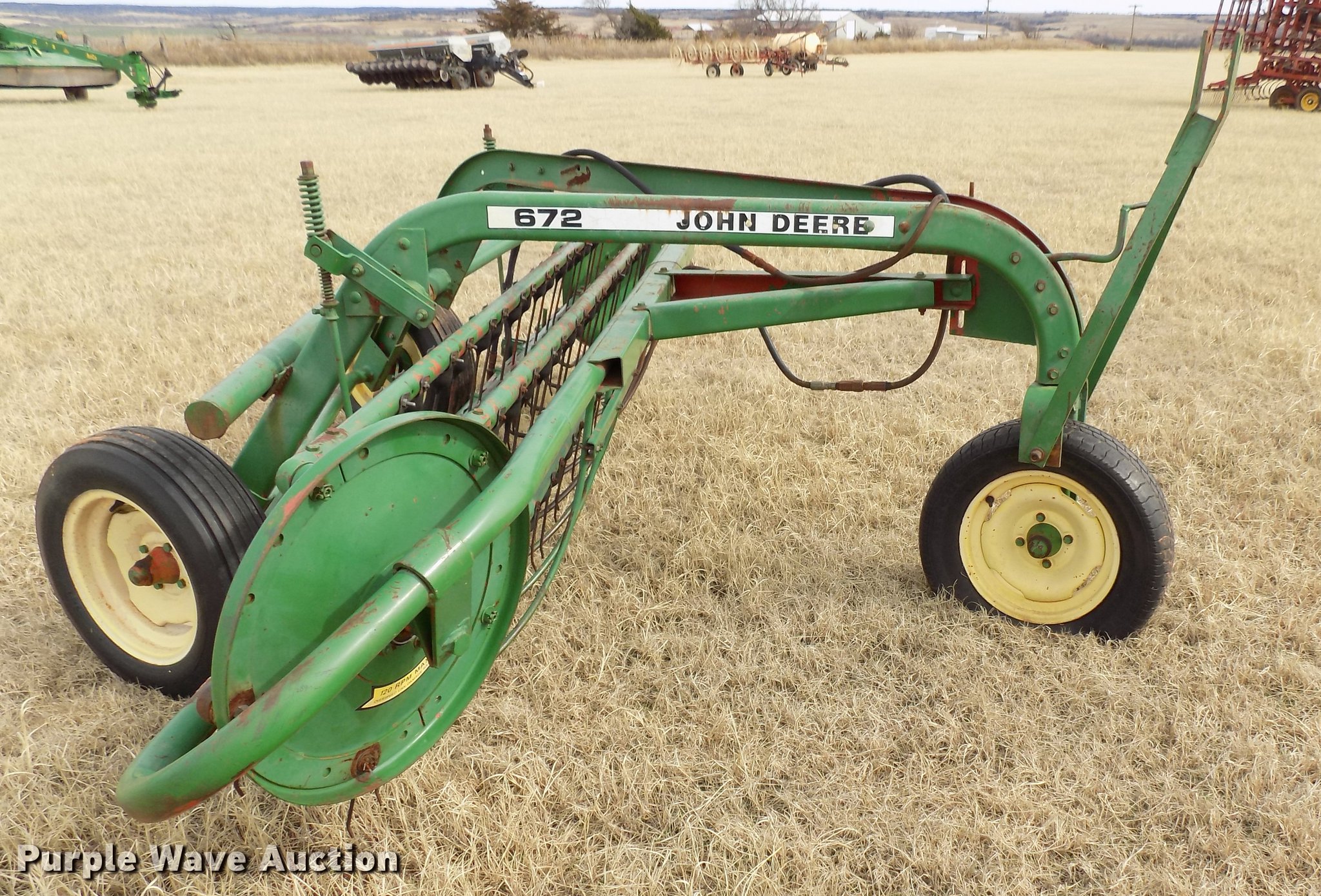 Purple Wave is selling a used Hay Rake in Oklahoma. This item is a John Deere 672 hay rake with the following: 10'W, Hydraulic driven, Pin hitch, 25x7.50-15 tires