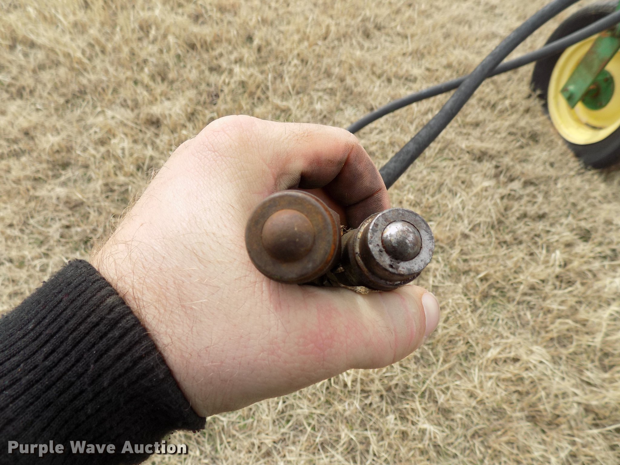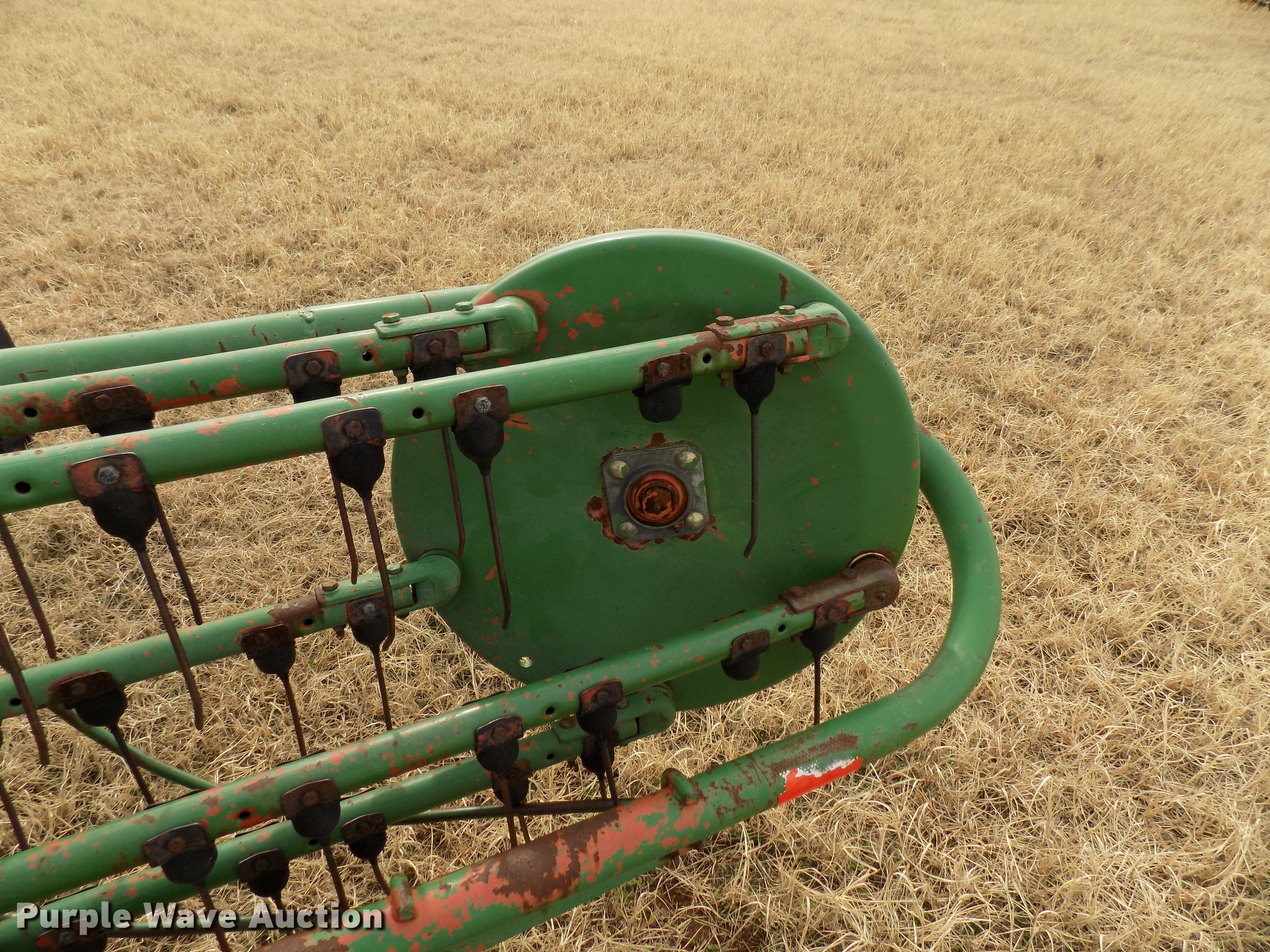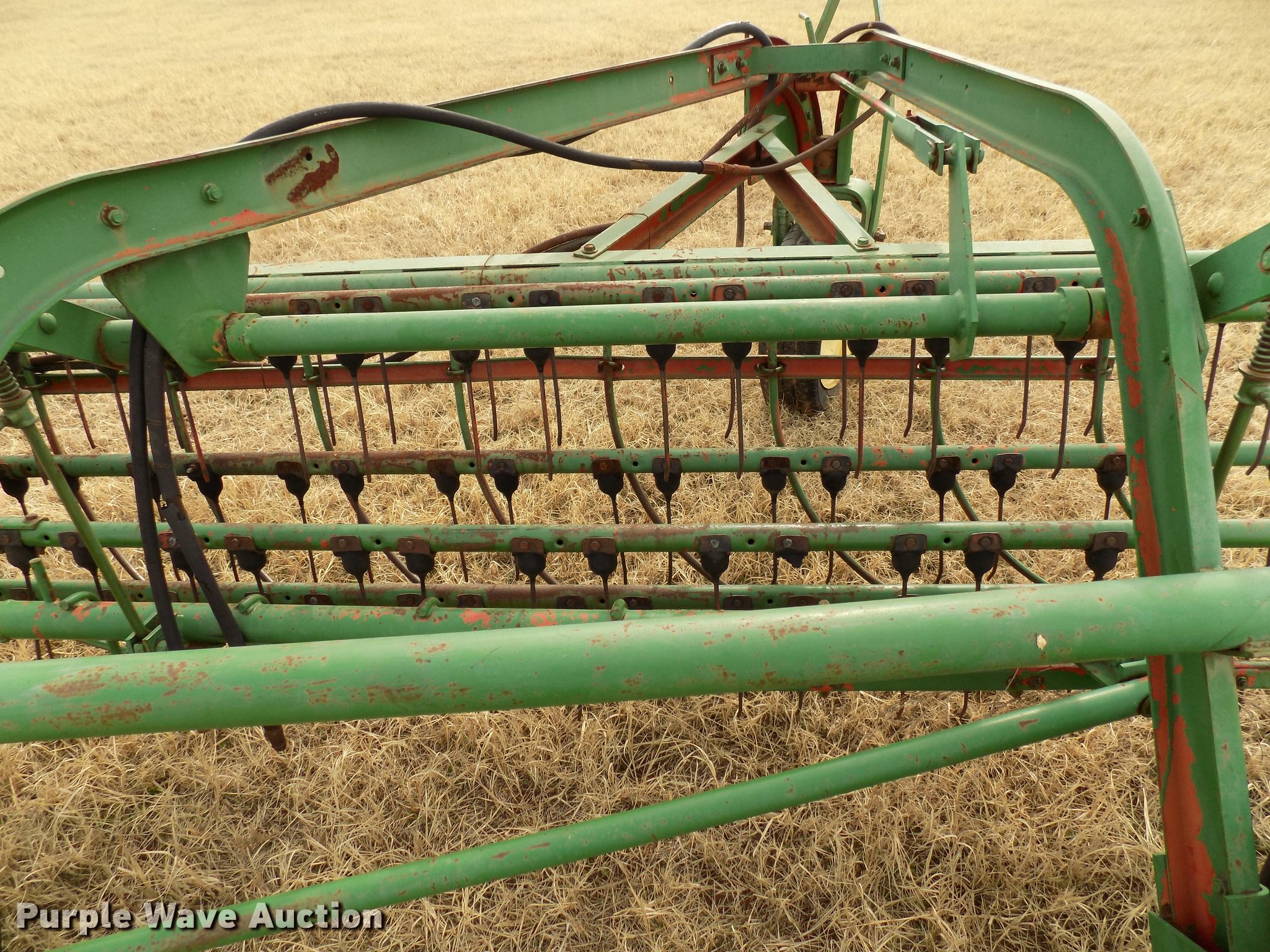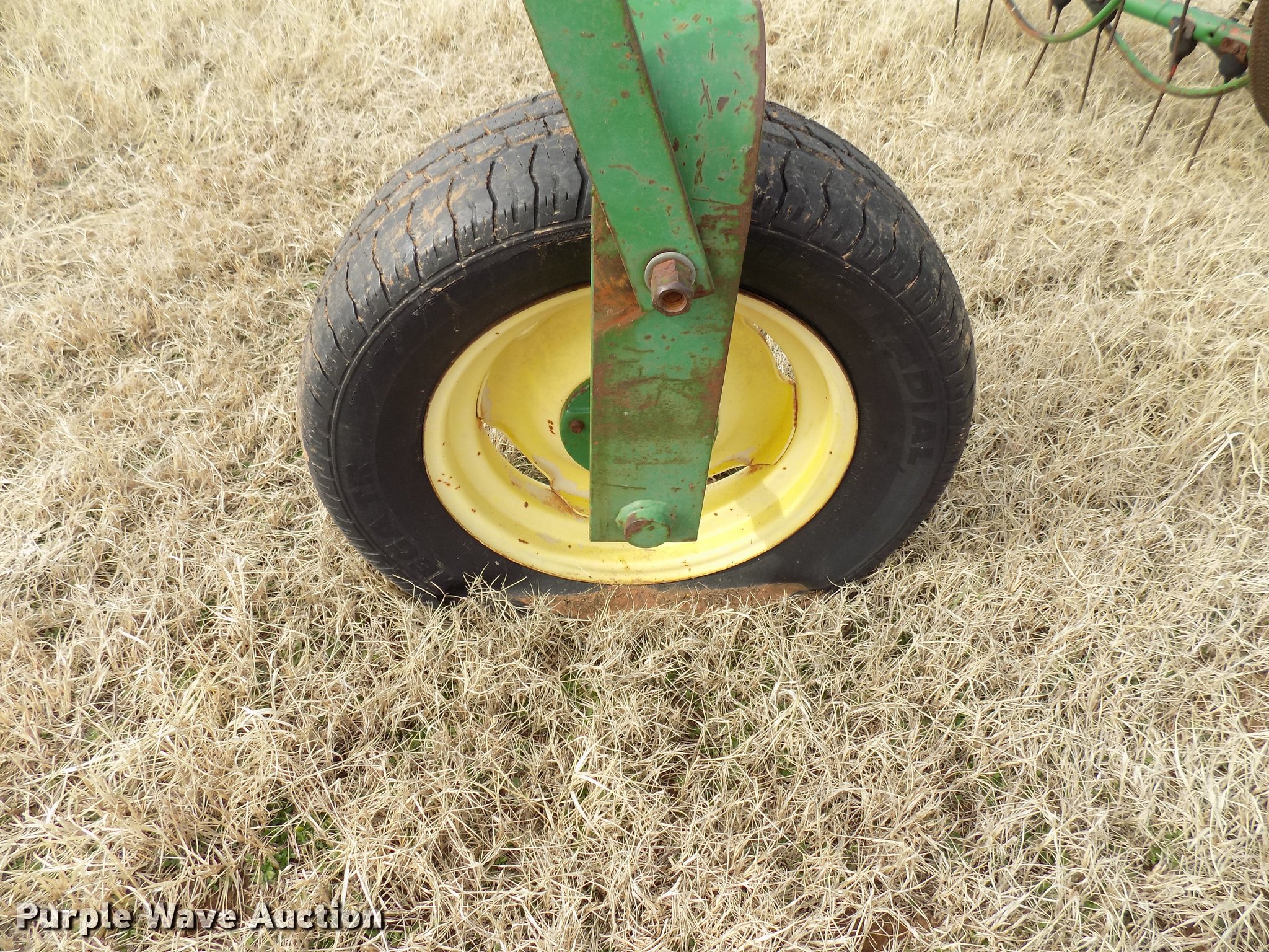 Purple Wave is selling a used Hay Rake in Oklahoma. This item is a John Deere 672 hay rake with the following: 10'W, Hydraulic driven, Pin hitch, 25x7.50-15 tires