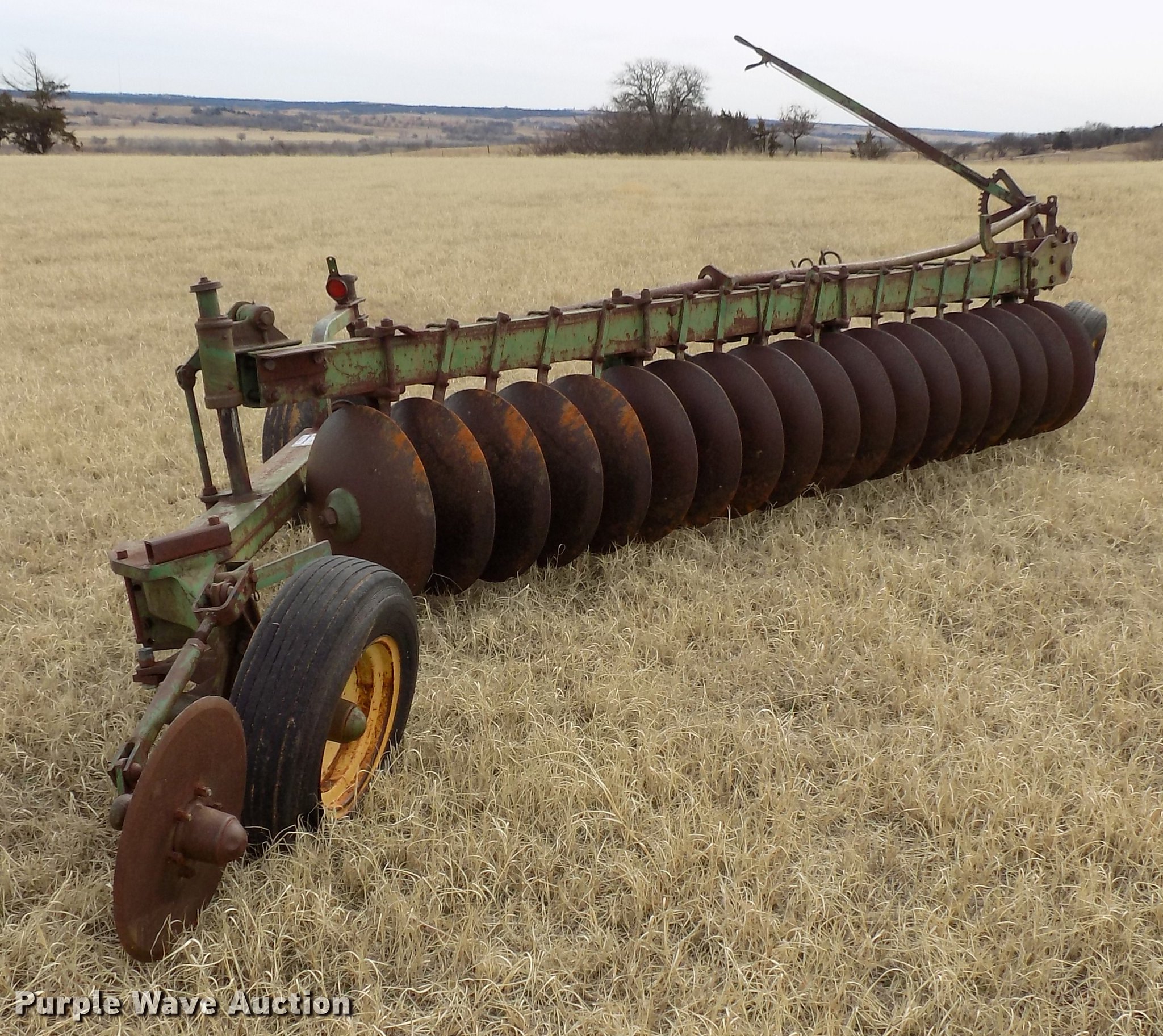 Purple Wave is selling a used Disk in Oklahoma. This item is a John Deere one-way disk with the following: 13'W, 24" diameter disks, 9" spacing, Disk scrapers, Hydraulic lift, Manual angle and height adjustment, Pin hitch, 7.60-15 tires