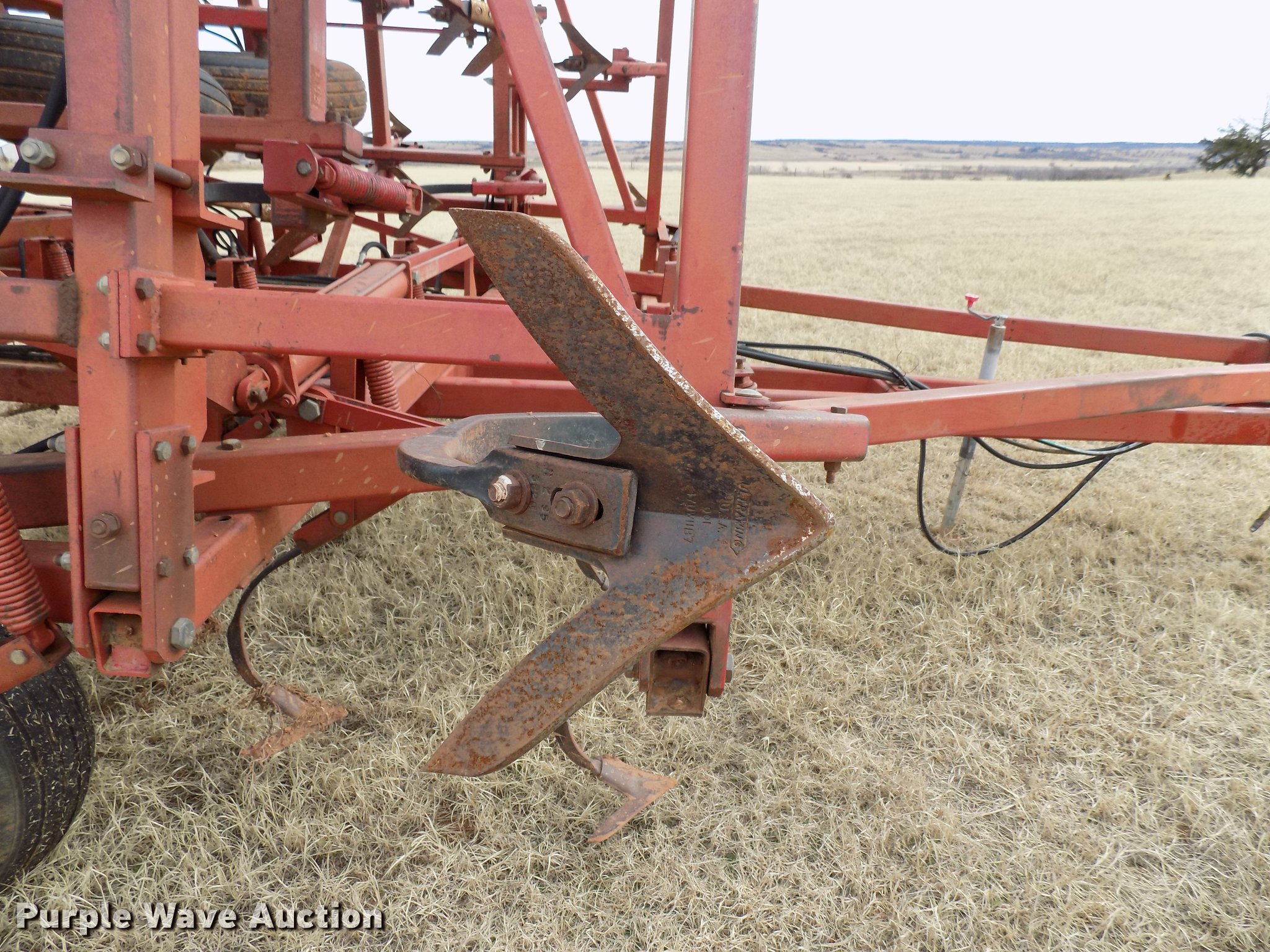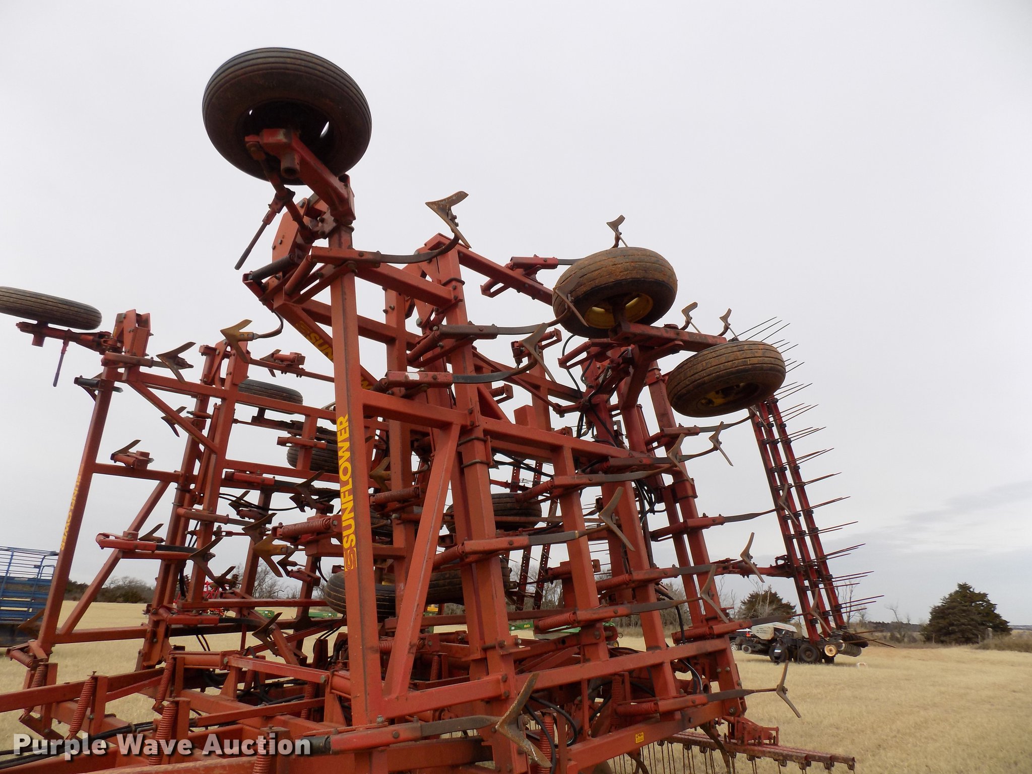 Purple Wave is selling a used Field Cultivator or Sweep Plow in Oklahoma. This item is a Sunflower 5452-46 field cultivator with the following: 46'W overall, (77) 11"W sweeps, Three bar tine harrow, Hydraulic lift and fold, Pin/clevis hitch, Walking tandem axle, 11L-15SL tires, Serial 3012