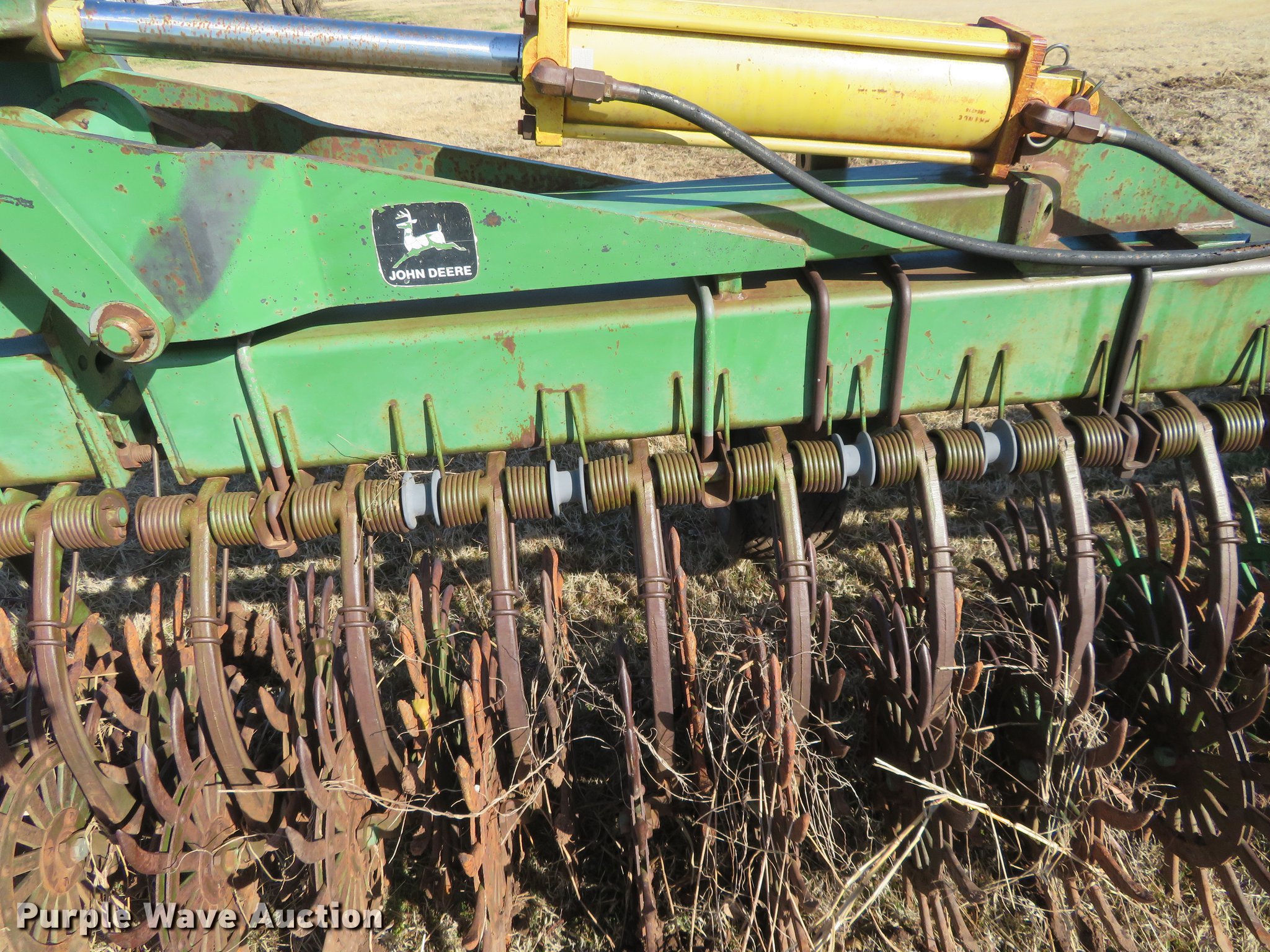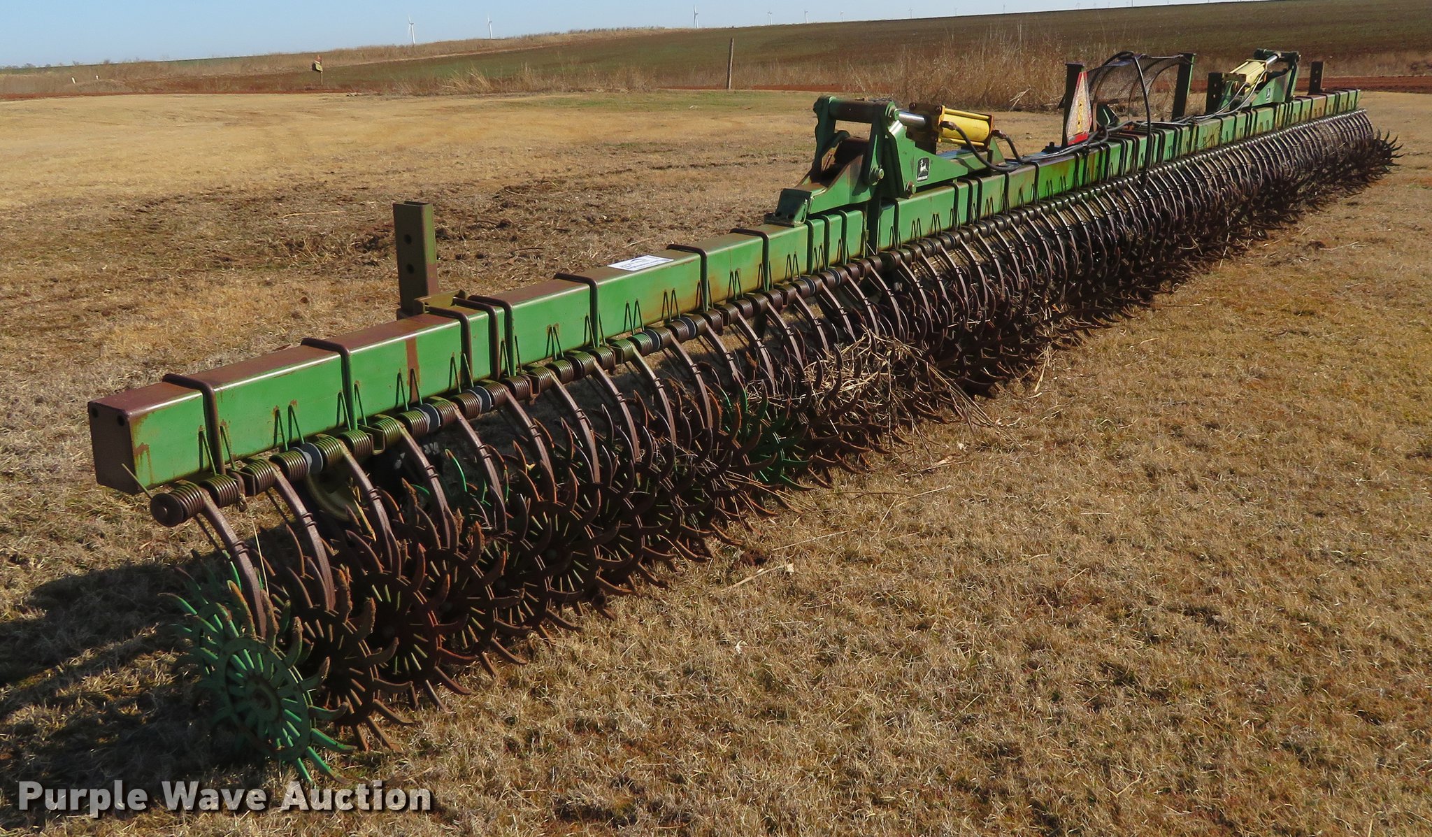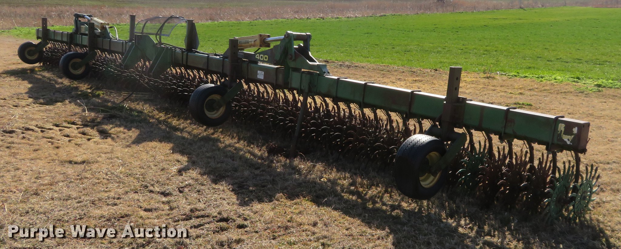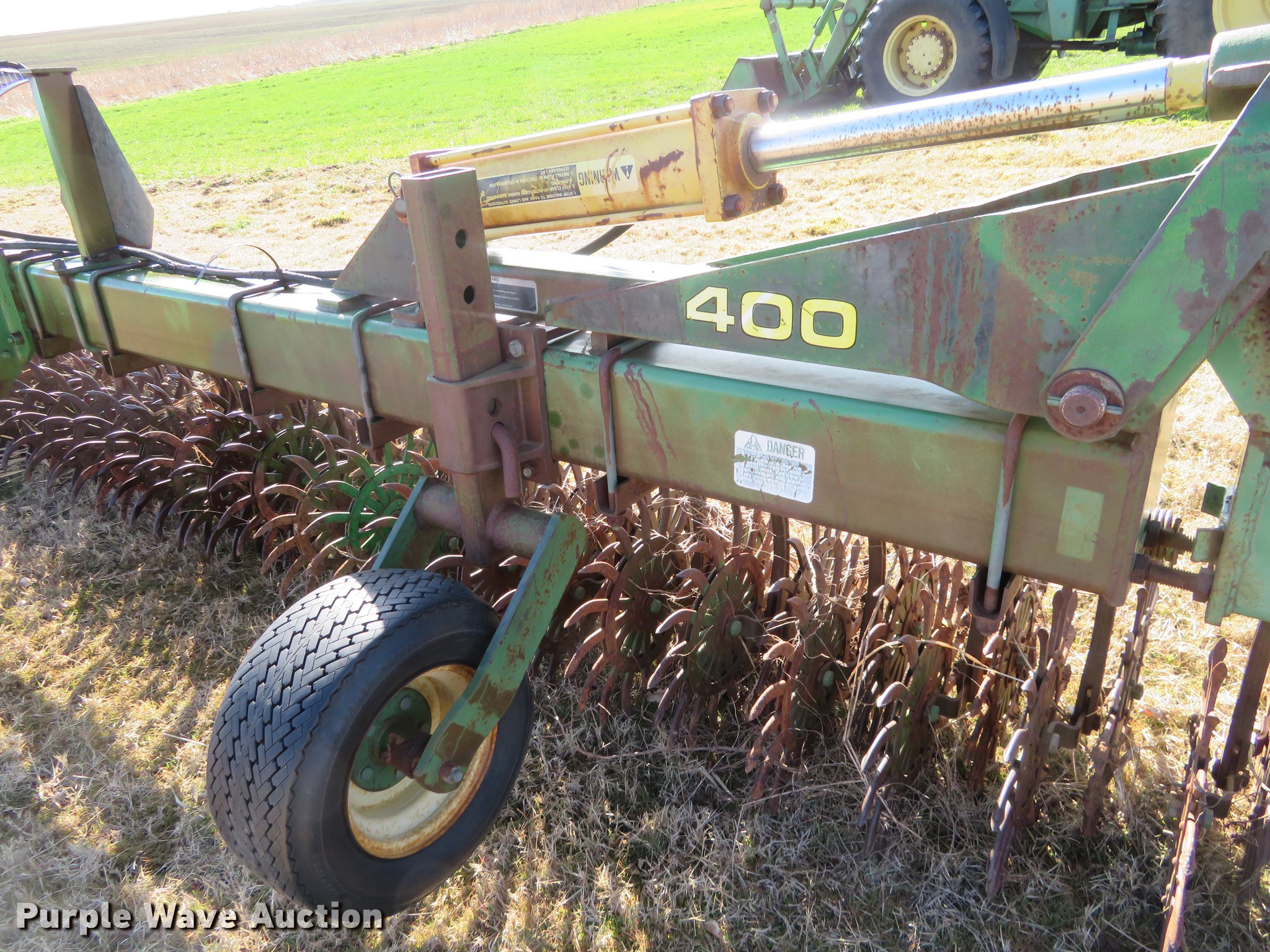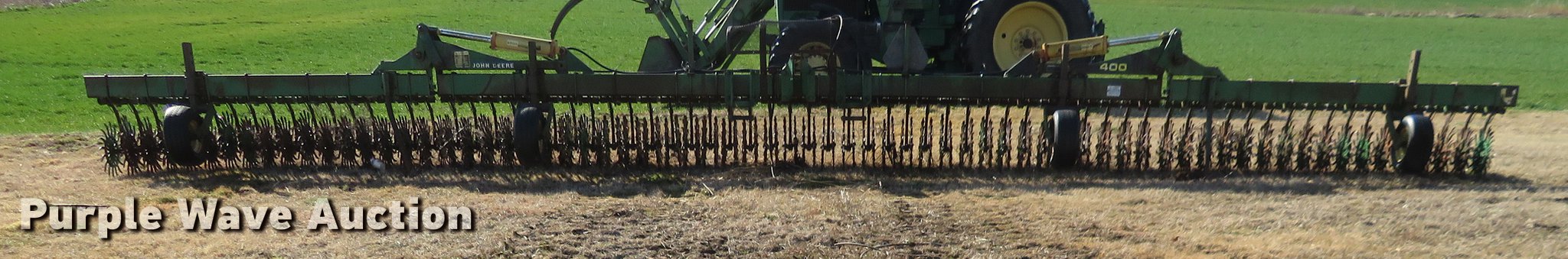 Purple Wave is selling a used Rotary Tillage in Oklahoma. This item is a John Deere 400 rotary hoe with the following: 31'W, Hydraulic fold, Three point, 20.5x8.0 gauge tires, Flat tires, Hydraulic leaks, Unit will not fold, Serial N00400F004771