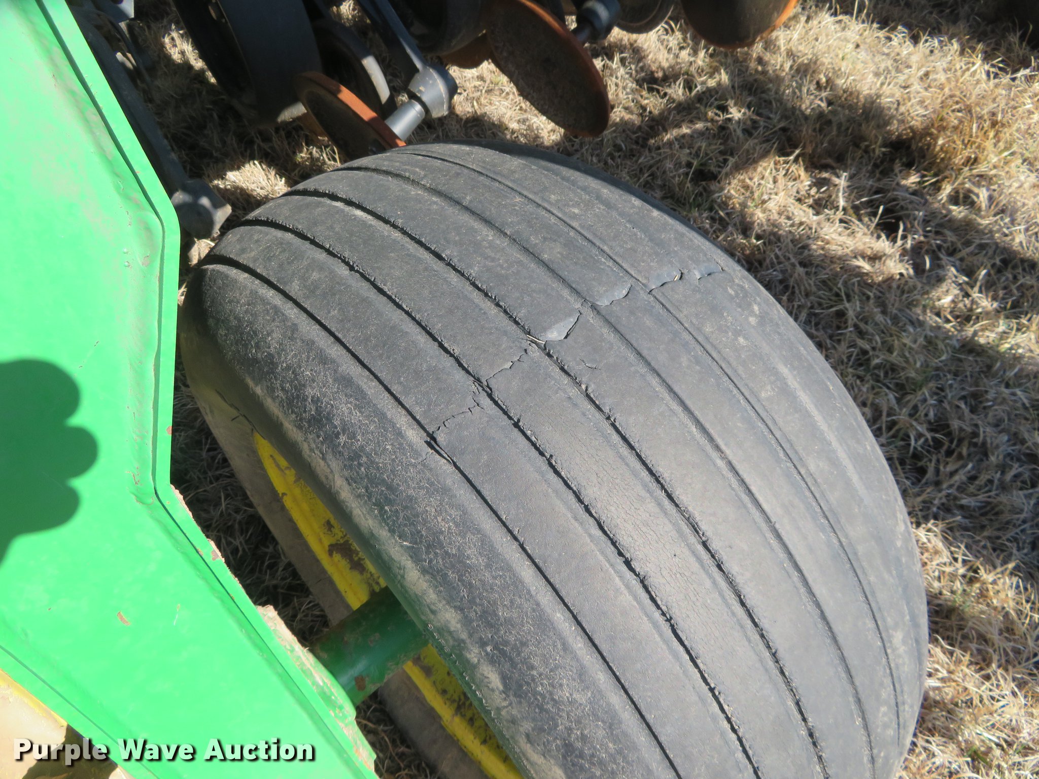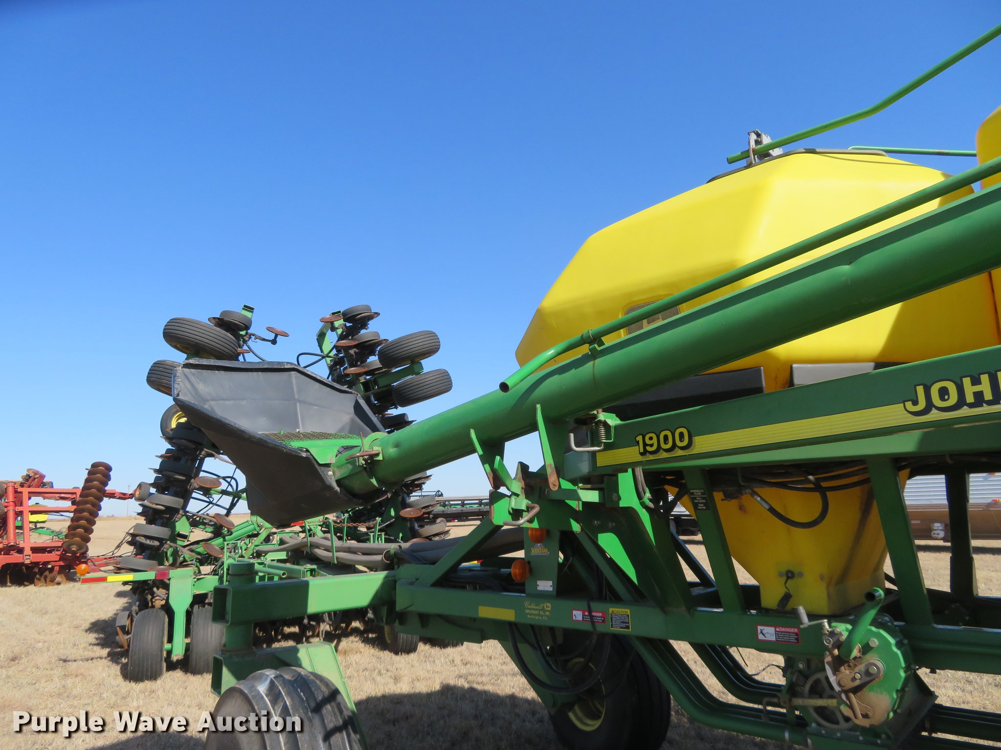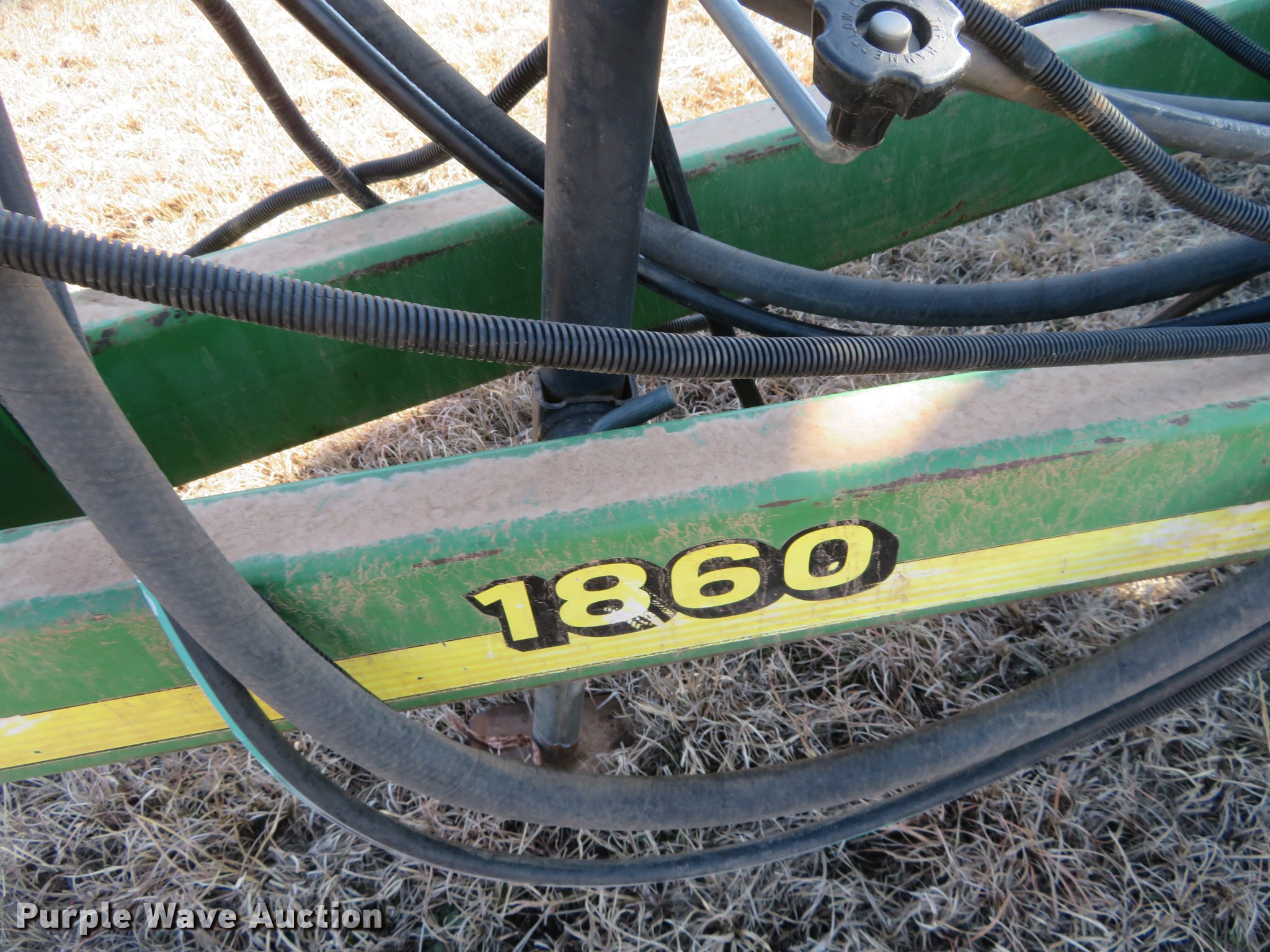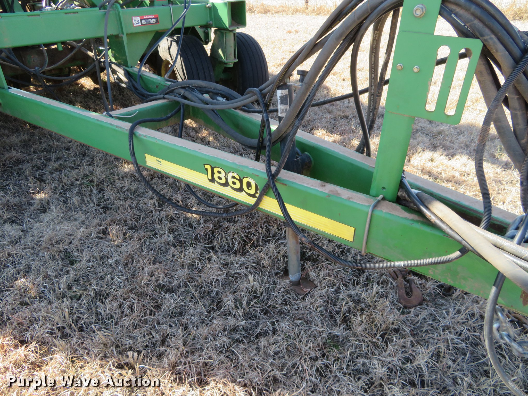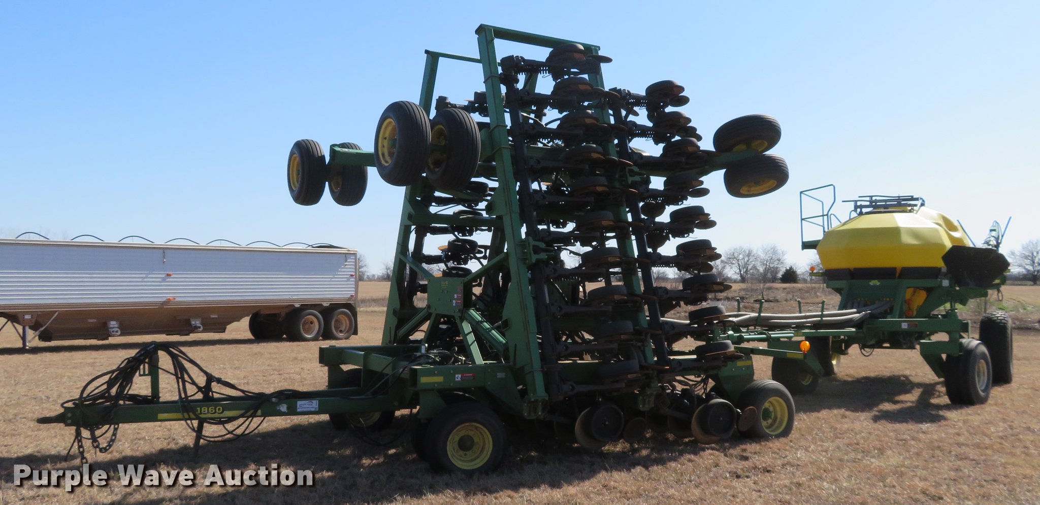 Purple Wave is selling a used Air Seeder in Oklahoma. This item is a John Deere 1860 no-till air seeder with the following: 58 row units, 7.5" row spacing, Hydraulic wing fold, Bulk fill system, 270 bushel capacity, Air delivery, John Deere 1900 air commodity cart, 16.5-16 front tires, 28L-26 rear tire, Serial A01900H695257, Hydraulic meter drive, Precision seed meters, HD spring down pressure, Seed firmers, Single disk openers, Pin hitch, Single gauge wheels, 11L-15 tires, Serial A01860X695291