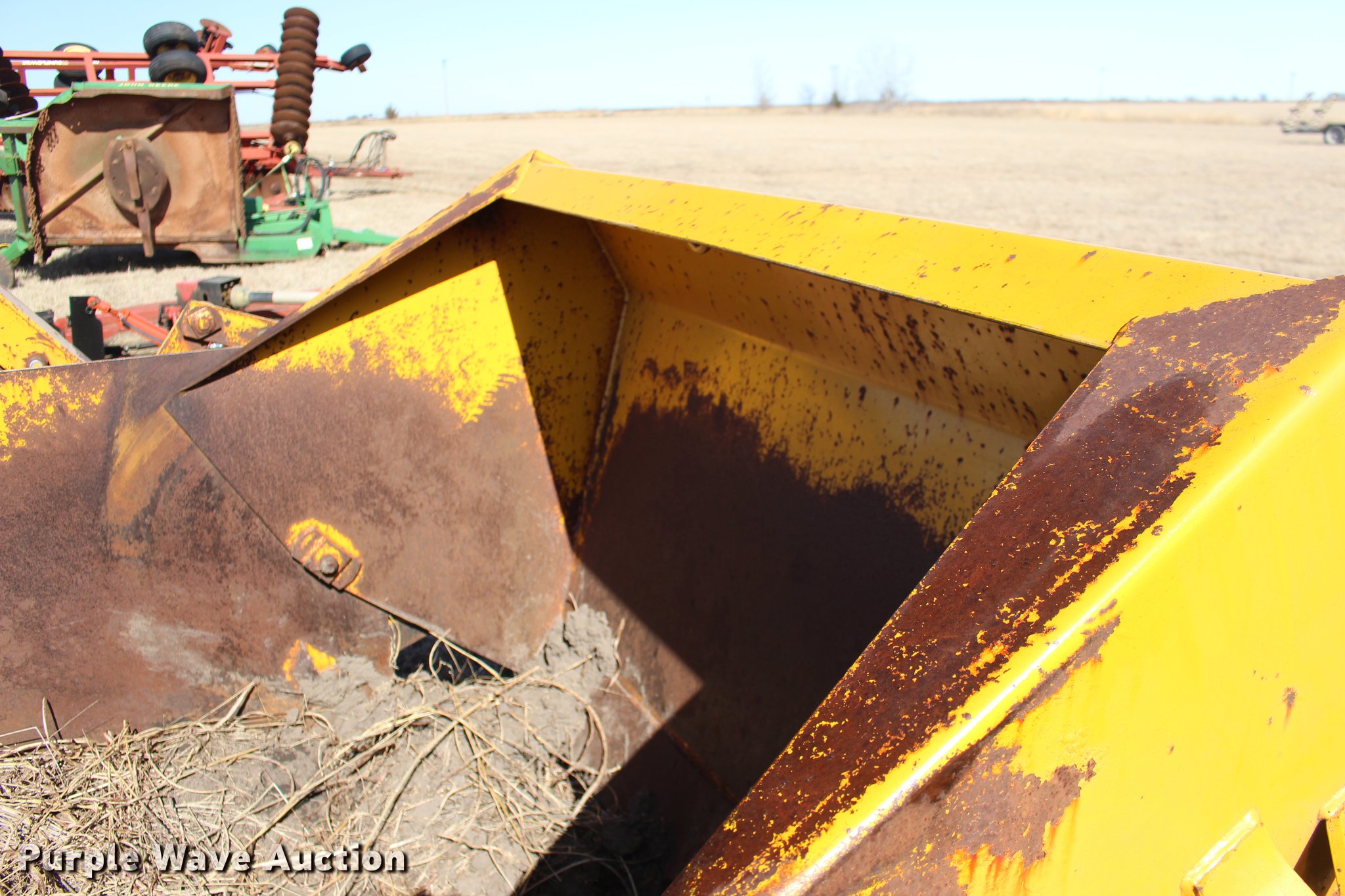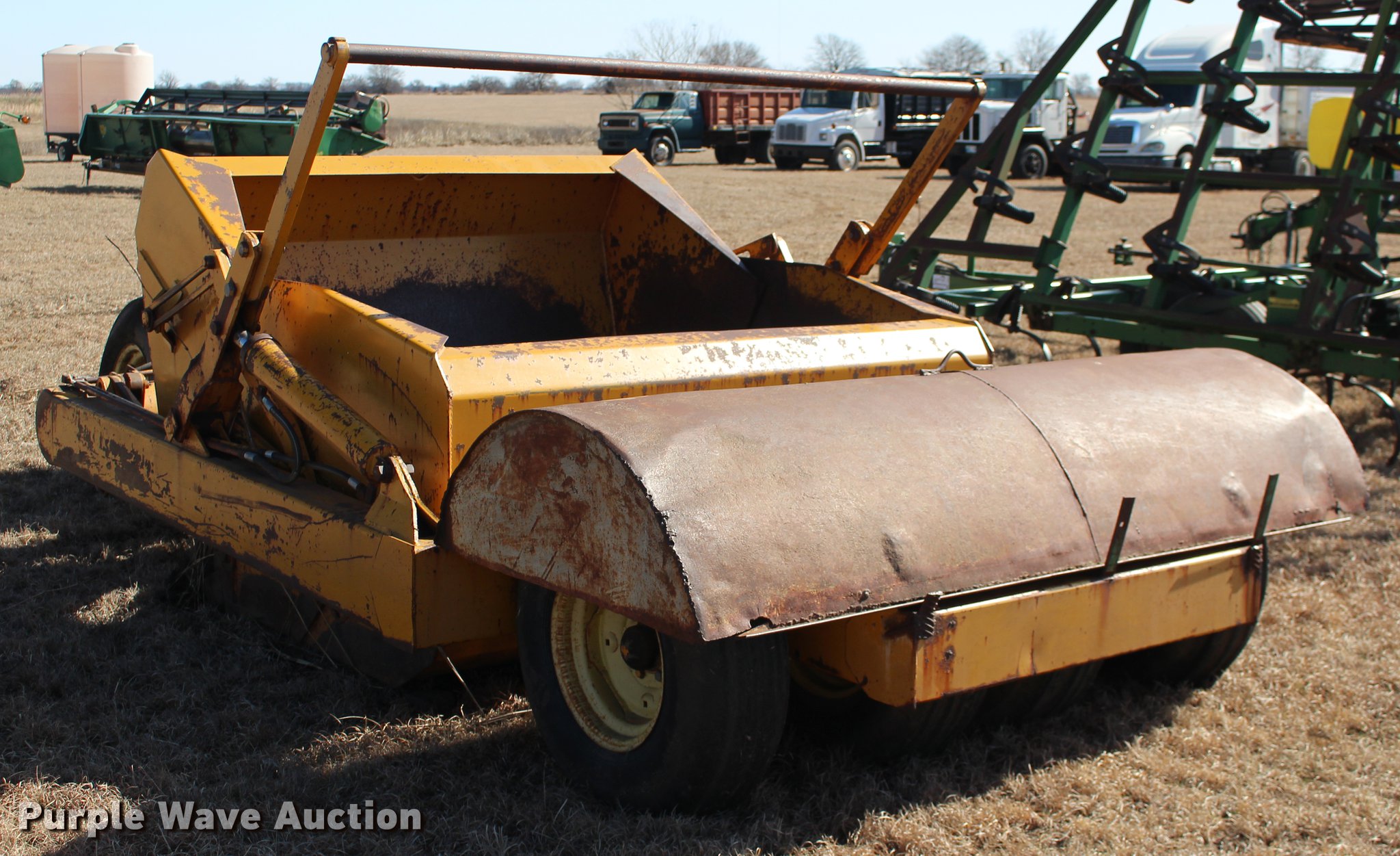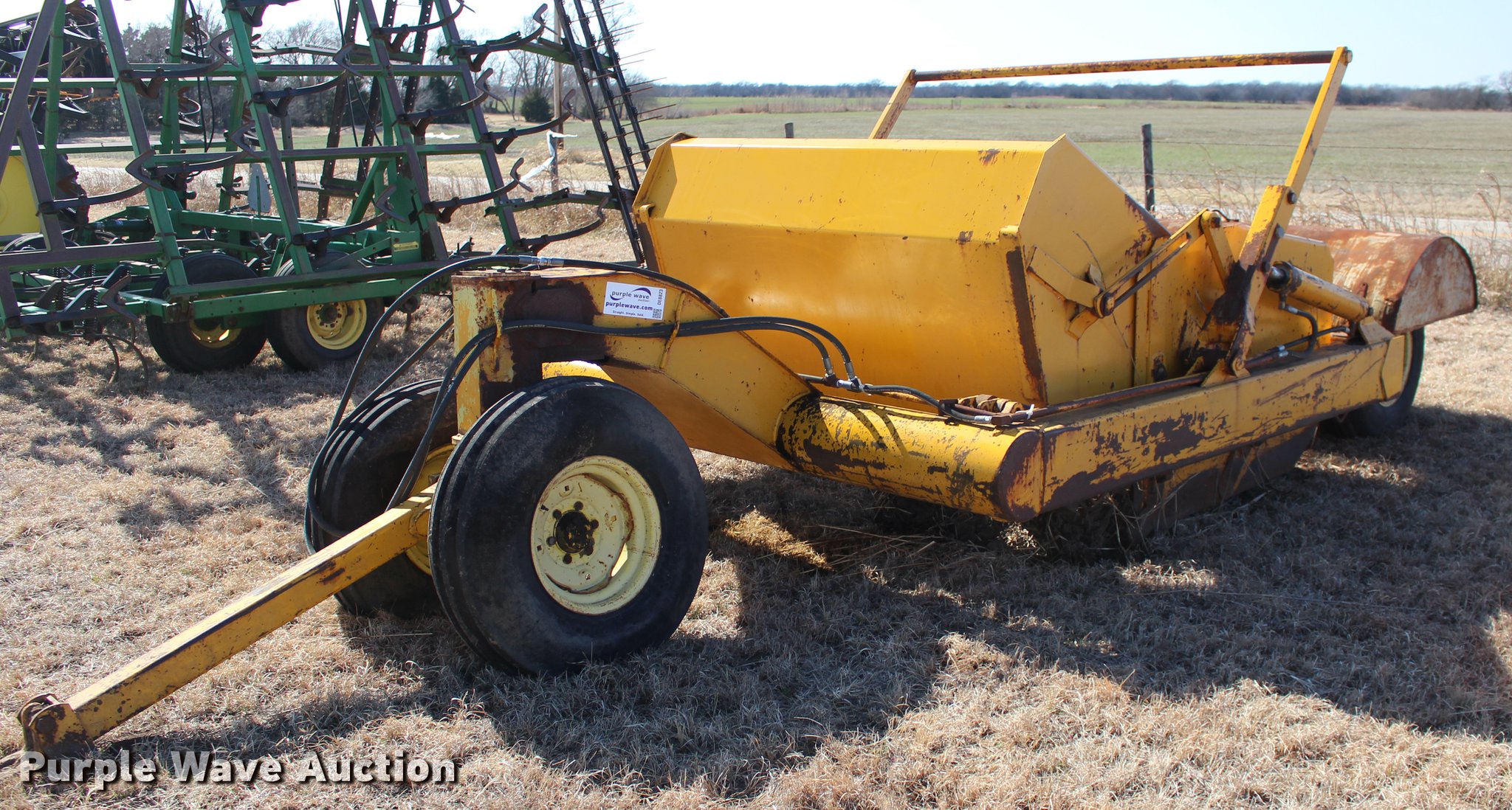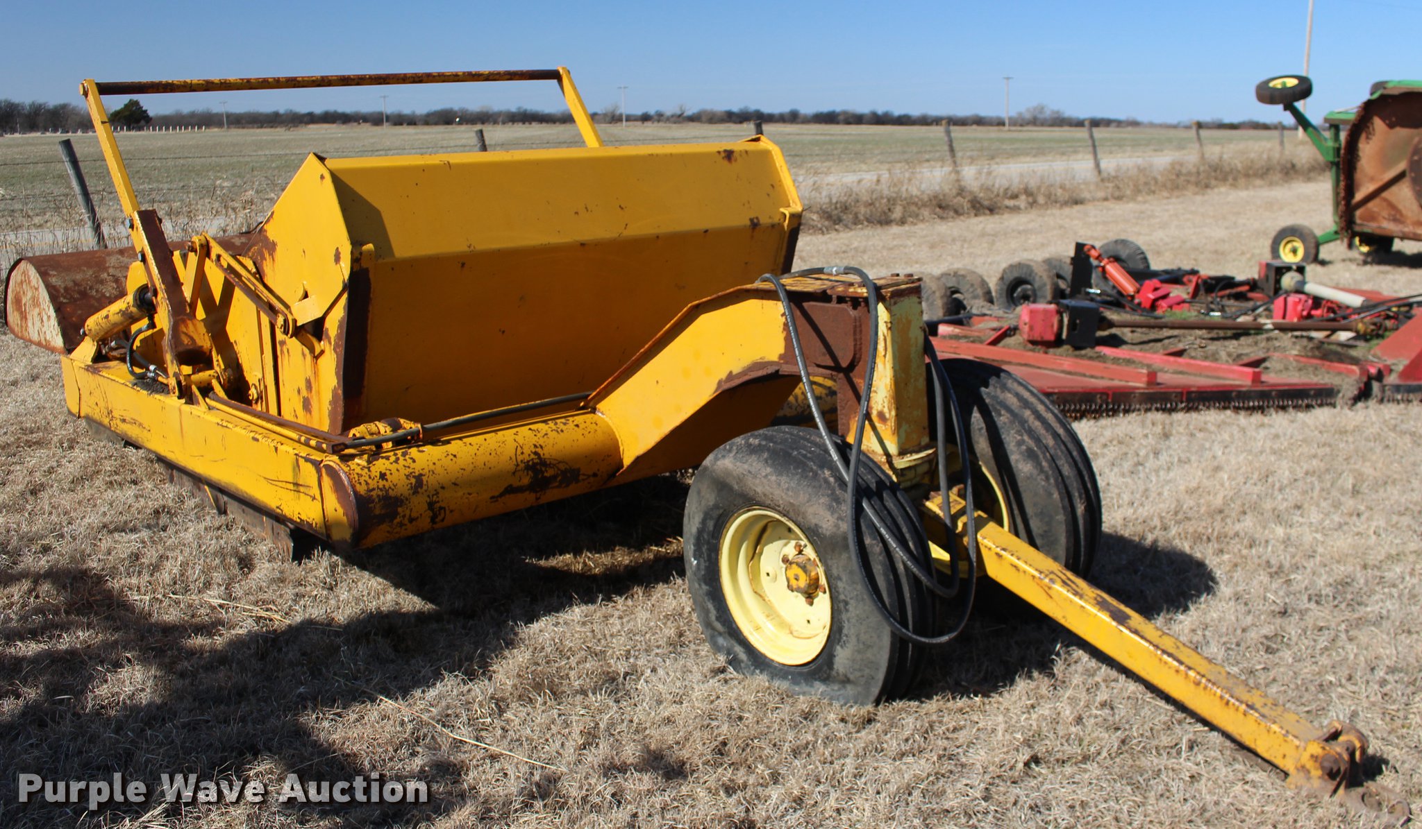 Purple Wave is selling a used Pull Type Scraper in Oklahoma. This item is a Scraper with the following: 84"L x 76"W bowl, Hydraulic bowl, Hydraulic lift, Pin hitch, 10.00-16 tires