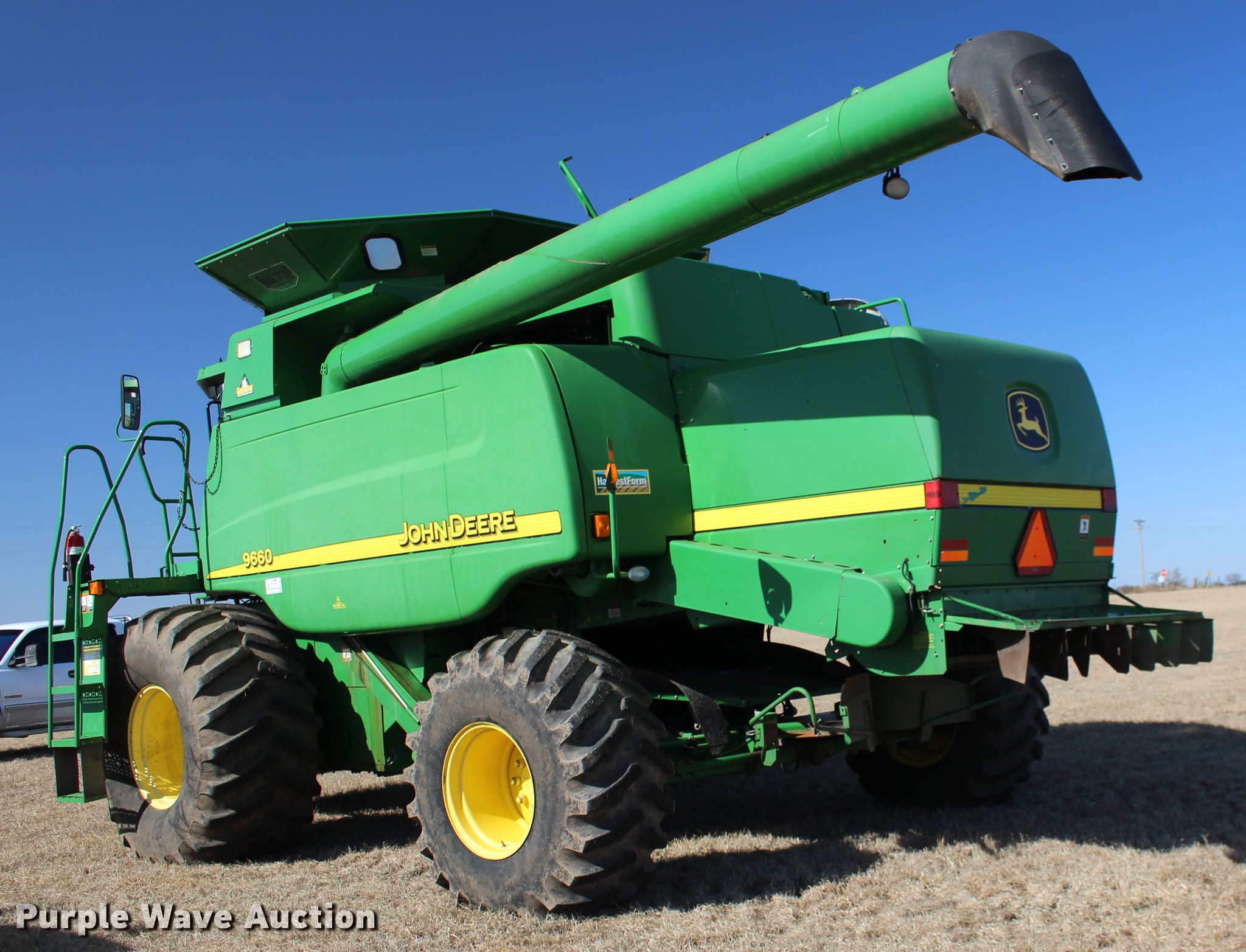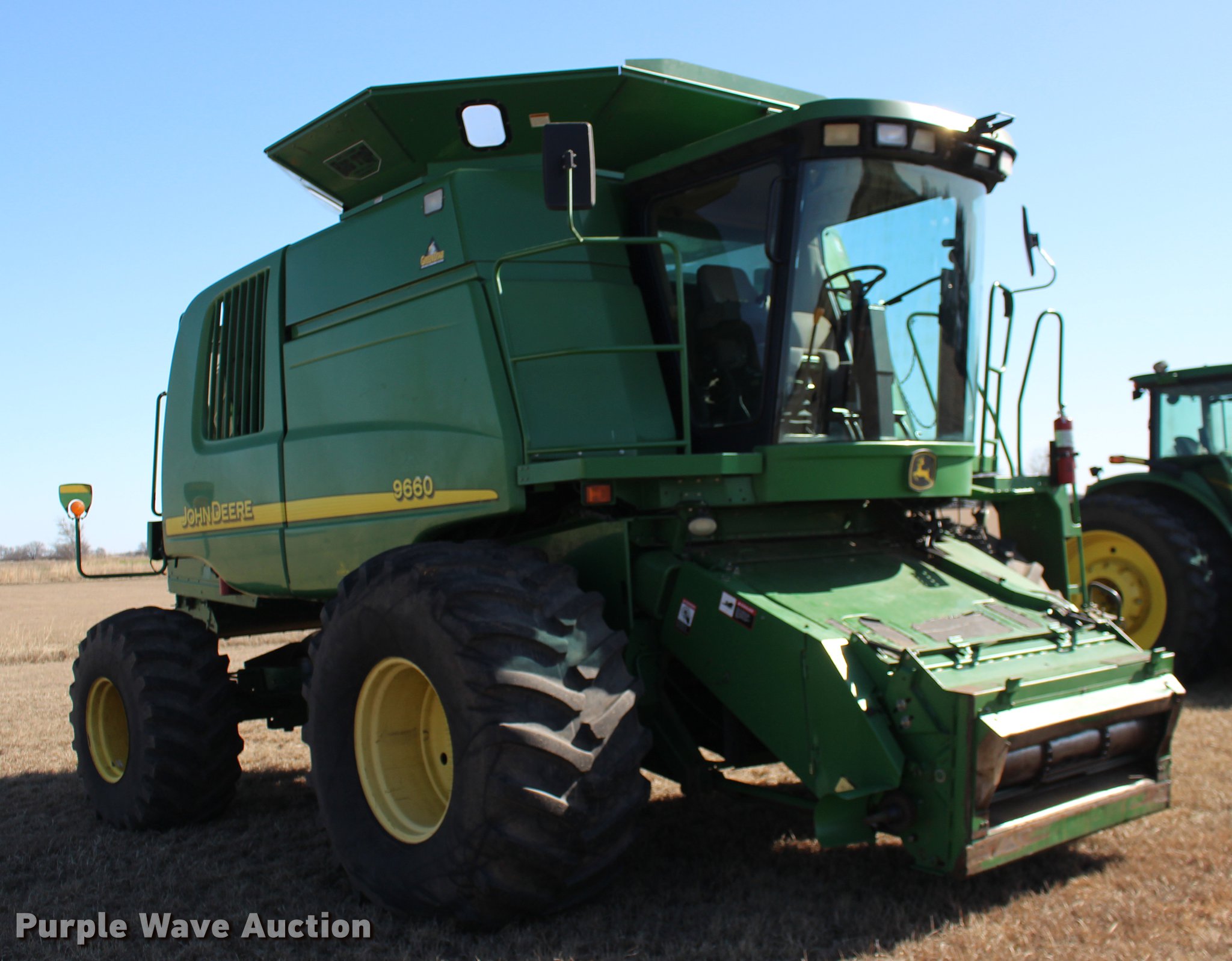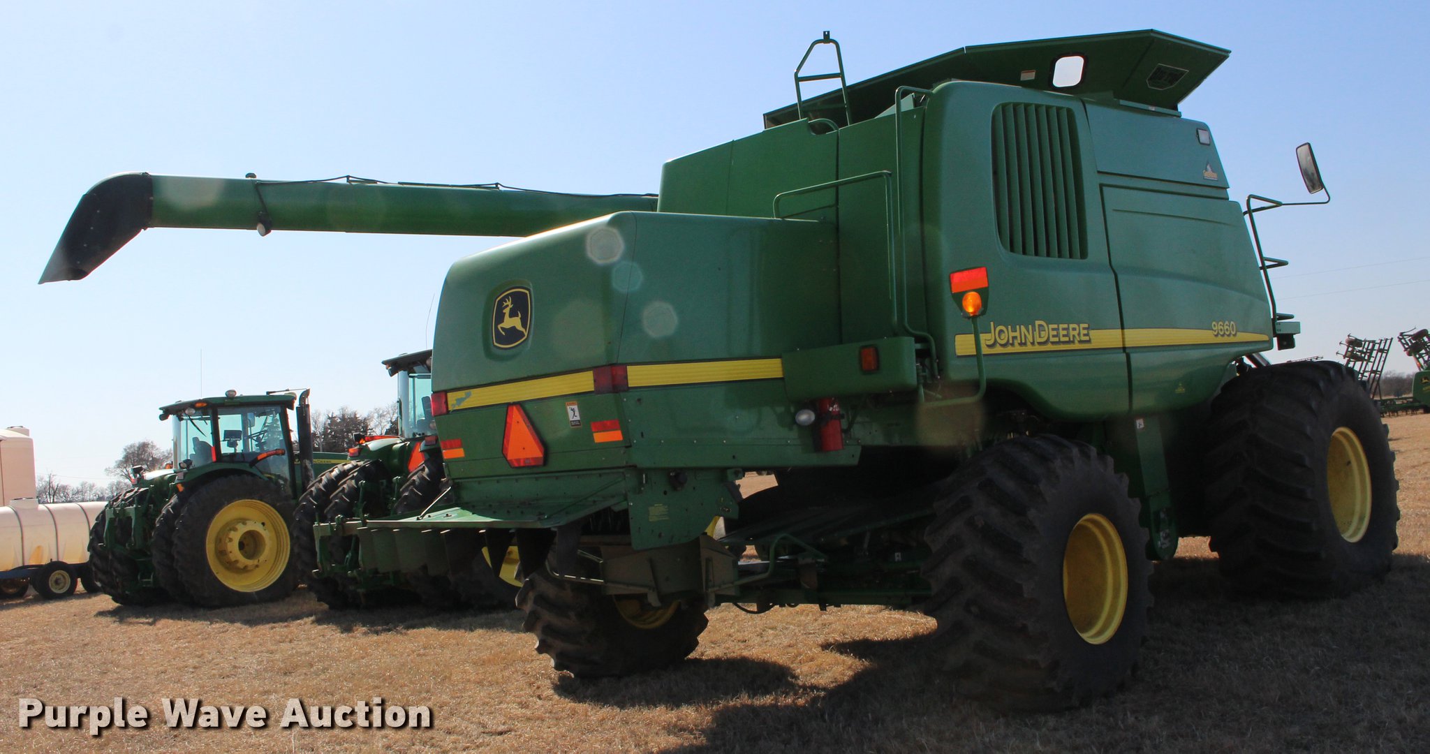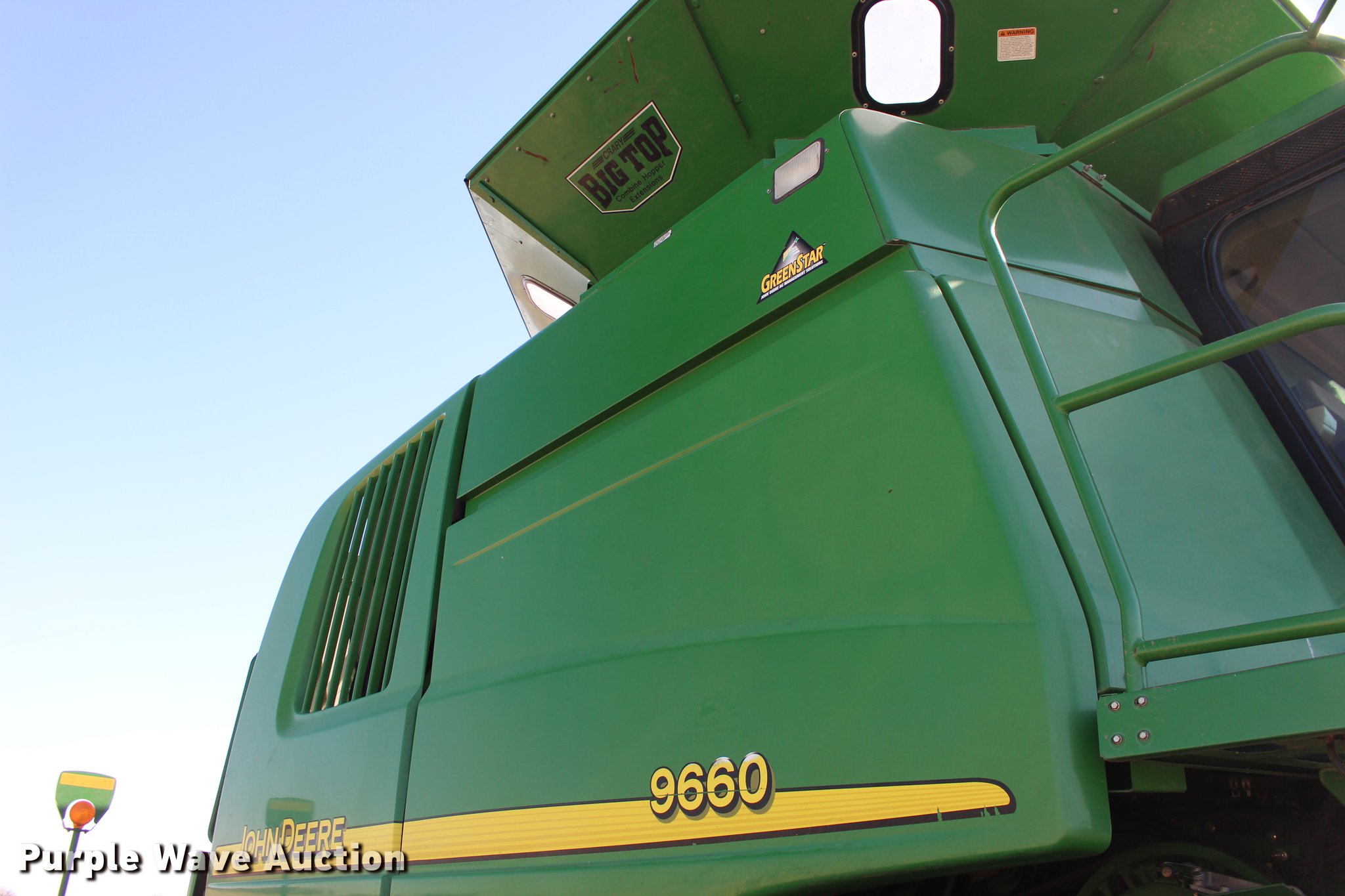 Purple Wave is selling a used Combine in Oklahoma. This item is a 2004 John Deere 9660 combine with the following: 3,703 engine hours on meter, 2,469 separator hours on meter, Six cylinder turbo diesel engine, Hydrostatic transmission, 3F-3R gears, AC and heat, Tilt steering wheel, AM/FM, Air suspension seat, Instructor's seat, Single point header coupler, Chaff spreader, Crary Big Top bin extensions, Work lights, GreenStar ready, 900/60R32 front tires, 28L-26 rear tires, Serial H09960W705335