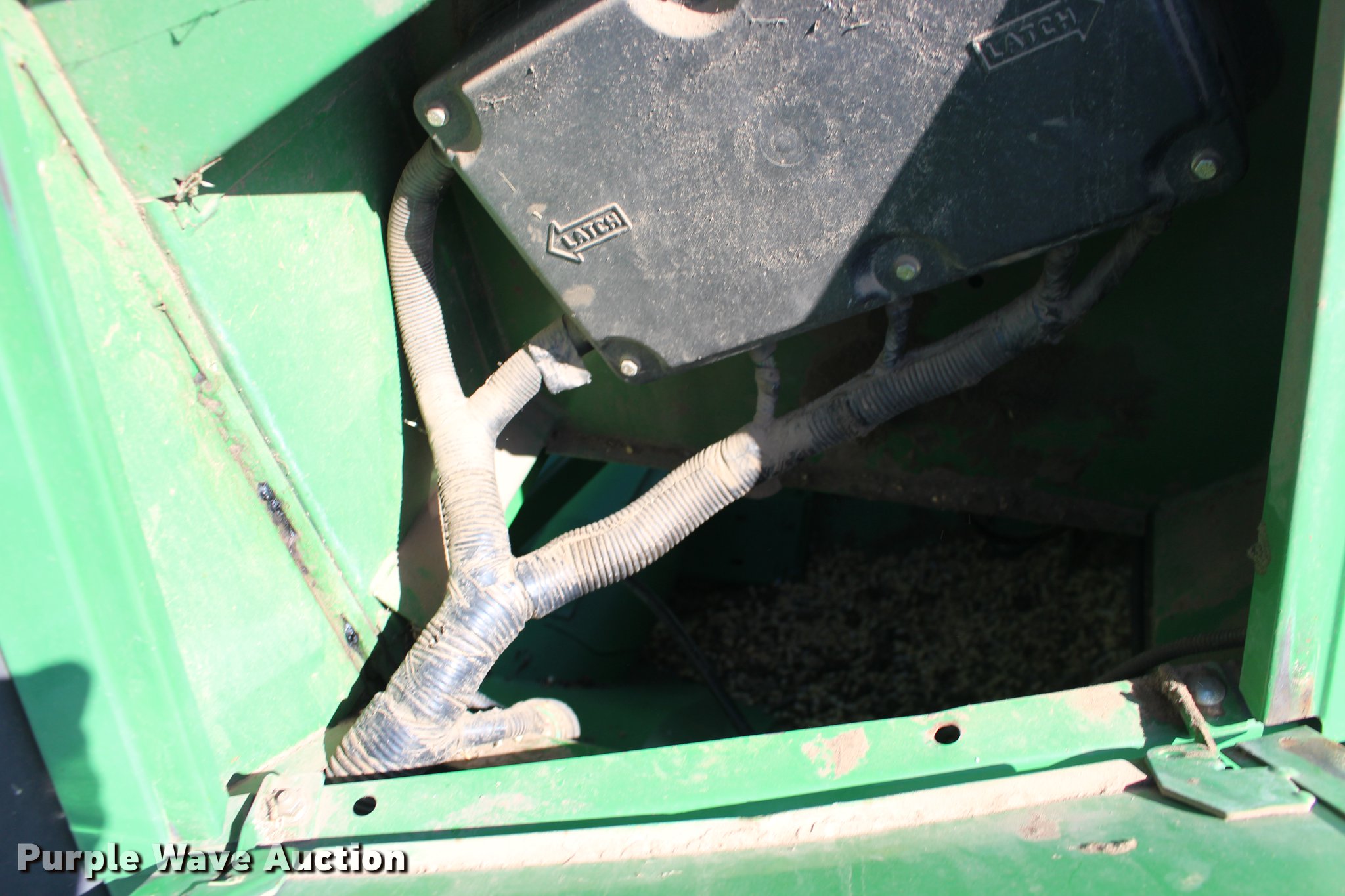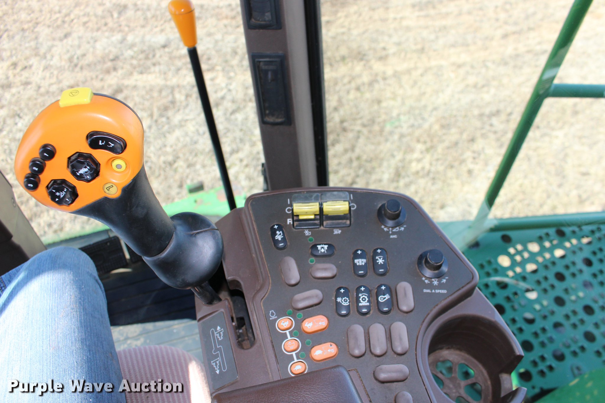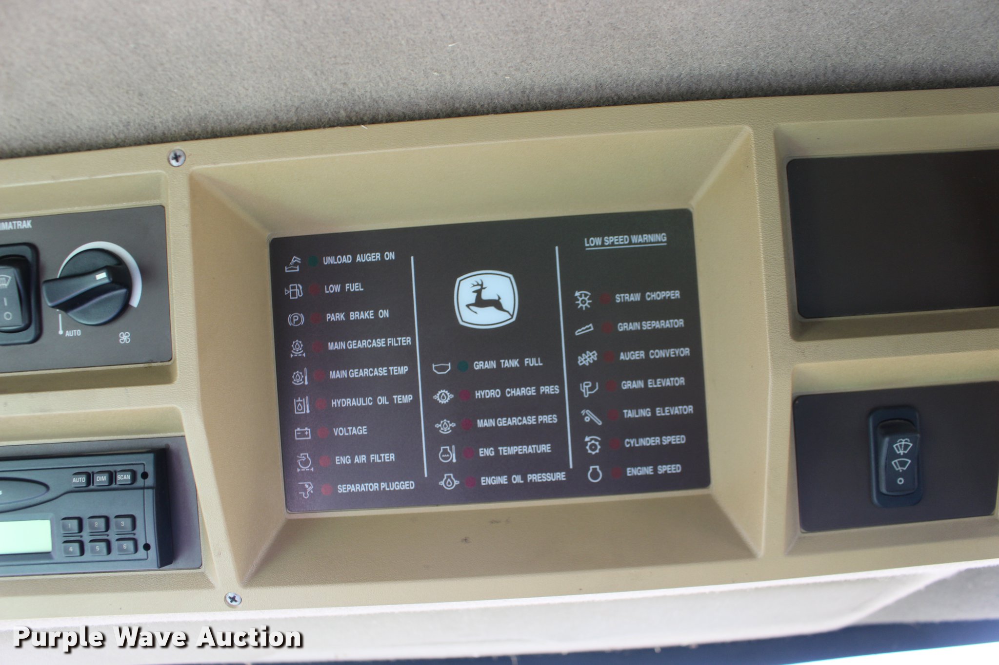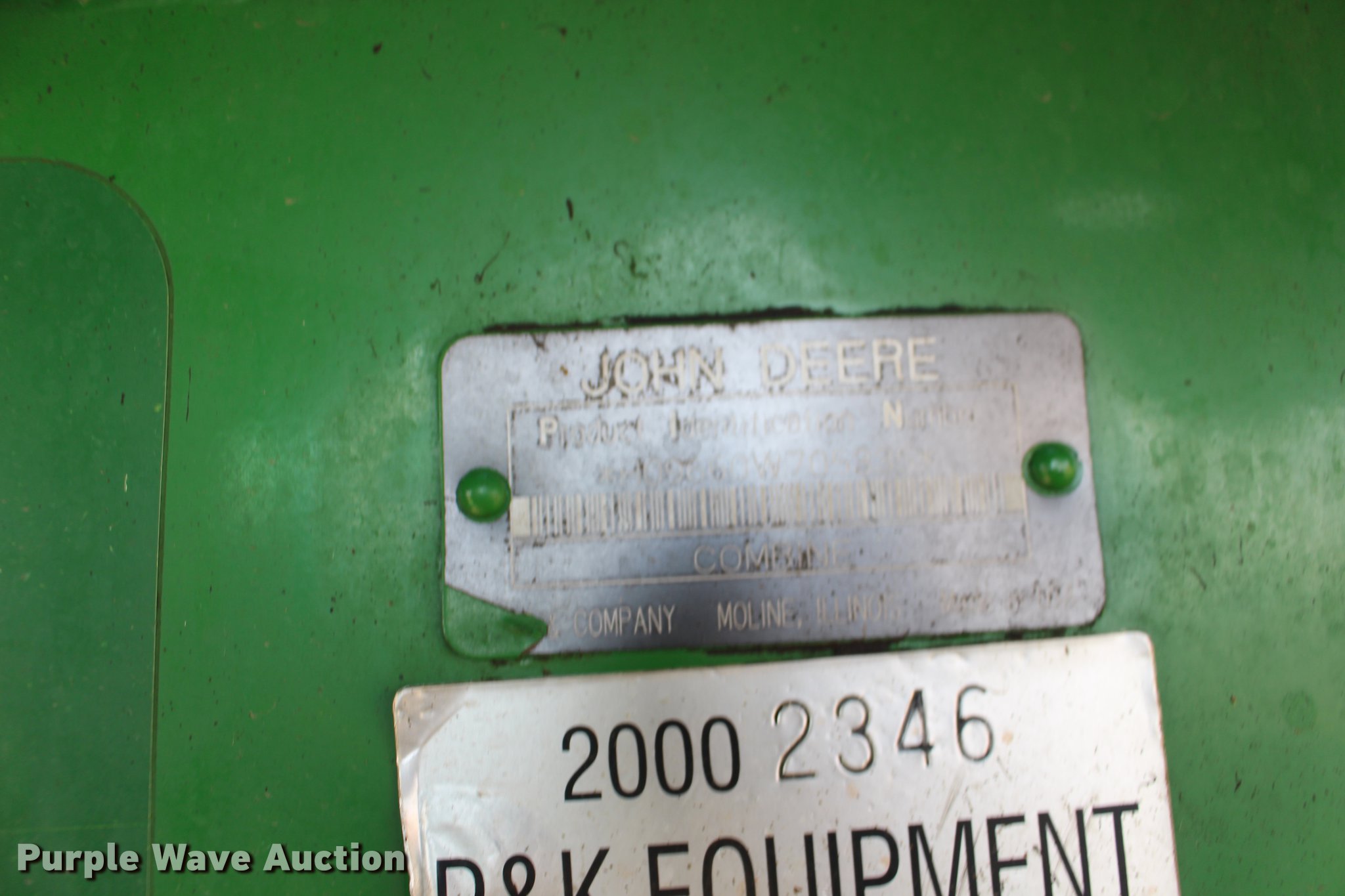 Purple Wave is selling a used Combine in Oklahoma. This item is a 2004 John Deere 9660 combine with the following: 3,703 engine hours on meter, 2,469 separator hours on meter, Six cylinder turbo diesel engine, Hydrostatic transmission, 3F-3R gears, AC and heat, Tilt steering wheel, AM/FM, Air suspension seat, Instructor's seat, Single point header coupler, Chaff spreader, Crary Big Top bin extensions, Work lights, GreenStar ready, 900/60R32 front tires, 28L-26 rear tires, Serial H09960W705335