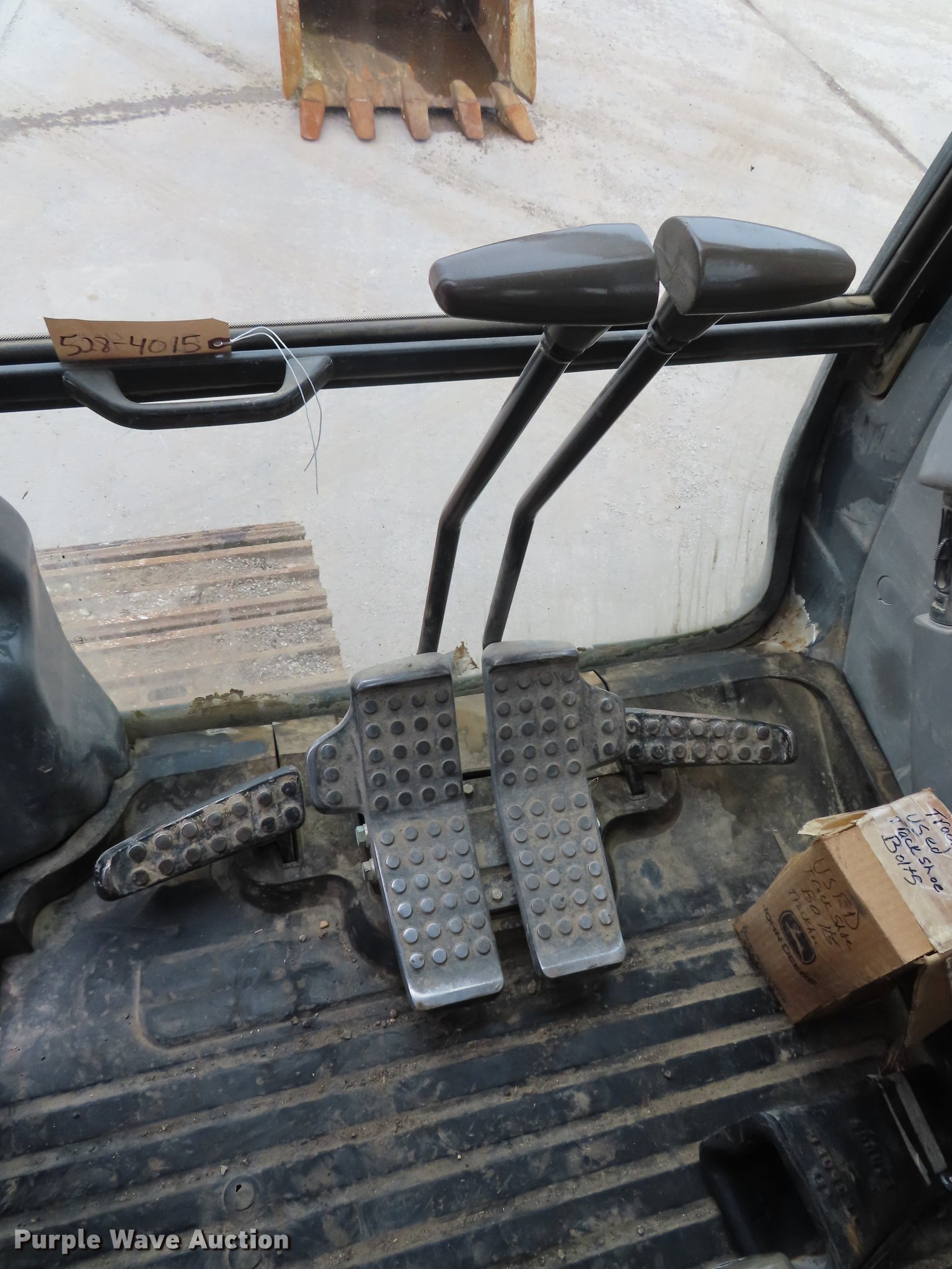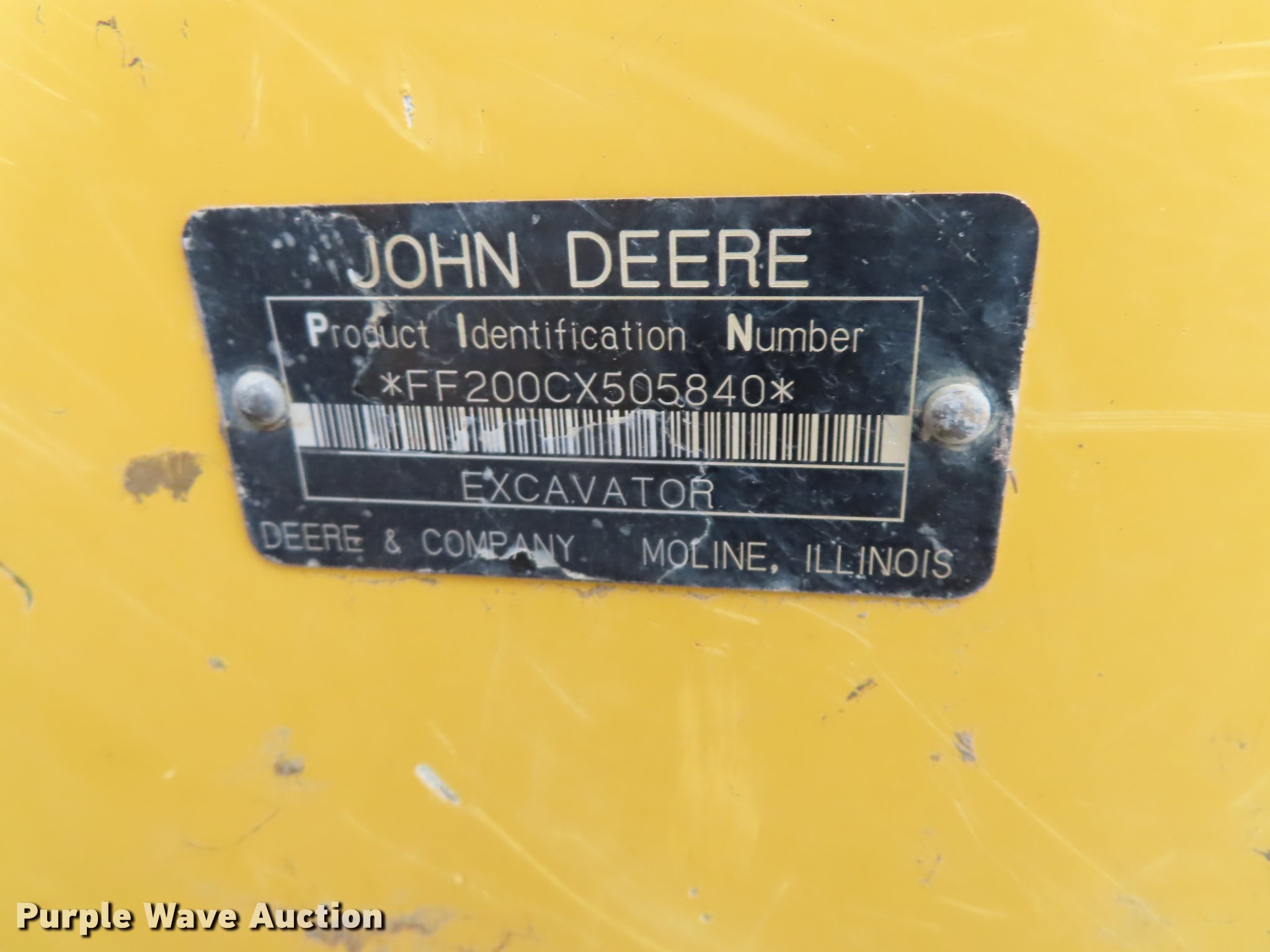 Purple Wave is selling a used Hydraulic Excavator in Kansas. This item is a 2005 John Deere 200C LC excavator with the following: 6,692 hours on meter, John Deere six cylinder turbo diesel engine, Two speed hydrostatic transmission, EROPS, AM/FM, Suspension seat, Wipers, Front work lights, Standard boom, John Deere 48"W bucket, Bolt-on cutting edge, (5) bolt-on teeth, 1.38 cu. yd. capacity, CF hydraulic quick coupler, 24"W steel triple grouser track pads, Bucket Pins PMS loose, Swing bearings loose, Serial FF200CX505840, KDOT ID 528-4015